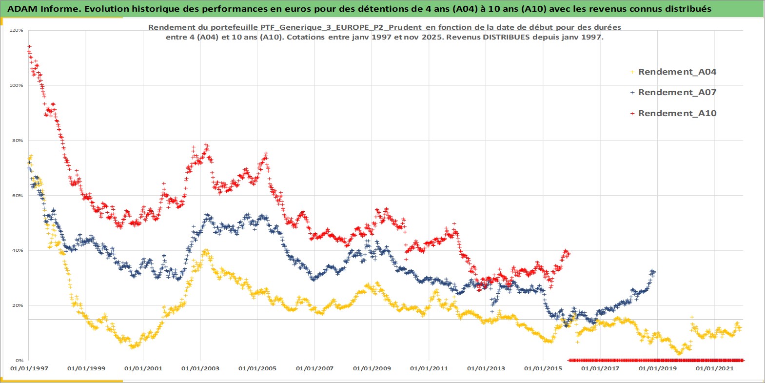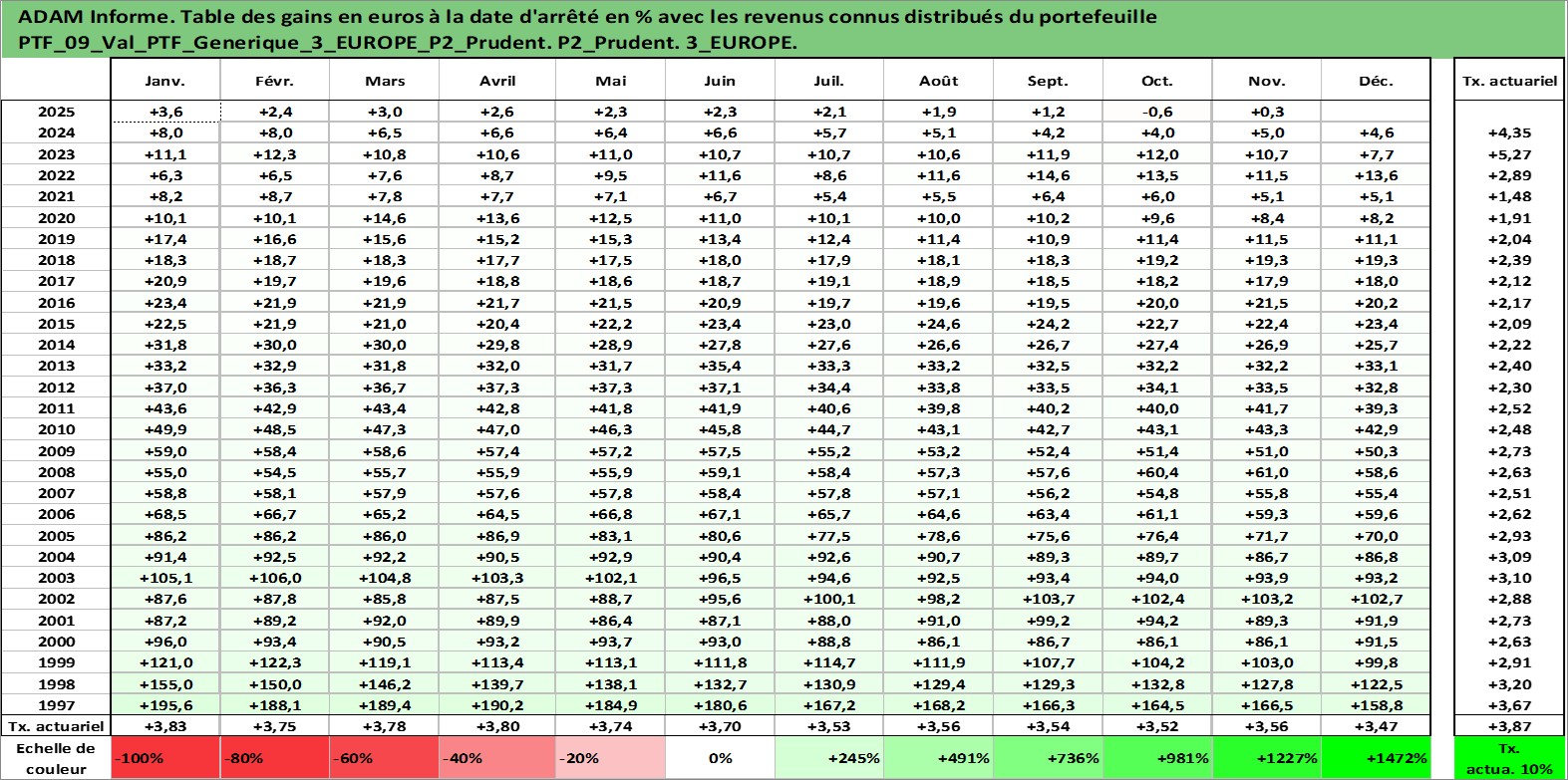Site dédié aux investisseursPage dédiée sur site financeAnalyse des valorisations hebdomadaires du portefeuille PTF_Generique_3_EUROPE_P2_Prudent_9actifs avec un profil P2_Prudent. Ce portefeuille est cote en EUR. Les valorisations couvrent les semaines 1997W01 a 2025W48. Les revenus de cet actif financier sont pris en compte depuis la semaine 1997W01. La note ESG de cet actif n'est pas connue.