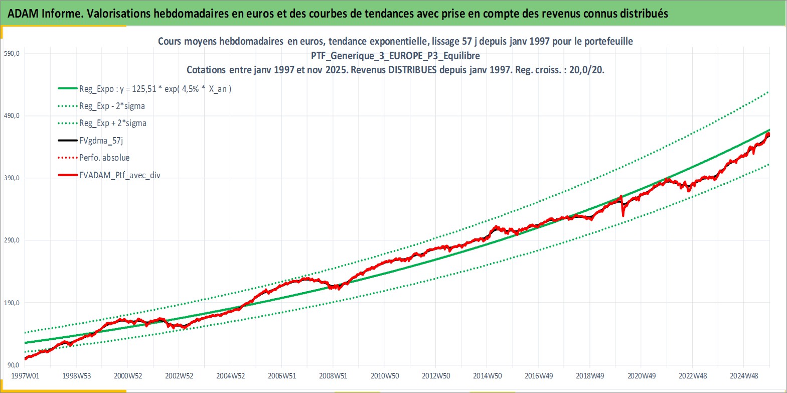Site dédié aux investisseursPage dédiée sur site financeAnalyse des valorisations hebdomadaires du portefeuille PTF_Generique_3_EUROPE_P3_Equilibre_9actifs avec un profil P3_Equilibre. Ce portefeuille est cote en EUR. Les valorisations couvrent les semaines 1997W01 a 2025W48. Les revenus de cet actif financier sont pris en compte depuis la semaine 1997W01. La note ESG de cet actif n'est pas connue.