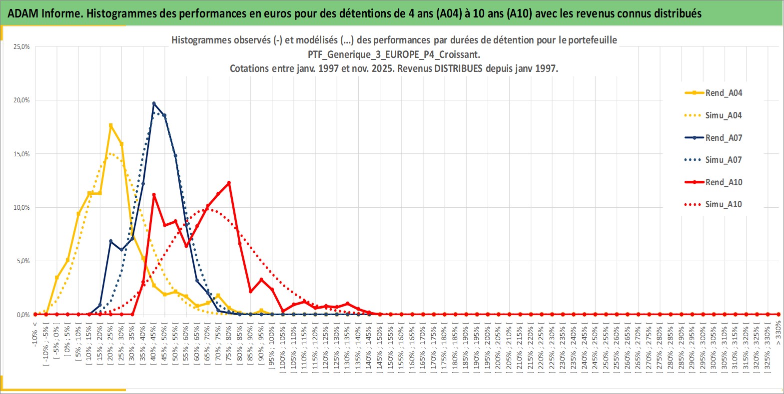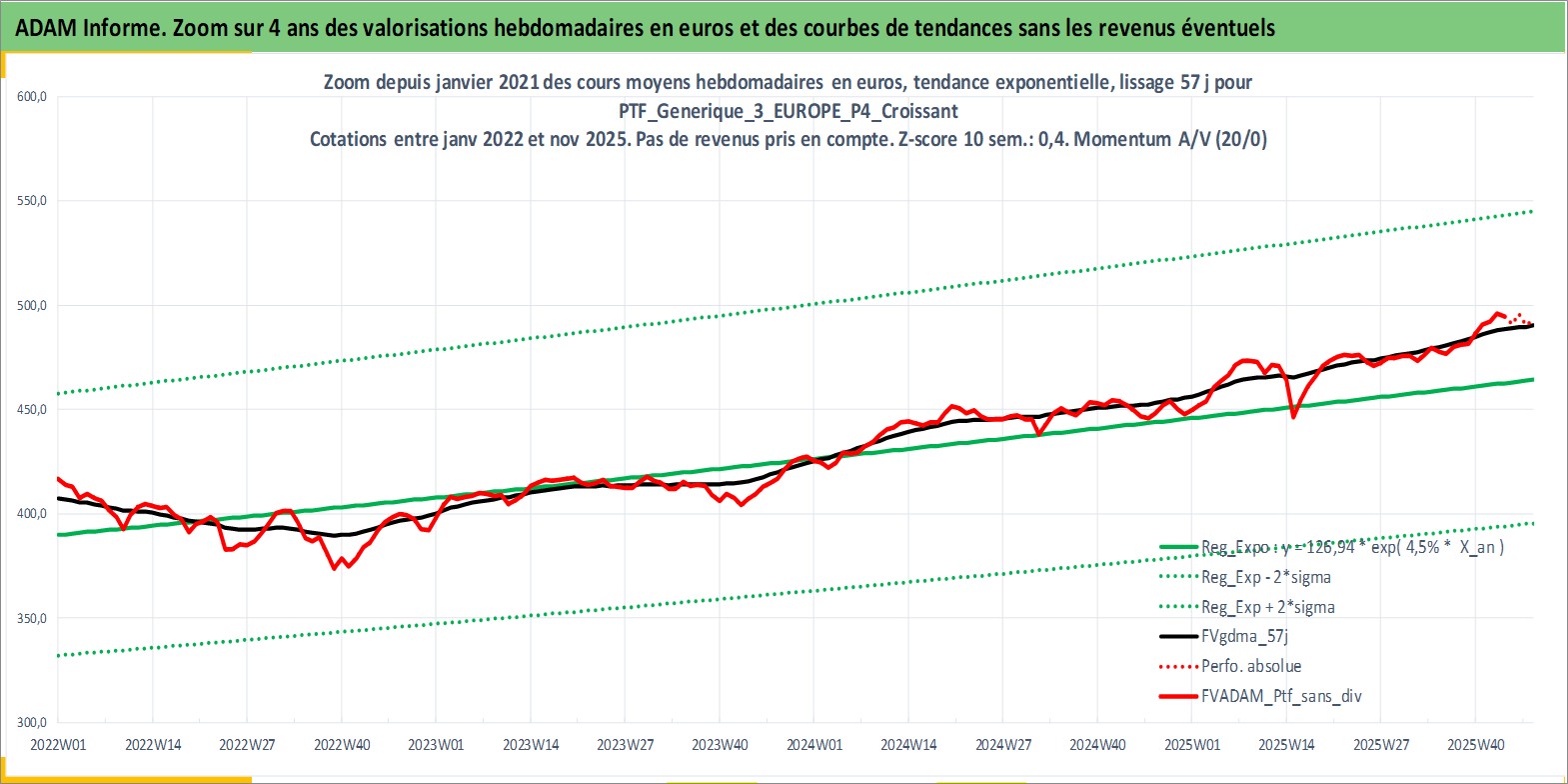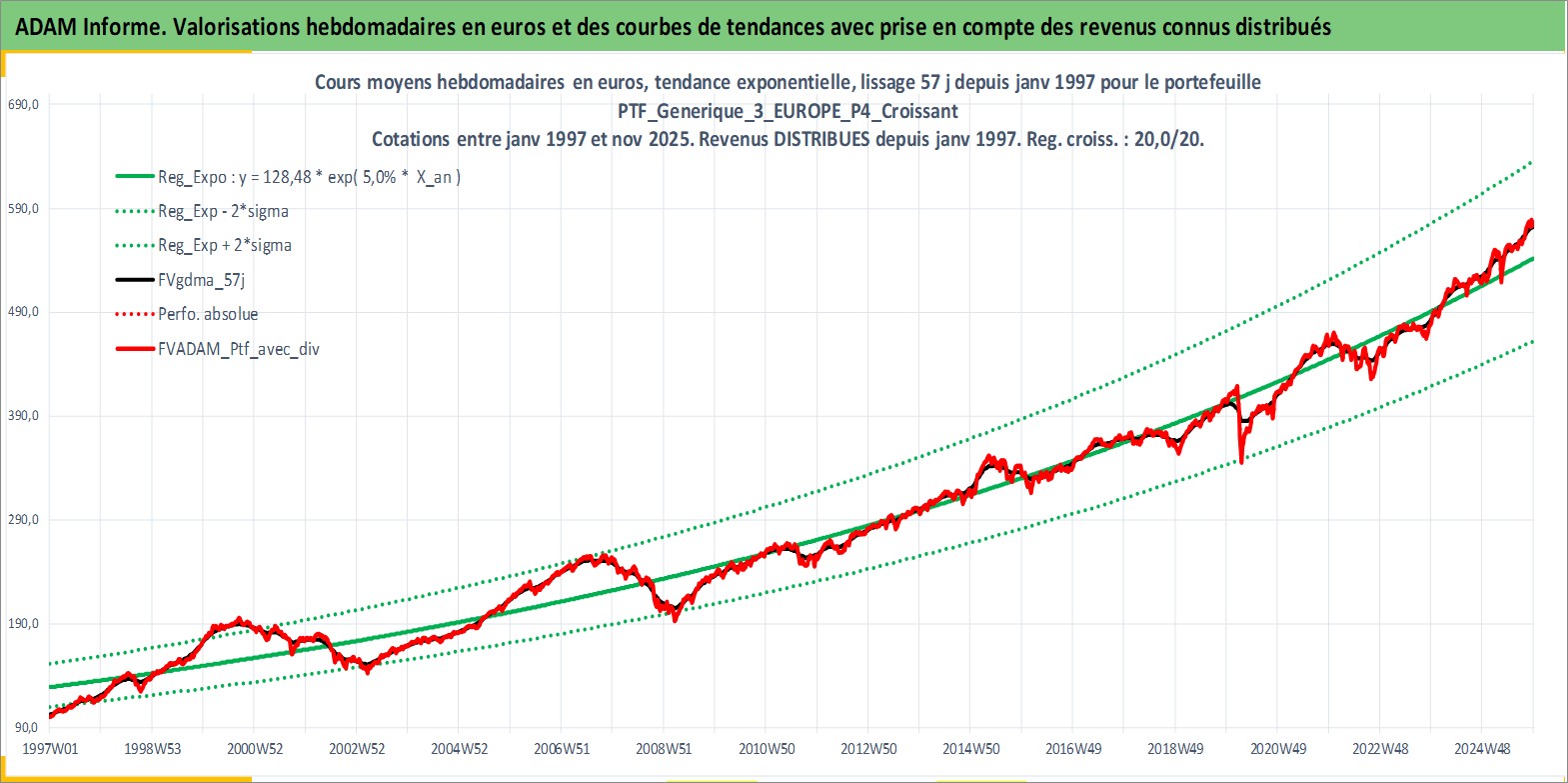 Site dédié aux investisseursPage dédiée sur site financeAnalyse des valorisations hebdomadaires du portefeuille PTF_Generique_3_EUROPE_P4_Croissant_9actifs avec un profil P4_Croissant. Ce portefeuille est cote en EUR. Les valorisations couvrent les semaines 1997W01 a 2025W48. Les revenus de cet actif financier sont pris en compte depuis la semaine 1997W01. La note ESG de cet actif n'est pas connue.