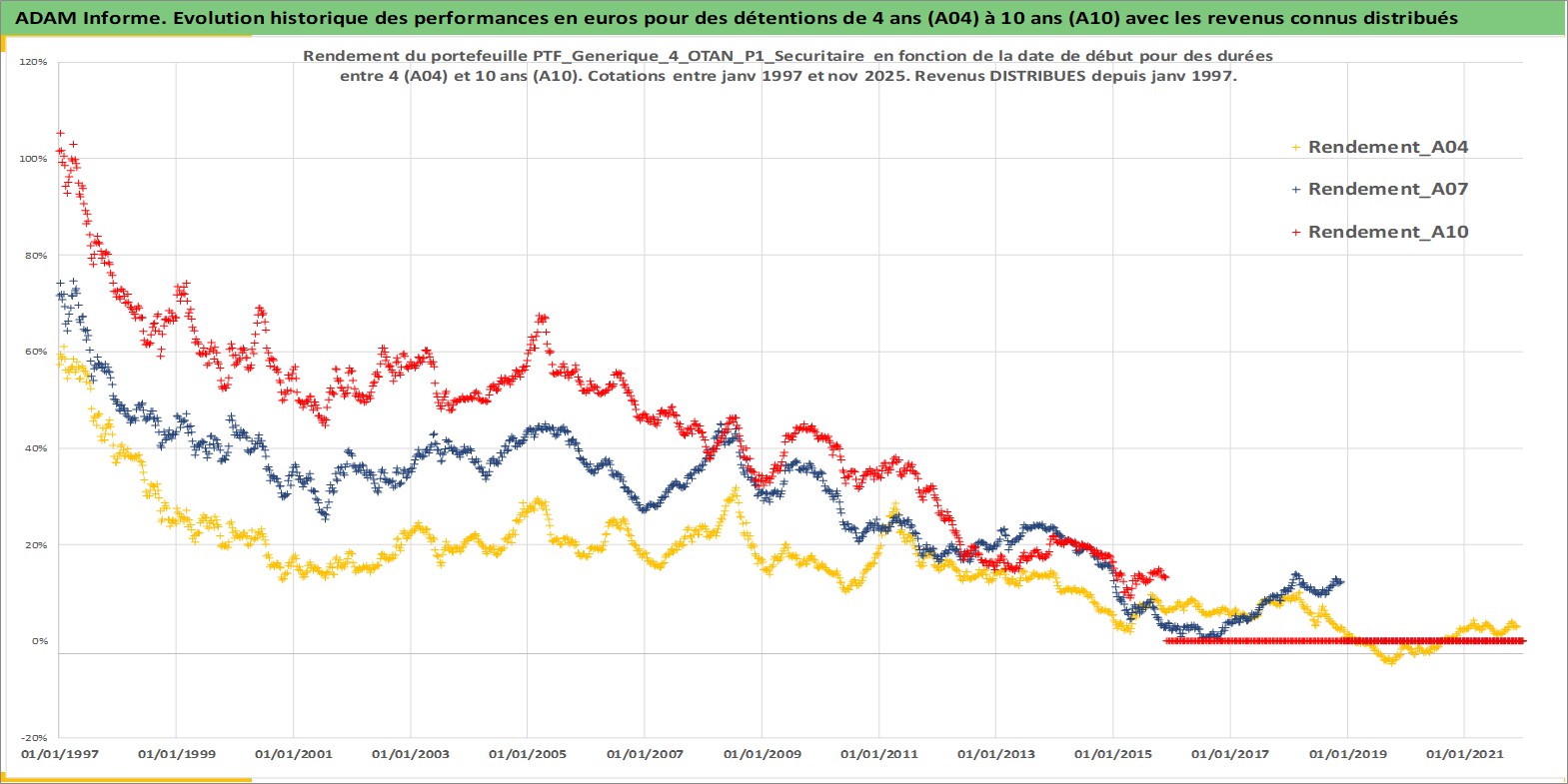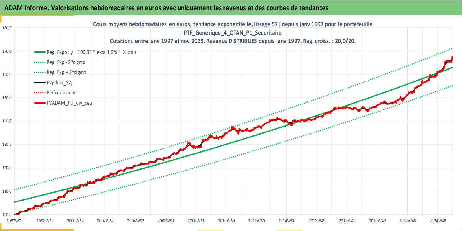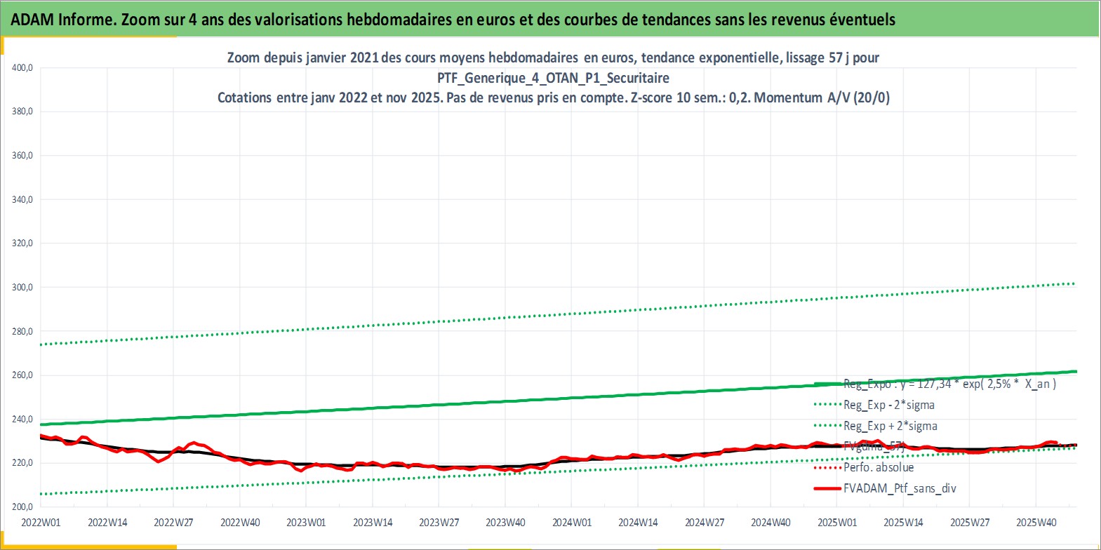 Site dédié aux investisseursPage dédiée sur site financeAnalyse des valorisations hebdomadaires du portefeuille PTF_Generique_4_OTAN_P1_Securitaire_12actifs avec un profil P1_Securitaire. Ce portefeuille est cote en EUR. Les valorisations couvrent les semaines 1997W01 a 2025W48. Les revenus de cet actif financier sont pris en compte depuis la semaine 1997W01. La note ESG de cet actif n'est pas connue.
