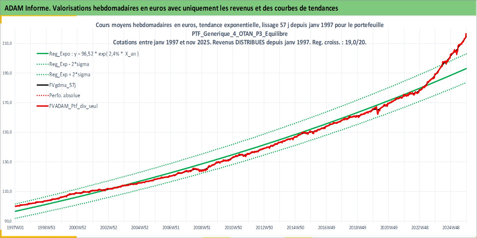 Site dédié aux investisseursPage dédiée sur site financeAnalyse des valorisations hebdomadaires du portefeuille PTF_Generique_4_OTAN_P3_Equilibre_12actifs avec un profil P3_Equilibre. Ce portefeuille est cote en EUR. Les valorisations couvrent les semaines 1997W01 a 2025W48. Les revenus de cet actif financier sont pris en compte depuis la semaine 1997W01. La note ESG de cet actif n'est pas connue.