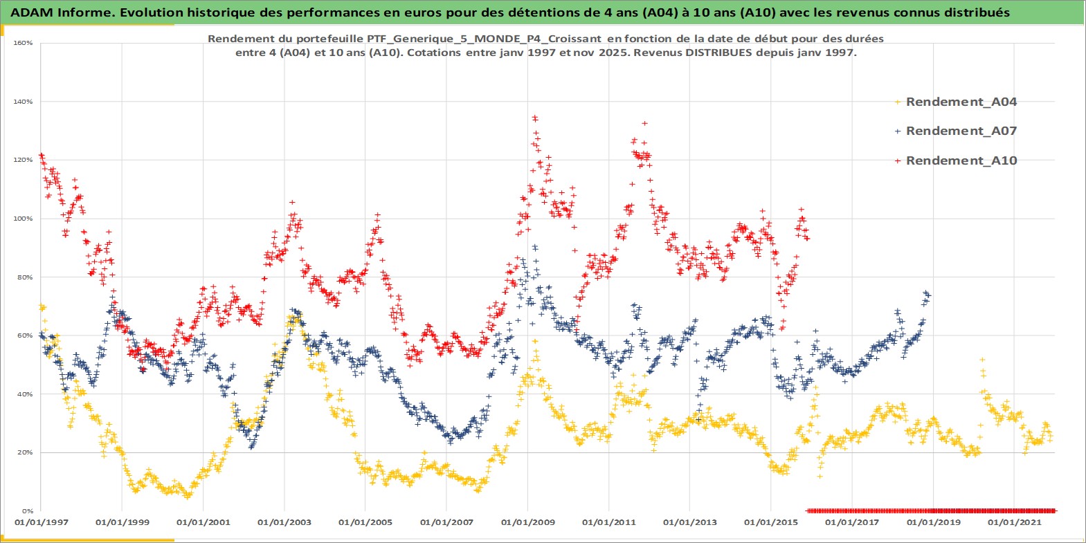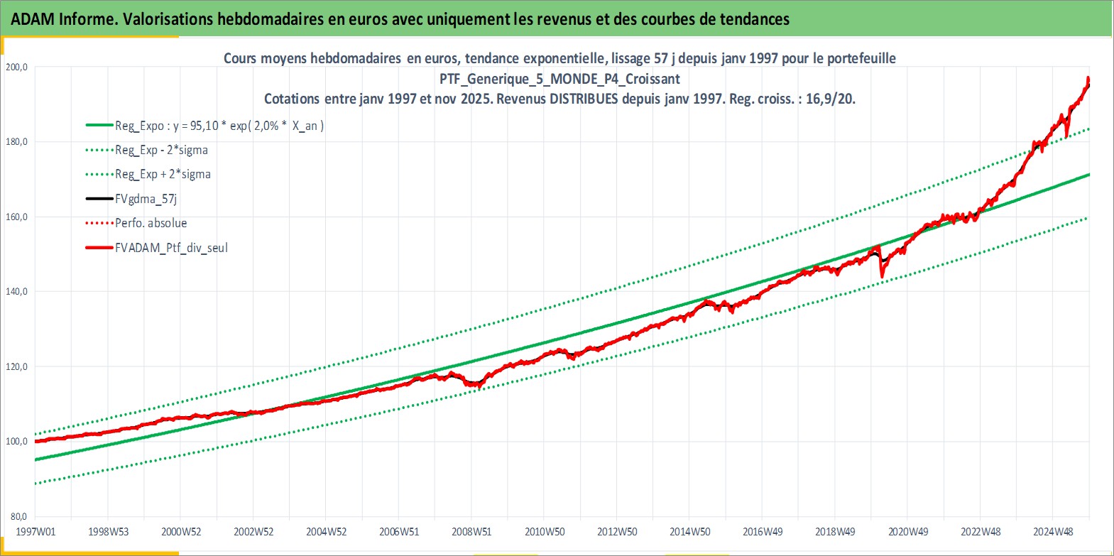Site dédié aux investisseursPage dédiée sur site financeAnalyse des valorisations hebdomadaires du portefeuille PTF_Generique_5_MONDE_P4_Croissant_12actifs avec un profil P4_Croissant. Ce portefeuille est cote en EUR. Les valorisations couvrent les semaines 1997W01 a 2025W48. Les revenus de cet actif financier sont pris en compte depuis la semaine 1997W01. La note ESG de cet actif n'est pas connue.