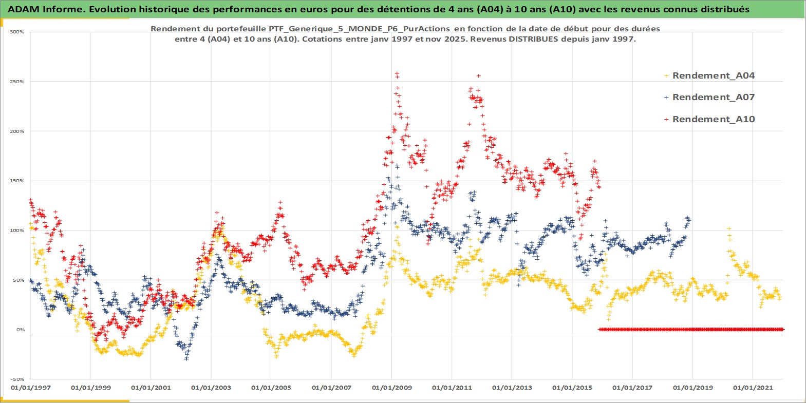 Site dédié aux investisseursPage dédiée sur site financeAnalyse des valorisations hebdomadaires du portefeuille PTF_Generique_5_MONDE_P6_PurActions_5actifs avec un profil P6_PurActions. Ce portefeuille est cote en EUR. Les valorisations couvrent les semaines 1997W01 a 2025W48. Les revenus de cet actif financier sont pris en compte depuis la semaine 1997W01. La note ESG de cet actif n'est pas connue.