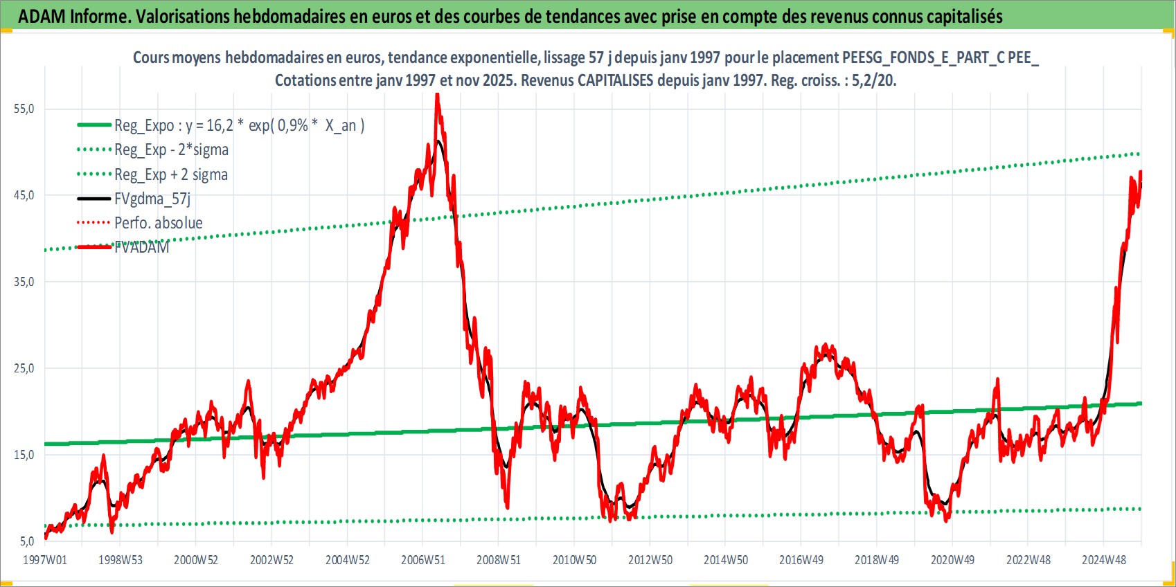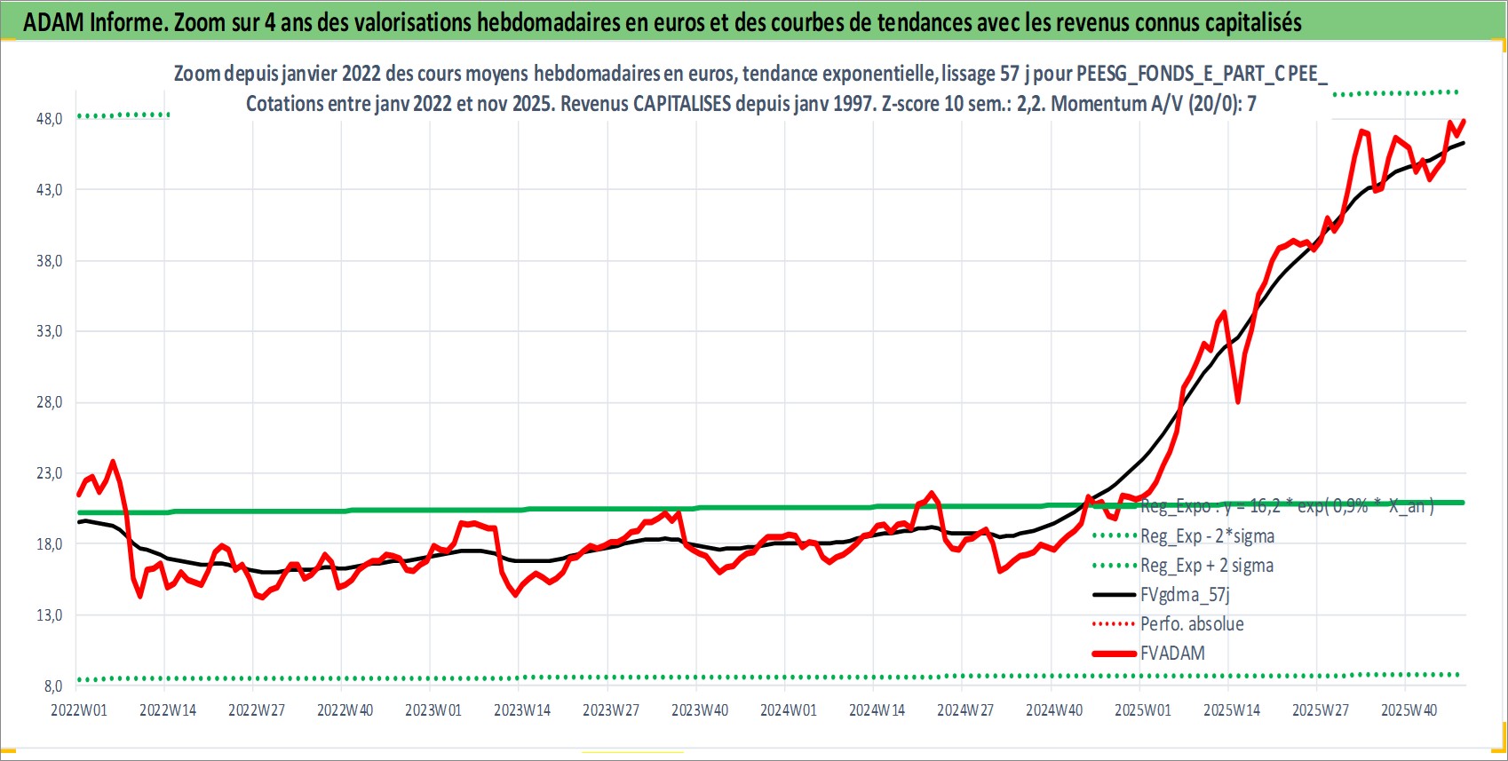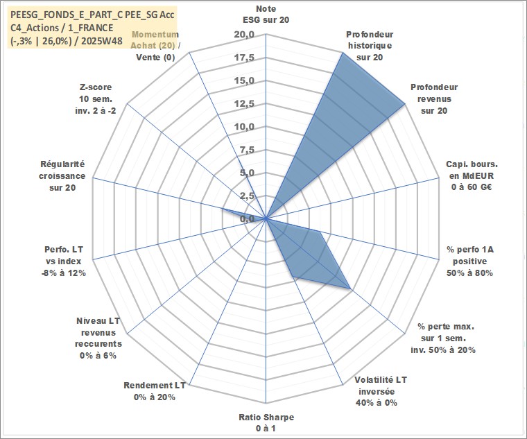 Site dédié aux investisseursPage dédiée sur site financeAnalyse des valorisations hebdomadaires du fonds PEESG_FONDS_E_PART_C PEE_SG Acc. Cet actif est cote en EUR. Les valorisations couvrent les semaines 1997W01 a 2025W48. Les revenus de cet actif financier sont pris en compte depuis la semaine 1997W01. La note ESG de cet actif n'est pas connue.