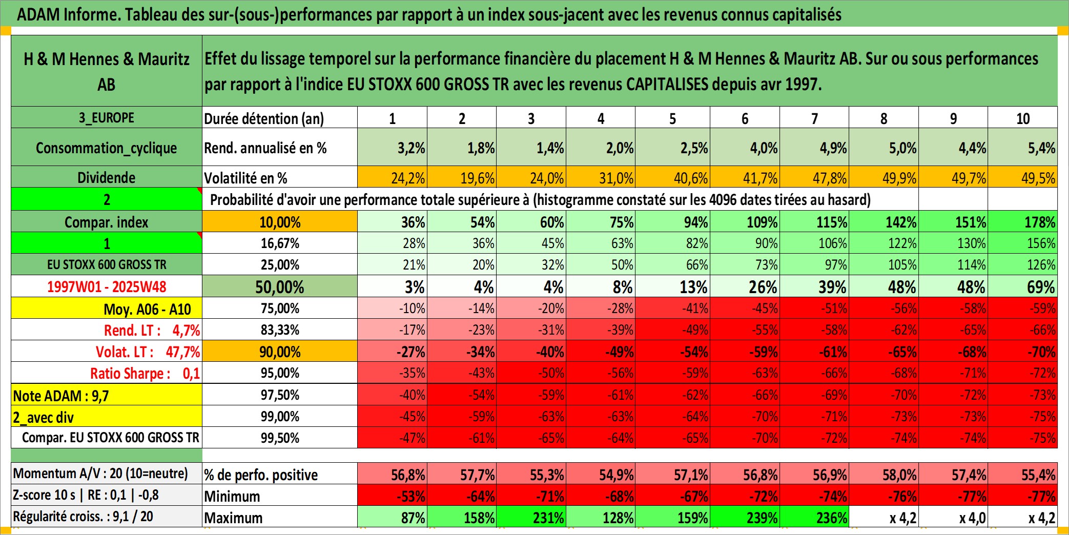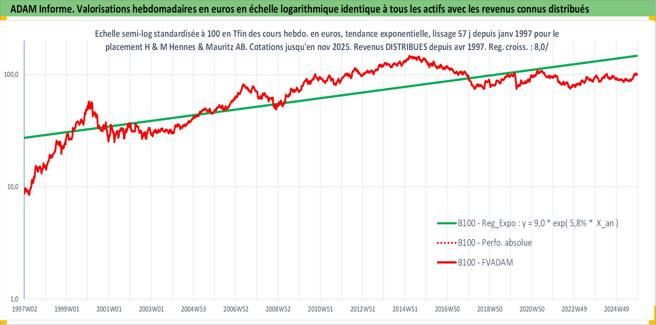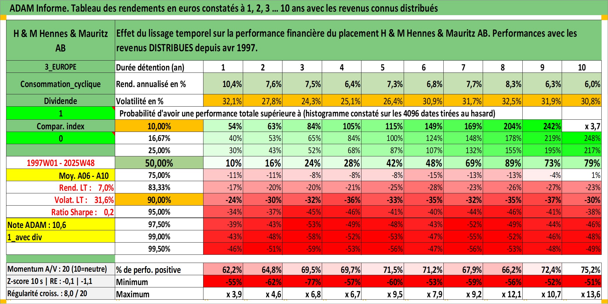 Site dédié aux investisseursPage dédiée sur site financeAnalyse des valorisations hebdomadaires de l'action H & M Hennes & Mauritz AB. Cet actif est cote en SEK. Les valorisations sont en contrevaleur EURO et couvrent les semaines 1997W01 a 2025W48. Les revenus de cet actif financier sont pris en compte depuis la semaine 1997W15. La note globale ESG de cet actif est estimee a 13.0 (apres rebasage entre 0 et 20).