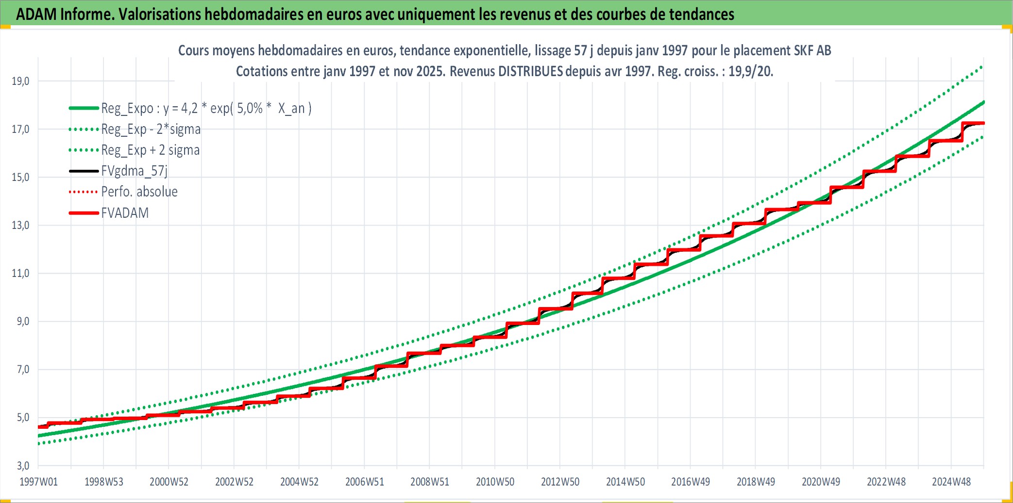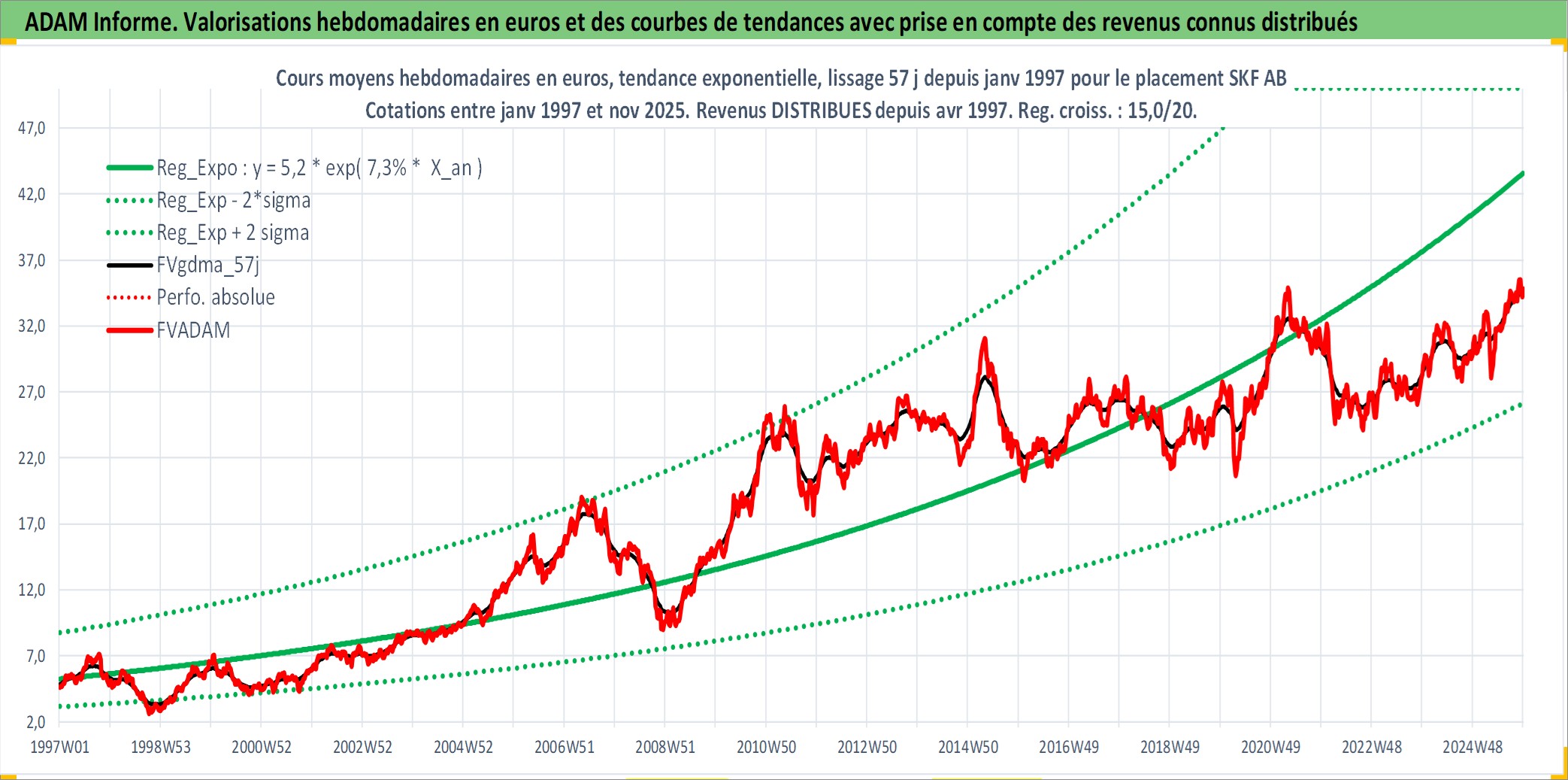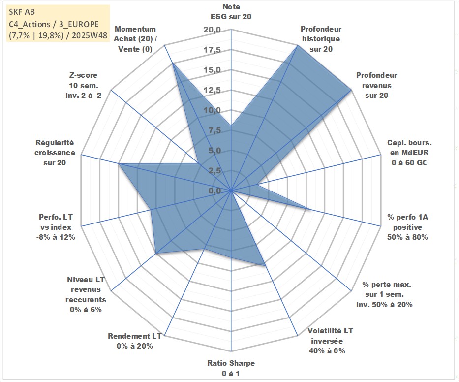 Site dédié aux investisseursPage dédiée sur site financeAnalyse des valorisations hebdomadaires de l'action SKF AB. Cet actif est cote en SEK. Les valorisations sont en contrevaleur EURO et couvrent les semaines 1997W01 a 2025W48. Les revenus de cet actif financier sont pris en compte depuis la semaine 1997W16. La note globale ESG de cet actif est estimee a 8.0 (apres rebasage entre 0 et 20).