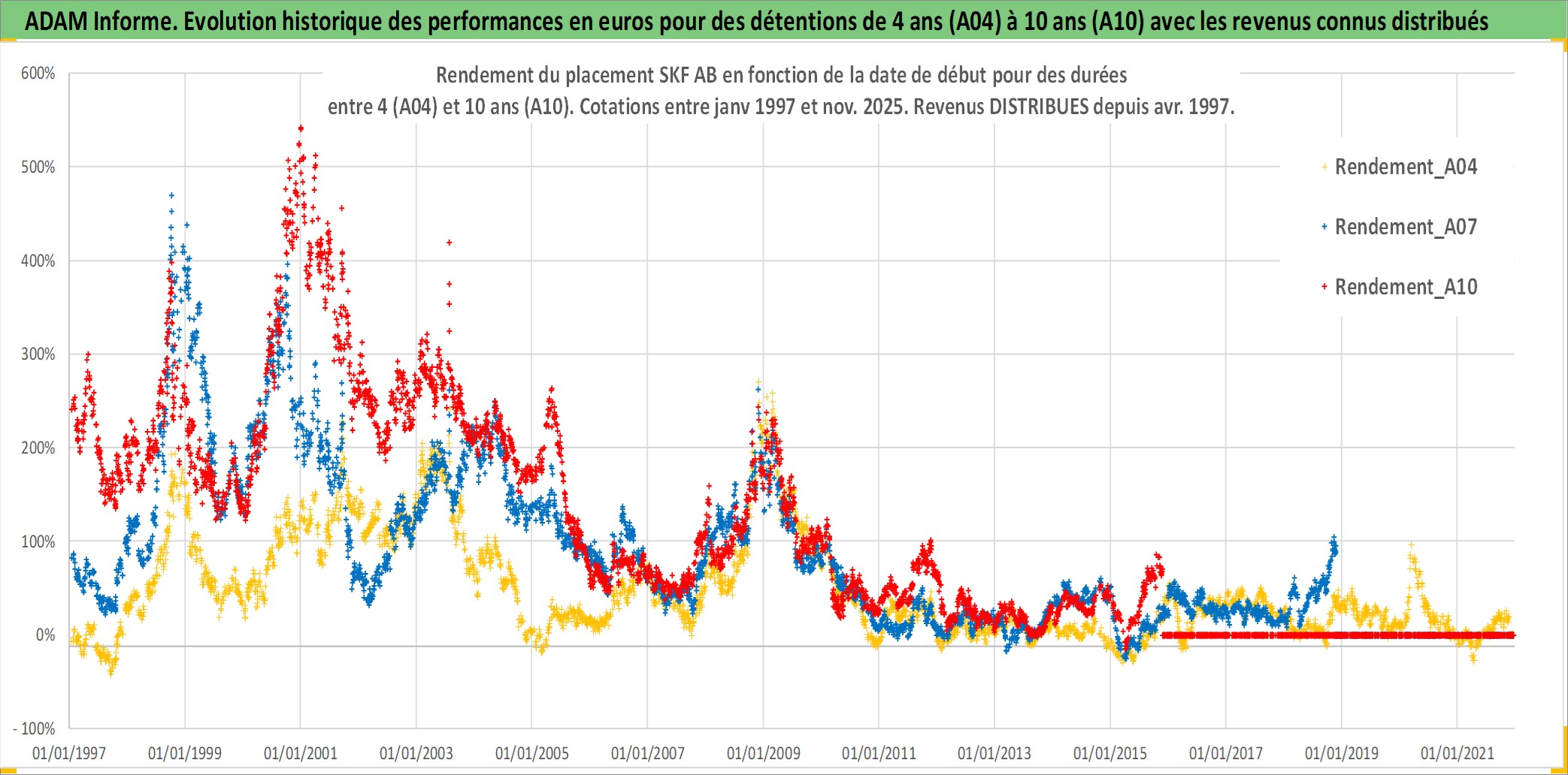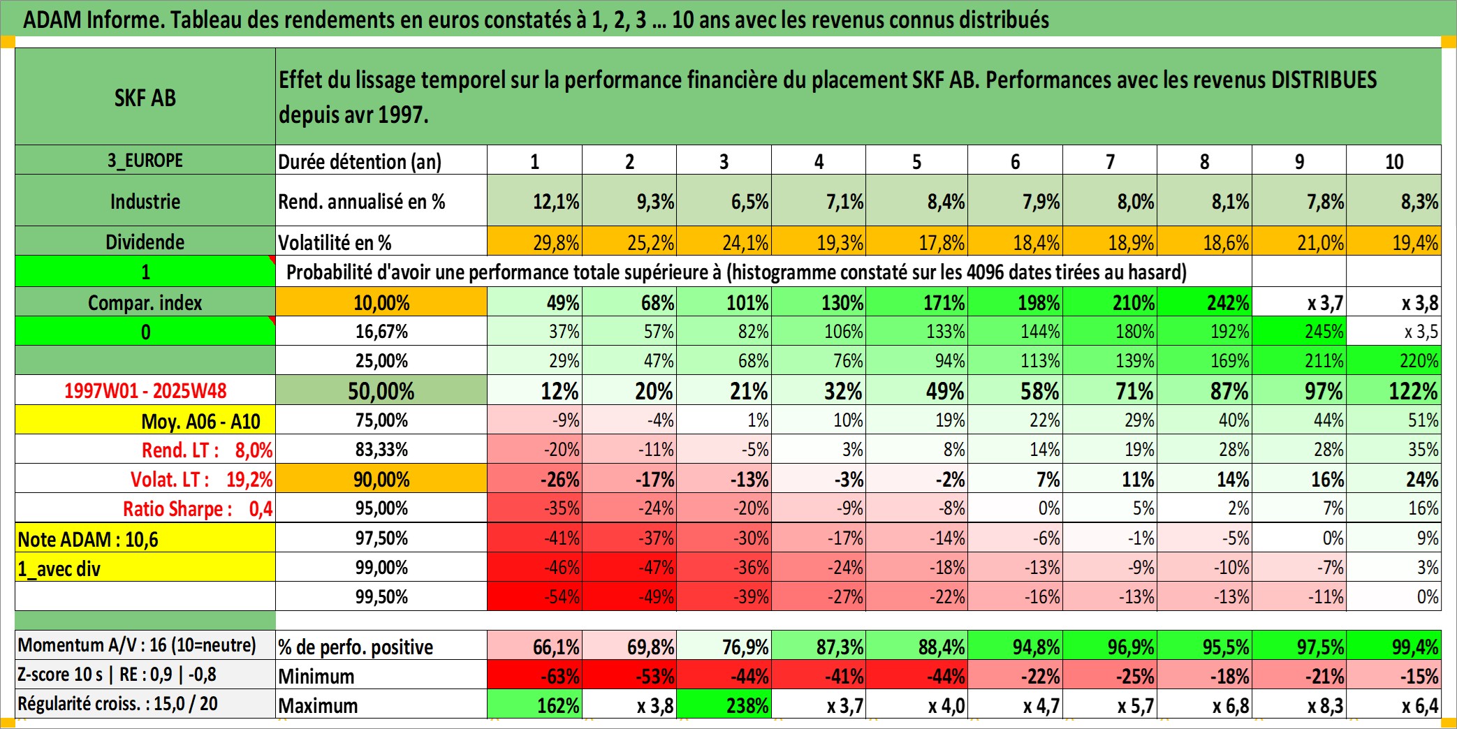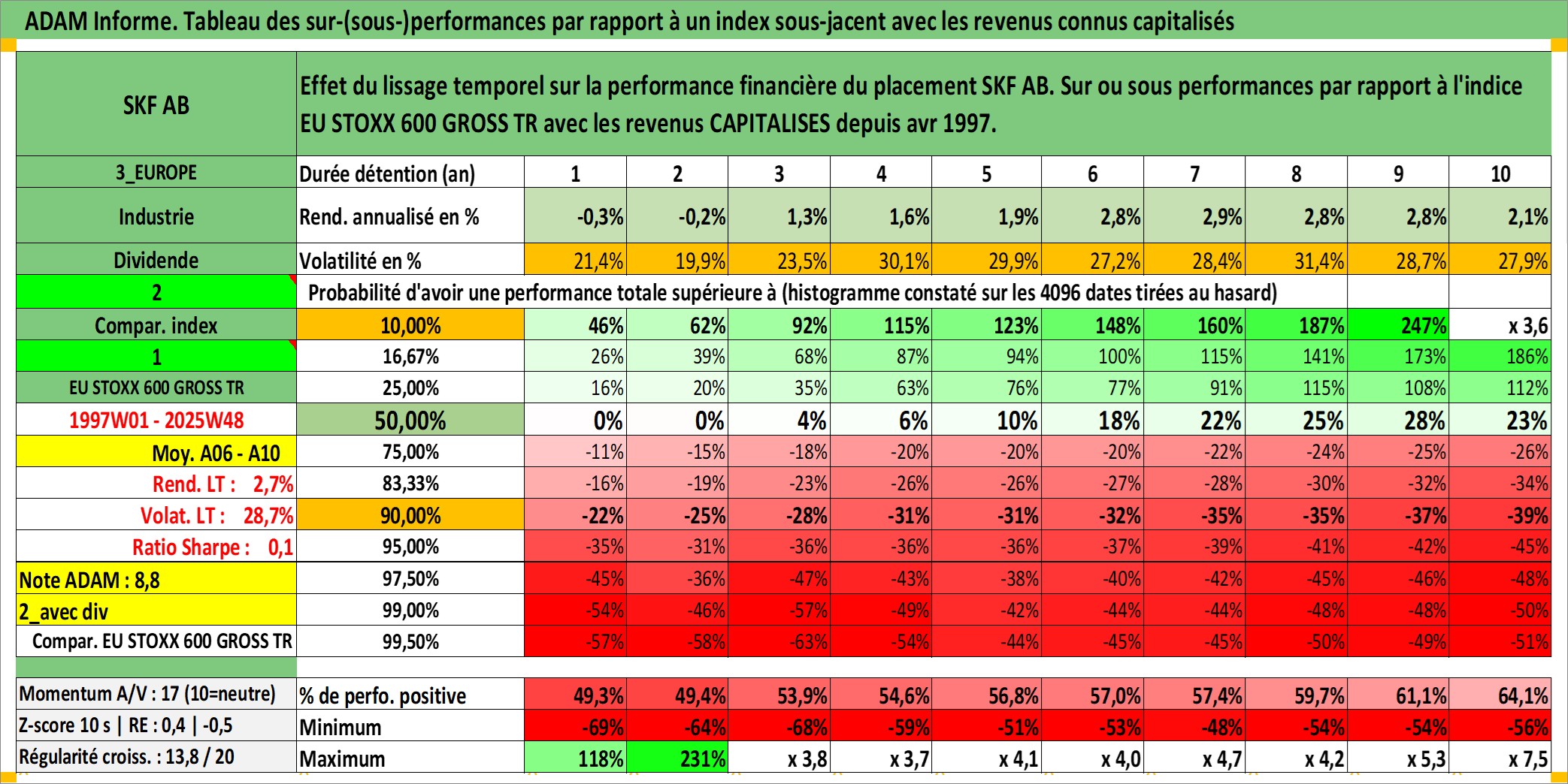 Site dédié aux investisseursPage dédiée sur site financeAnalyse des valorisations hebdomadaires de l'action SKF AB. Cet actif est cote en SEK. Les valorisations sont en contrevaleur EURO et couvrent les semaines 1997W01 a 2025W48. Les revenus de cet actif financier sont pris en compte depuis la semaine 1997W16. La note globale ESG de cet actif est estimee a 8.0 (apres rebasage entre 0 et 20).