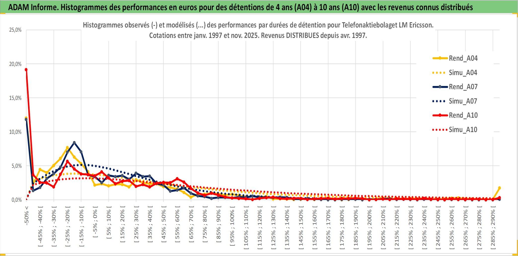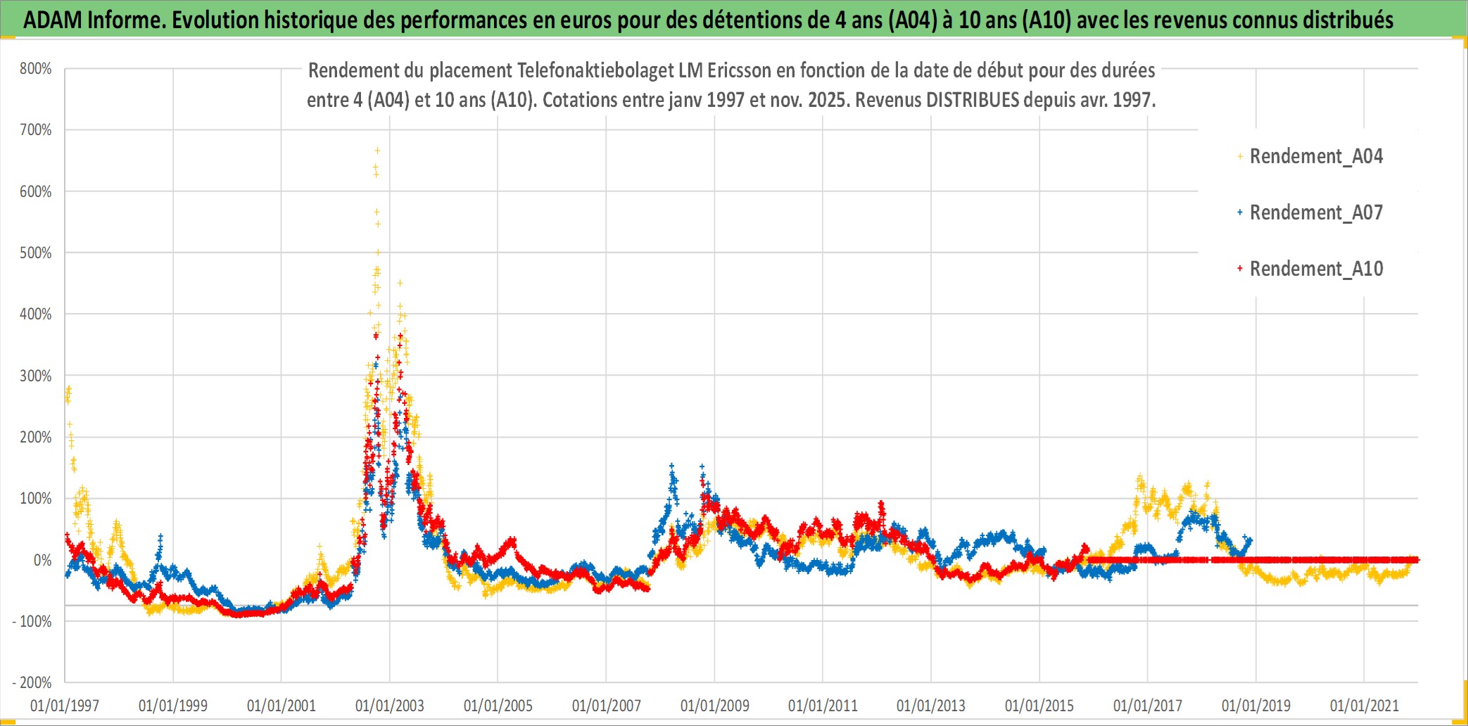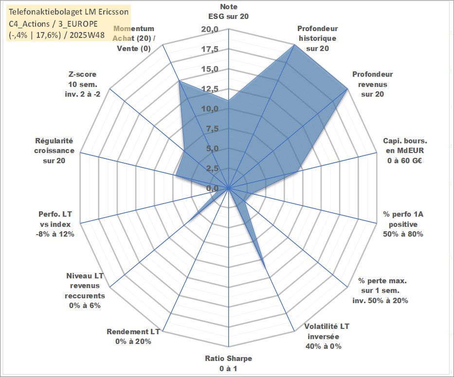 Site dédié aux investisseursPage dédiée sur site financeAnalyse des valorisations hebdomadaires de l'action Telefonaktiebolaget LM Ericsson. Cet actif est cote en SEK. Les valorisations sont en contrevaleur EURO et couvrent les semaines 1997W01 a 2025W48. Les revenus de cet actif financier sont pris en compte depuis la semaine 1997W18. La note globale ESG de cet actif est estimee a 11.0 (apres rebasage entre 0 et 20).
