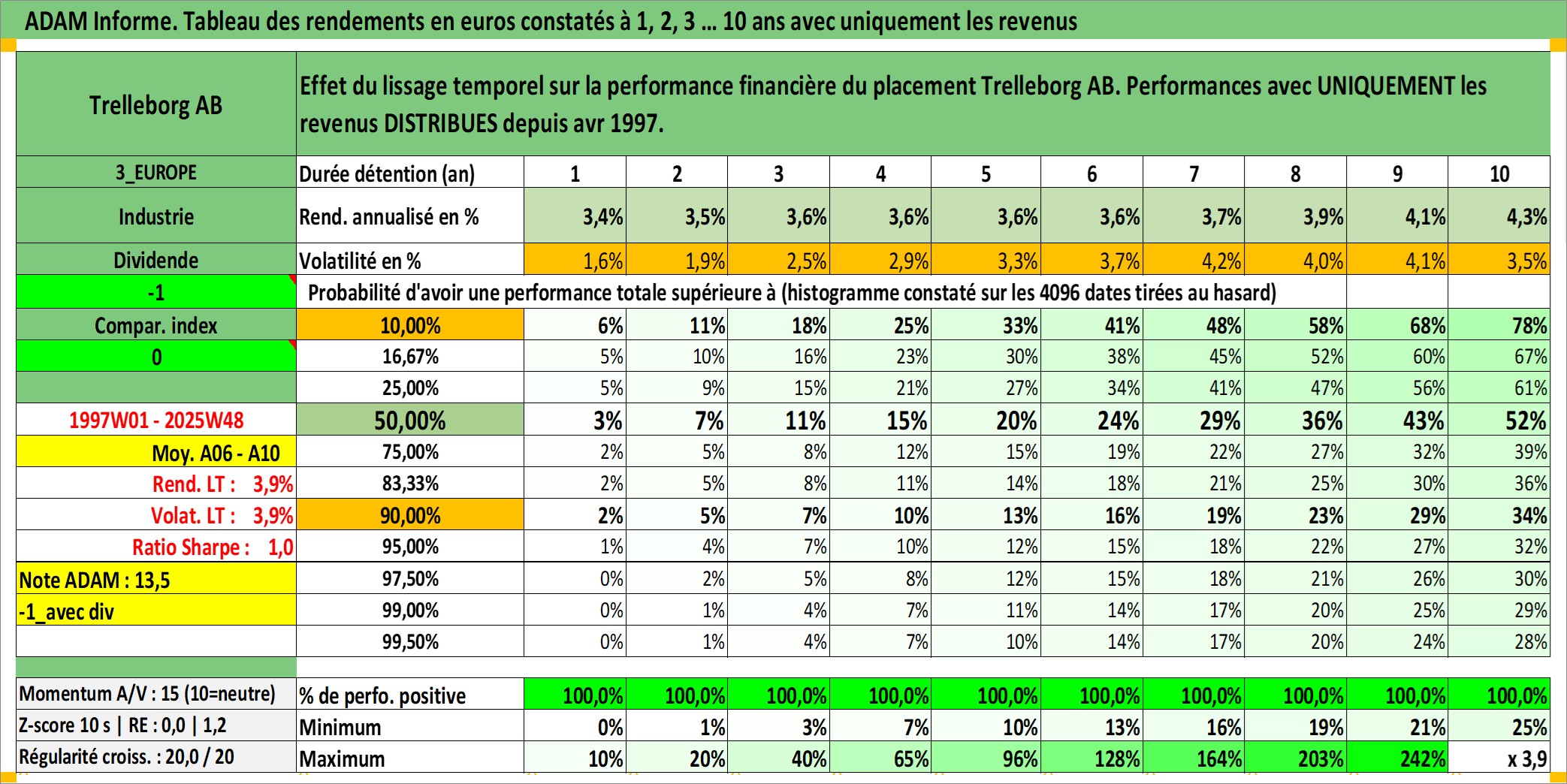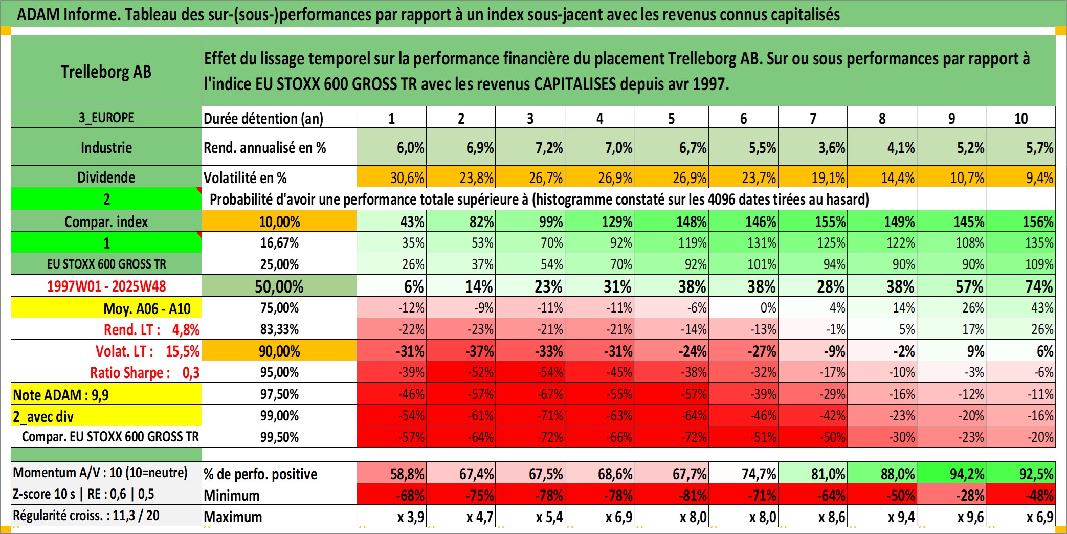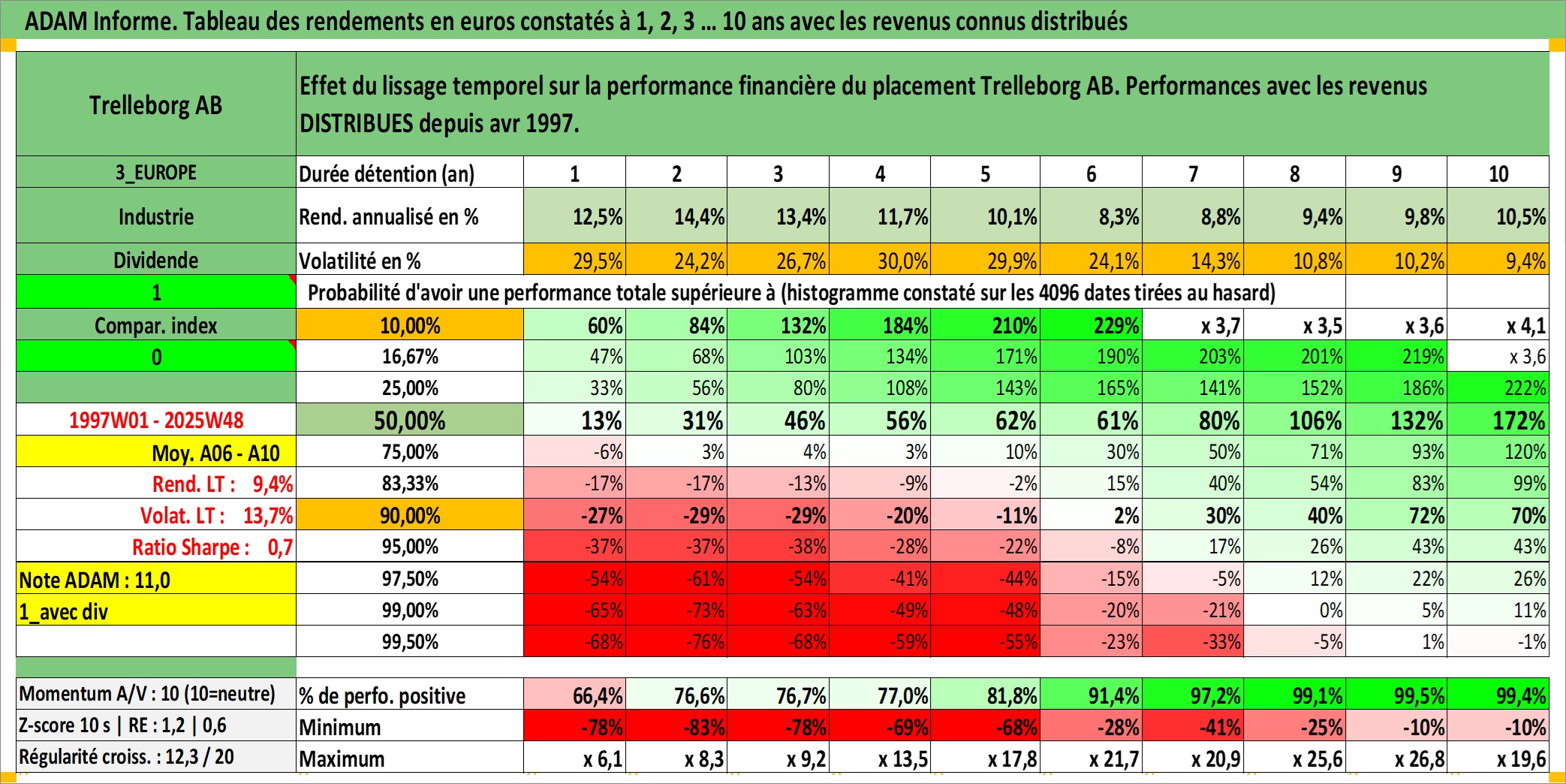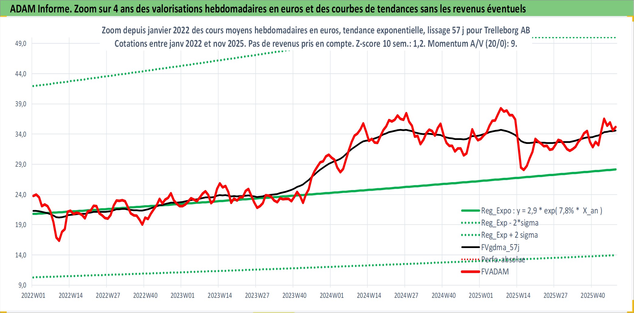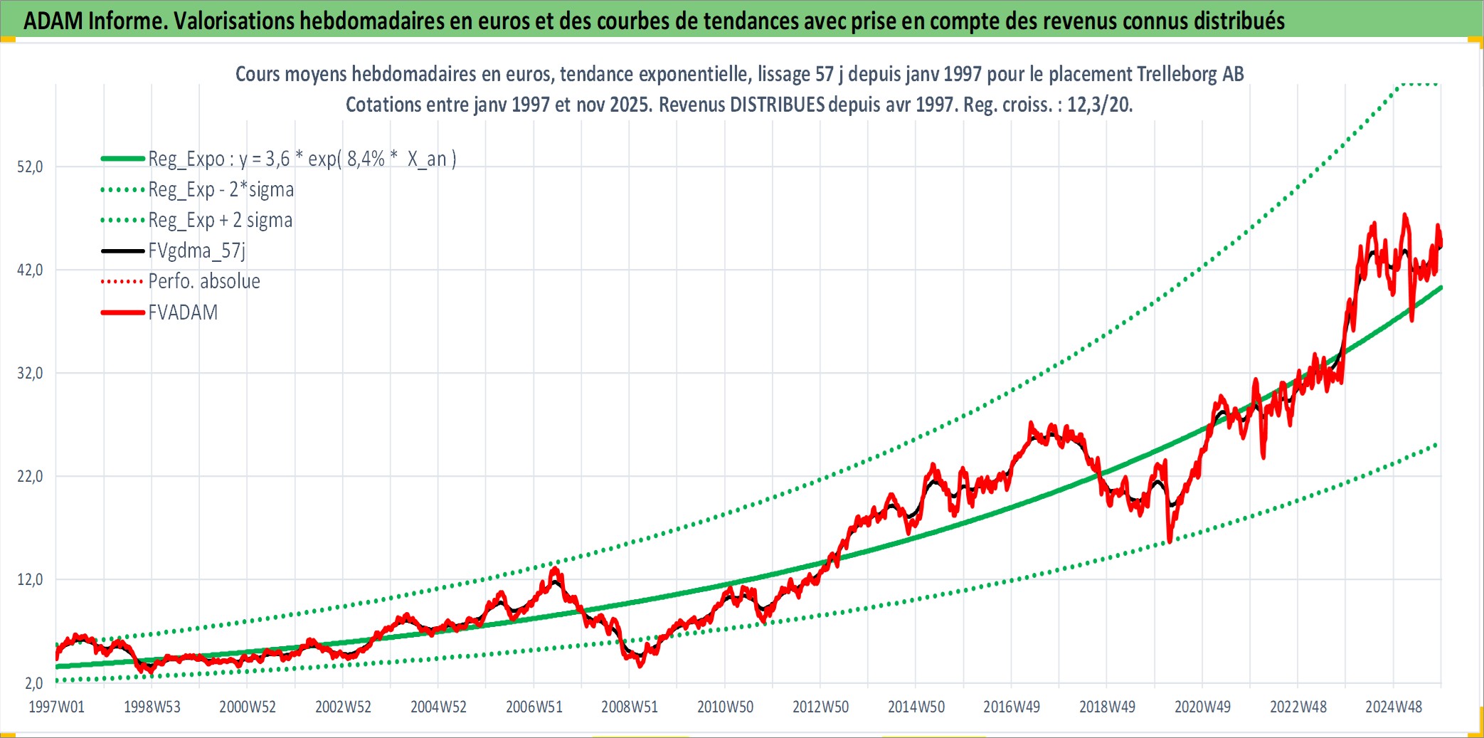 Site dédié aux investisseursPage dédiée sur site financeAnalyse des valorisations hebdomadaires de l'action Trelleborg AB. Cet actif est cote en SEK. Les valorisations sont en contrevaleur EURO et couvrent les semaines 1997W01 a 2025W48. Les revenus de cet actif financier sont pris en compte depuis la semaine 1997W18. La note globale ESG de cet actif est estimee a 6.0 (apres rebasage entre 0 et 20).