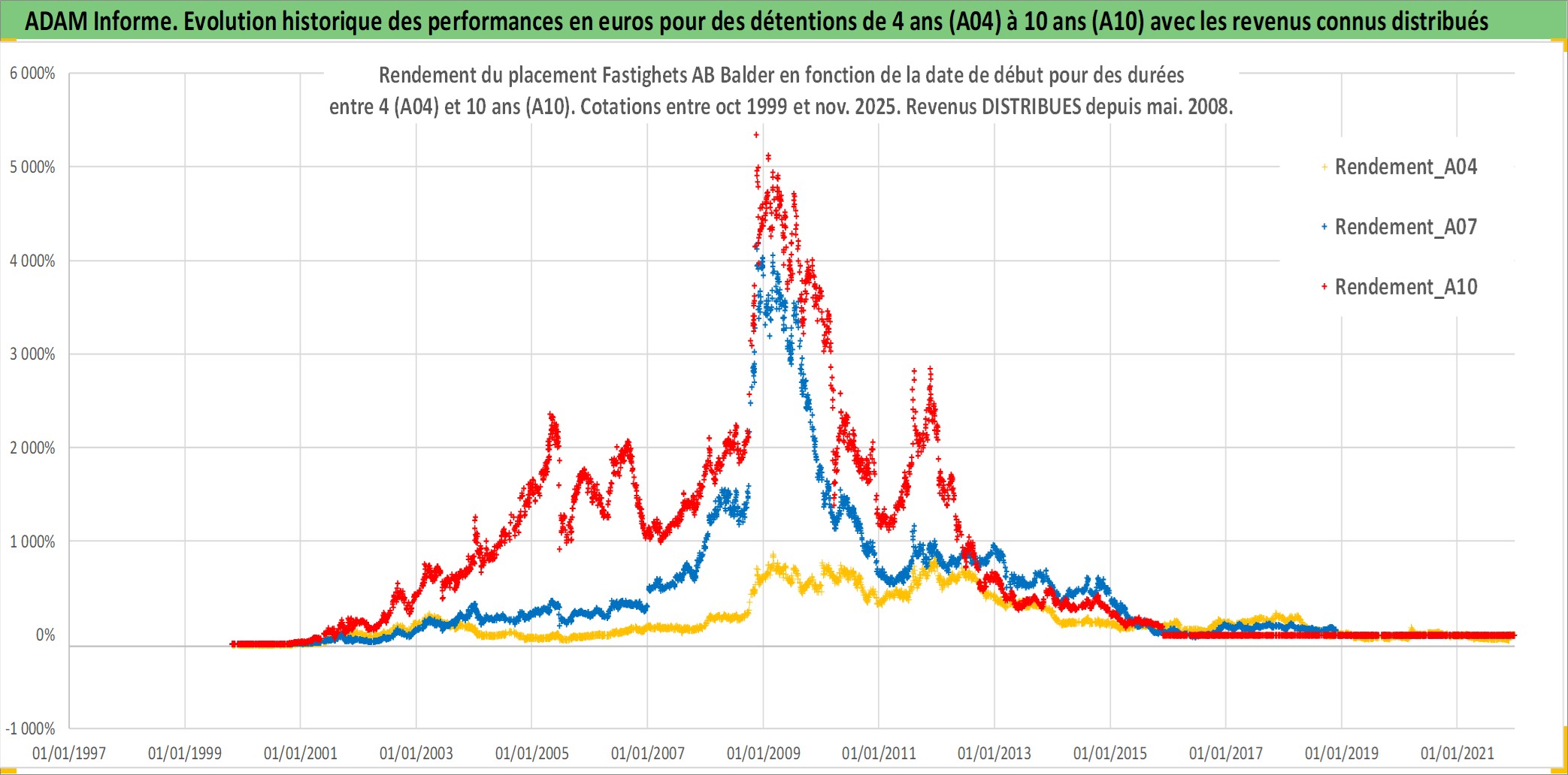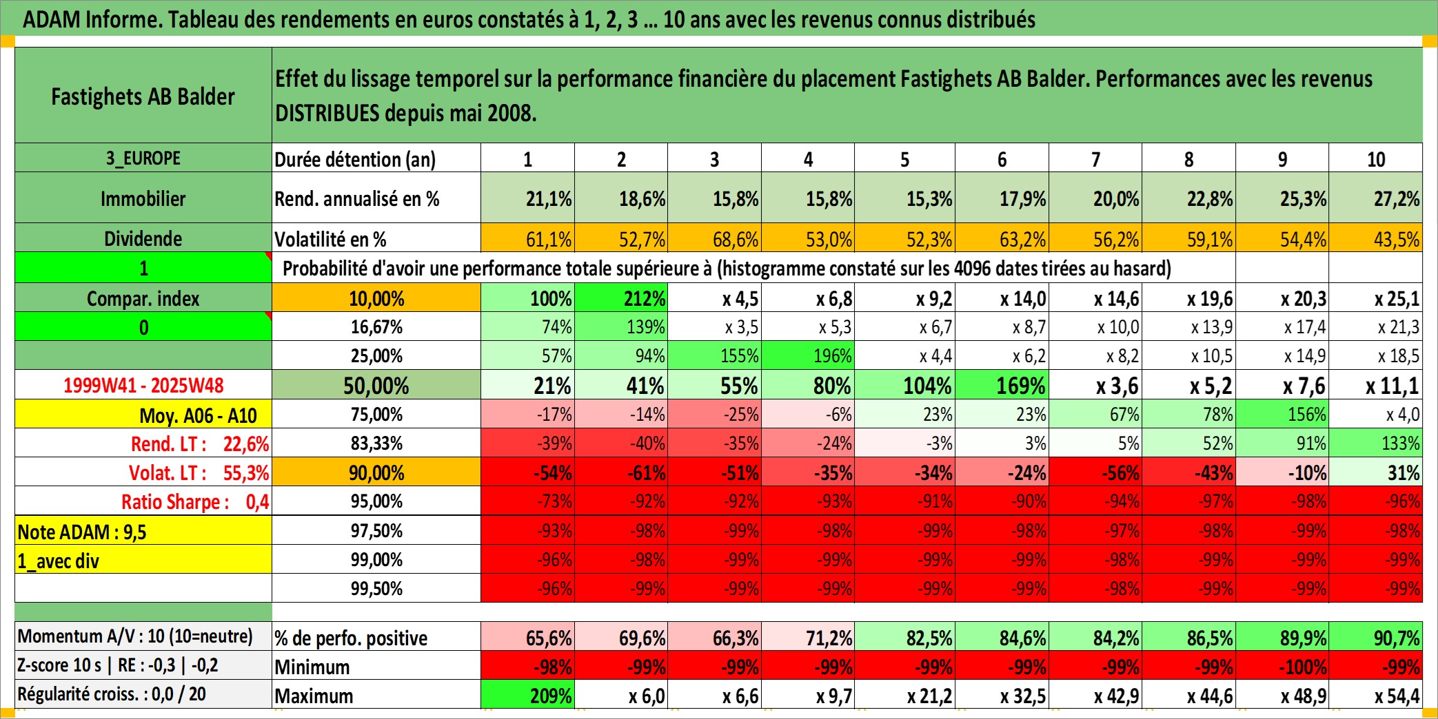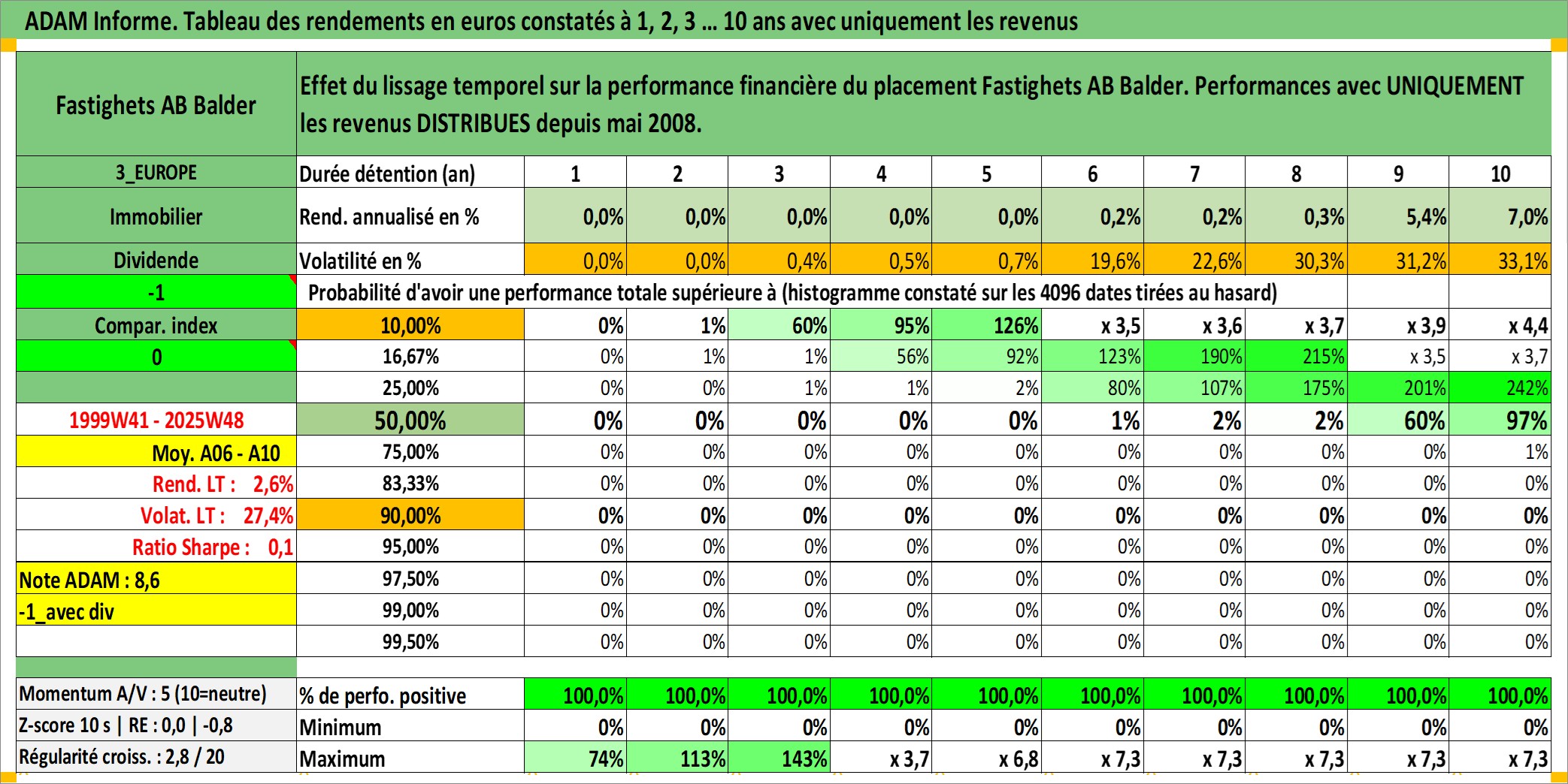 Site dédié aux investisseursPage dédiée sur site financeAnalyse des valorisations hebdomadaires de l'action Fastighets AB Balder. Cet actif est cote en SEK. Les valorisations sont en contrevaleur EURO et couvrent les semaines 1999W41 a 2025W48. Les revenus de cet actif financier sont pris en compte depuis la semaine 2008W19. La note ESG de cet actif n'est pas connue.