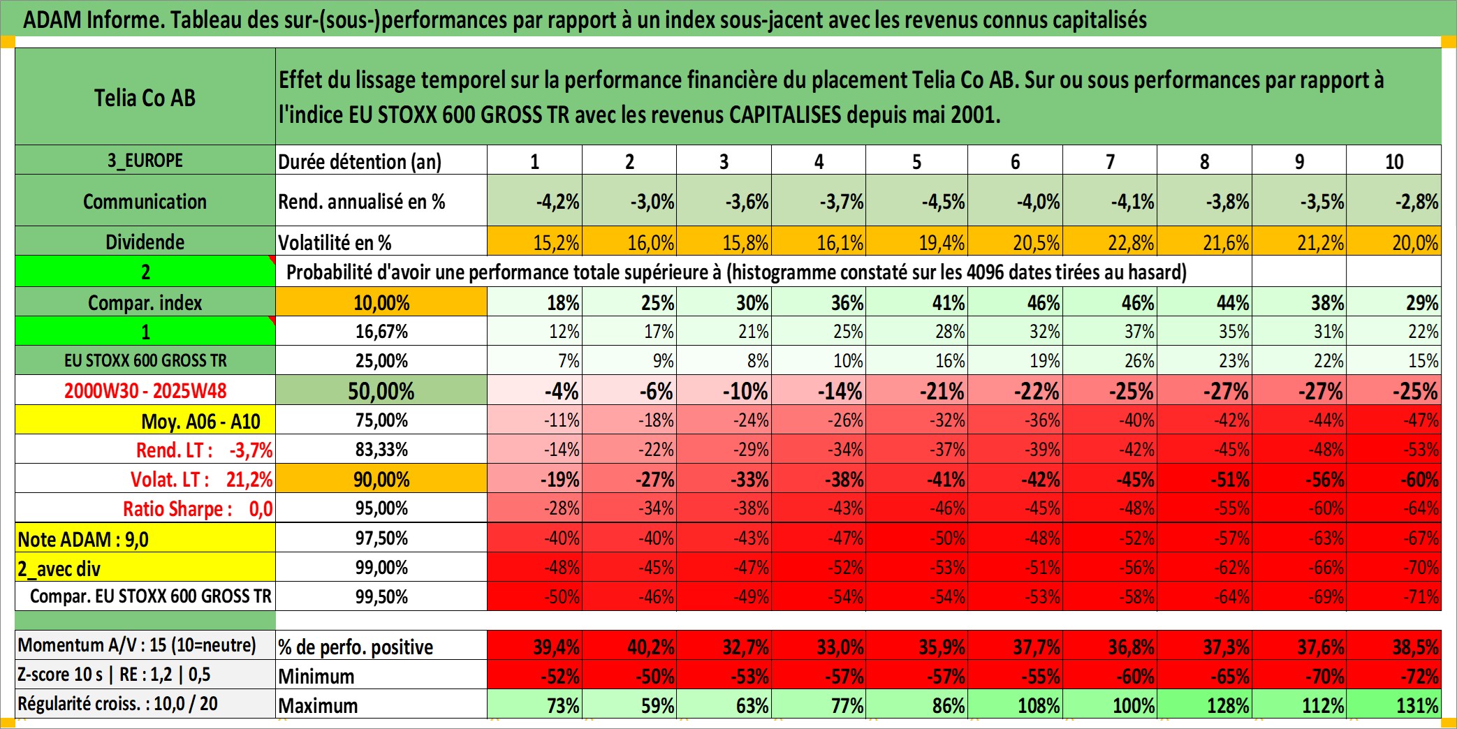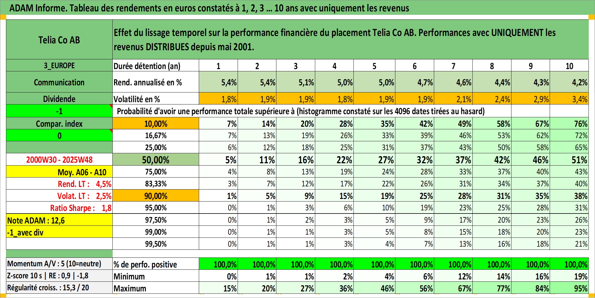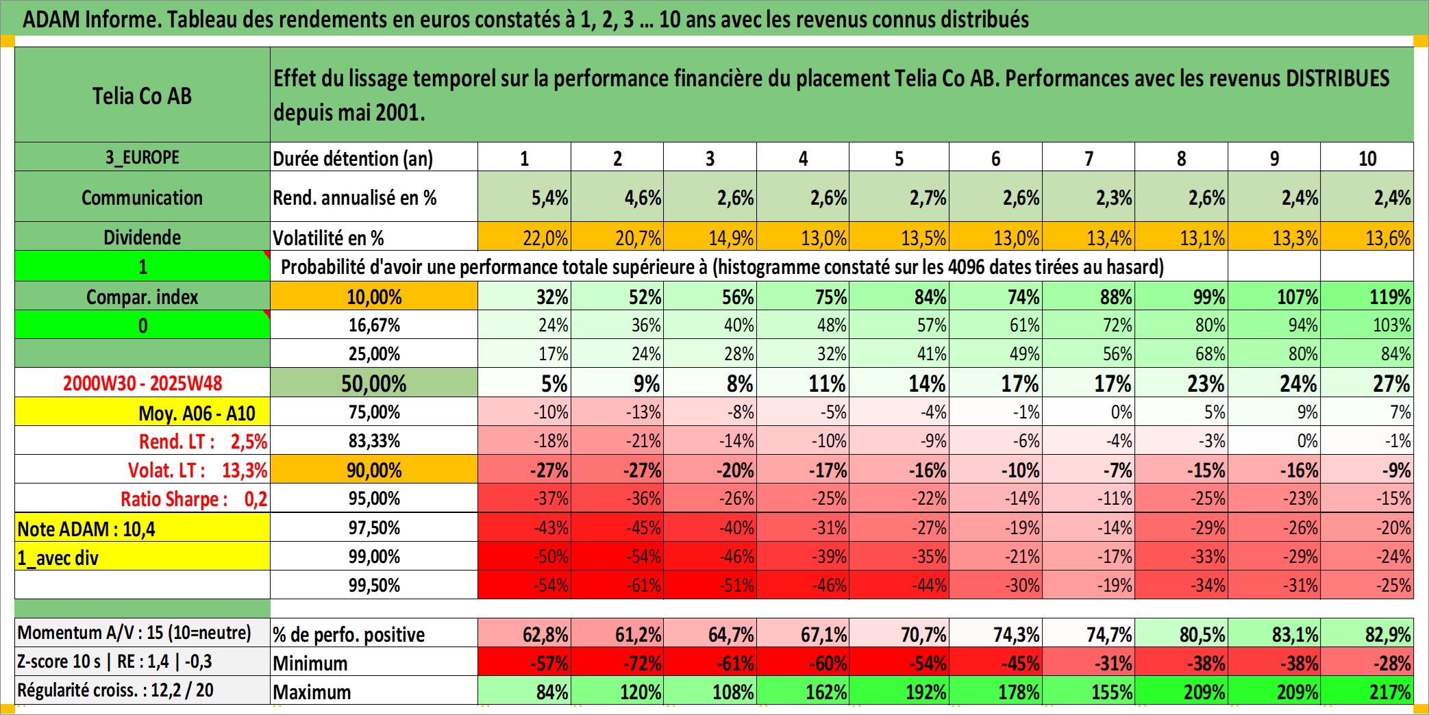 Site dédié aux investisseursPage dédiée sur site financeAnalyse des valorisations hebdomadaires de l'action Telia Co AB. Cet actif est cote en SEK. Les valorisations sont en contrevaleur EURO et couvrent les semaines 2000W30 a 2025W48. Les revenus de cet actif financier sont pris en compte depuis la semaine 2001W19. La note globale ESG de cet actif est estimee a 11.0 (apres rebasage entre 0 et 20).