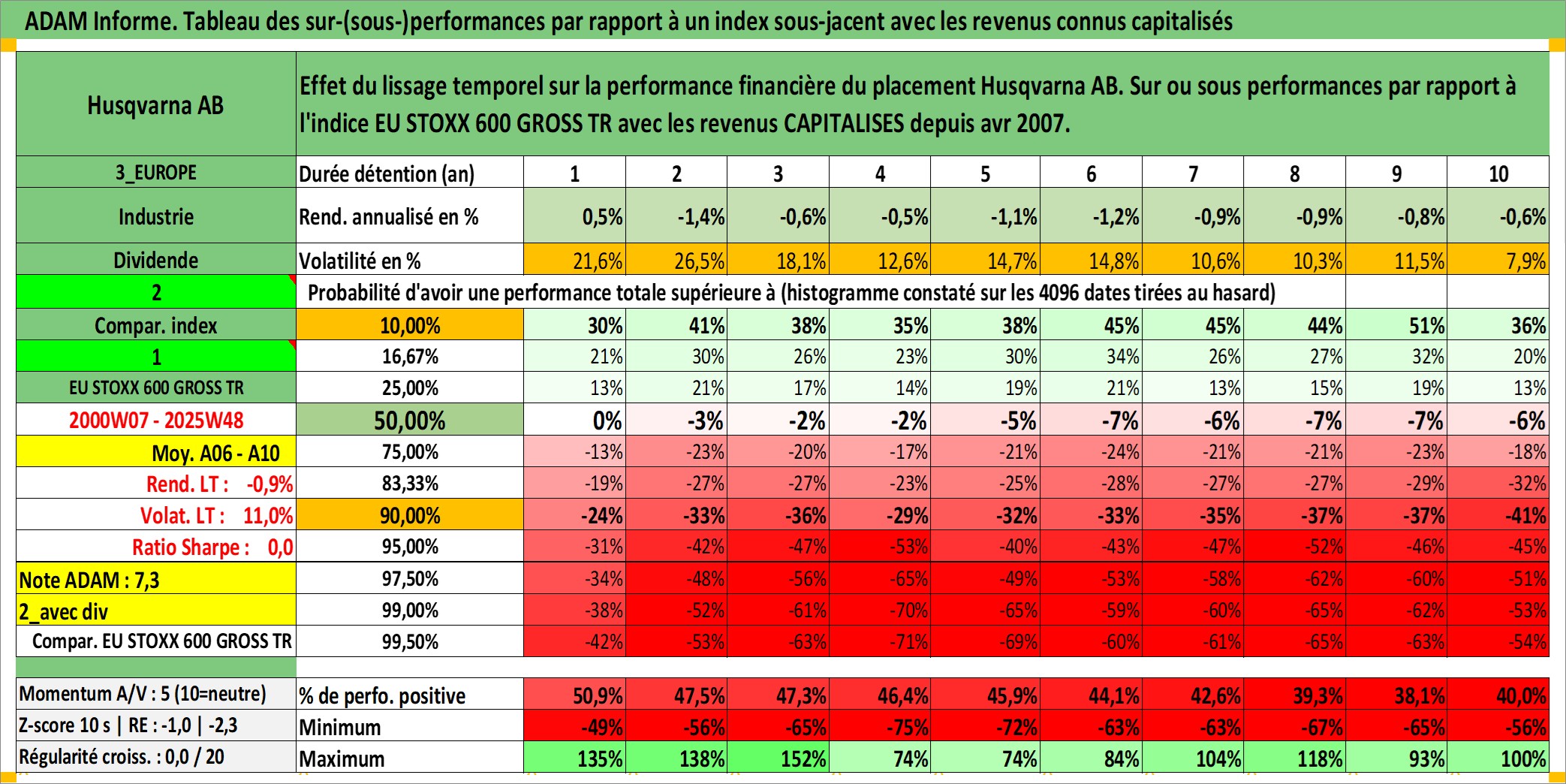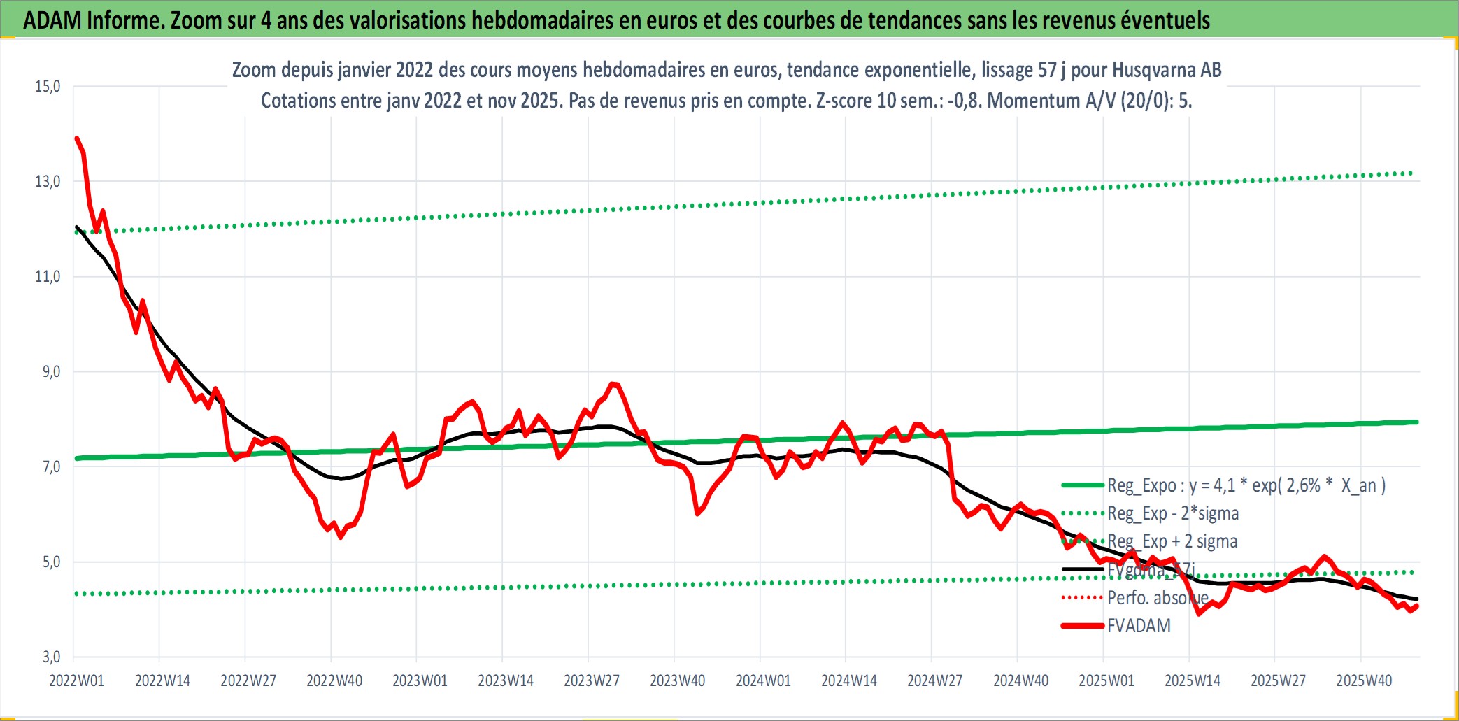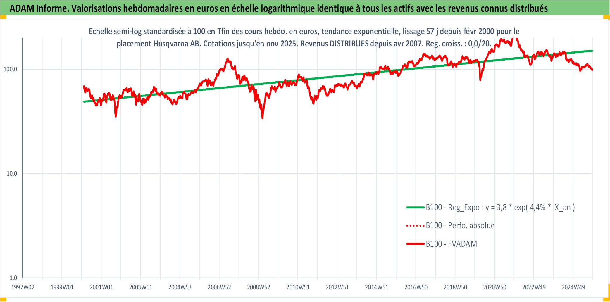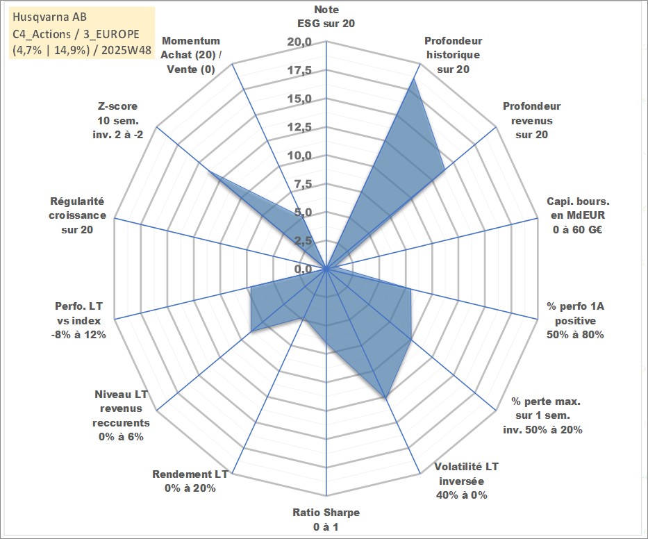 Site dédié aux investisseursPage dédiée sur site financeAnalyse des valorisations hebdomadaires de l'action Husqvarna AB. Cet actif est cote en SEK. Les valorisations sont en contrevaleur EURO et couvrent les semaines 2000W07 a 2025W48. Les revenus de cet actif financier sont pris en compte depuis la semaine 2007W16. La note ESG de cet actif n'est pas connue.
