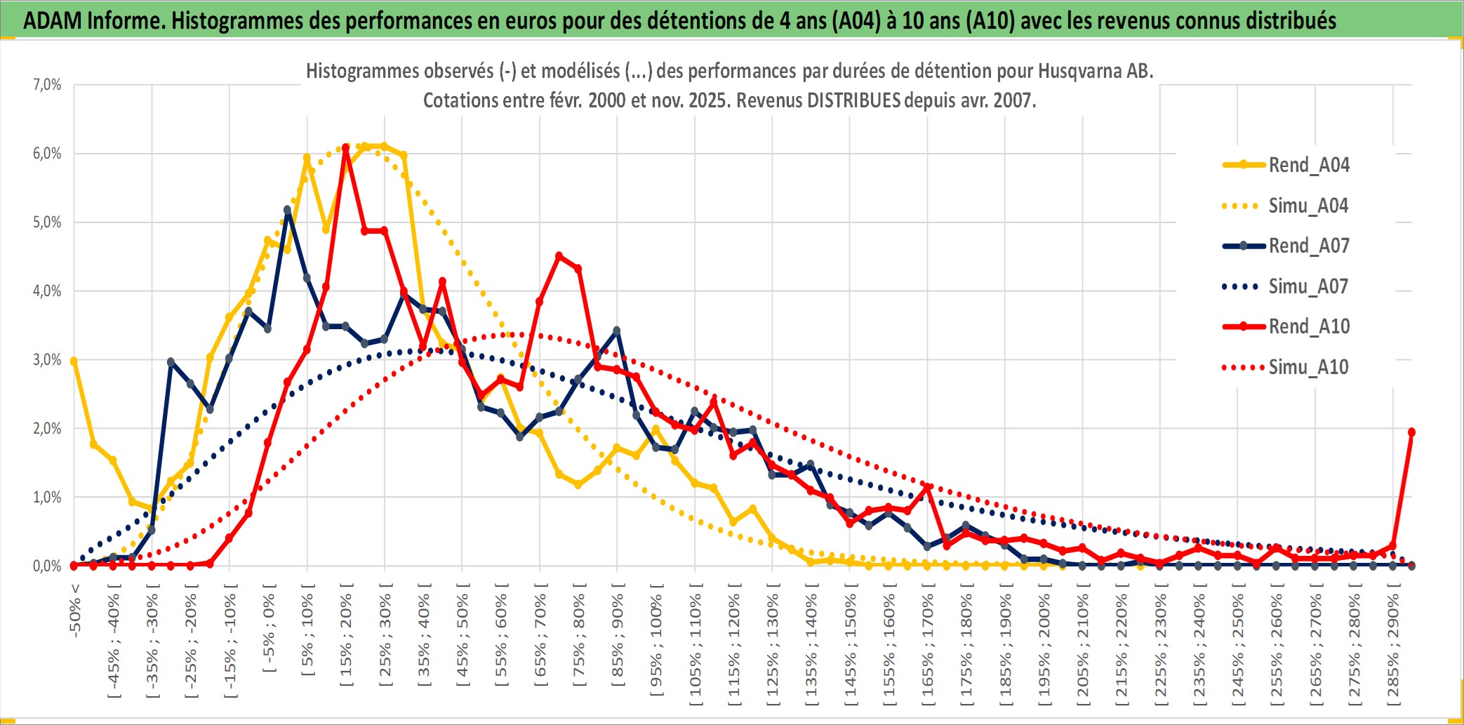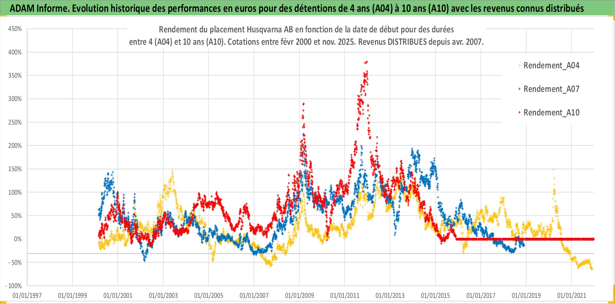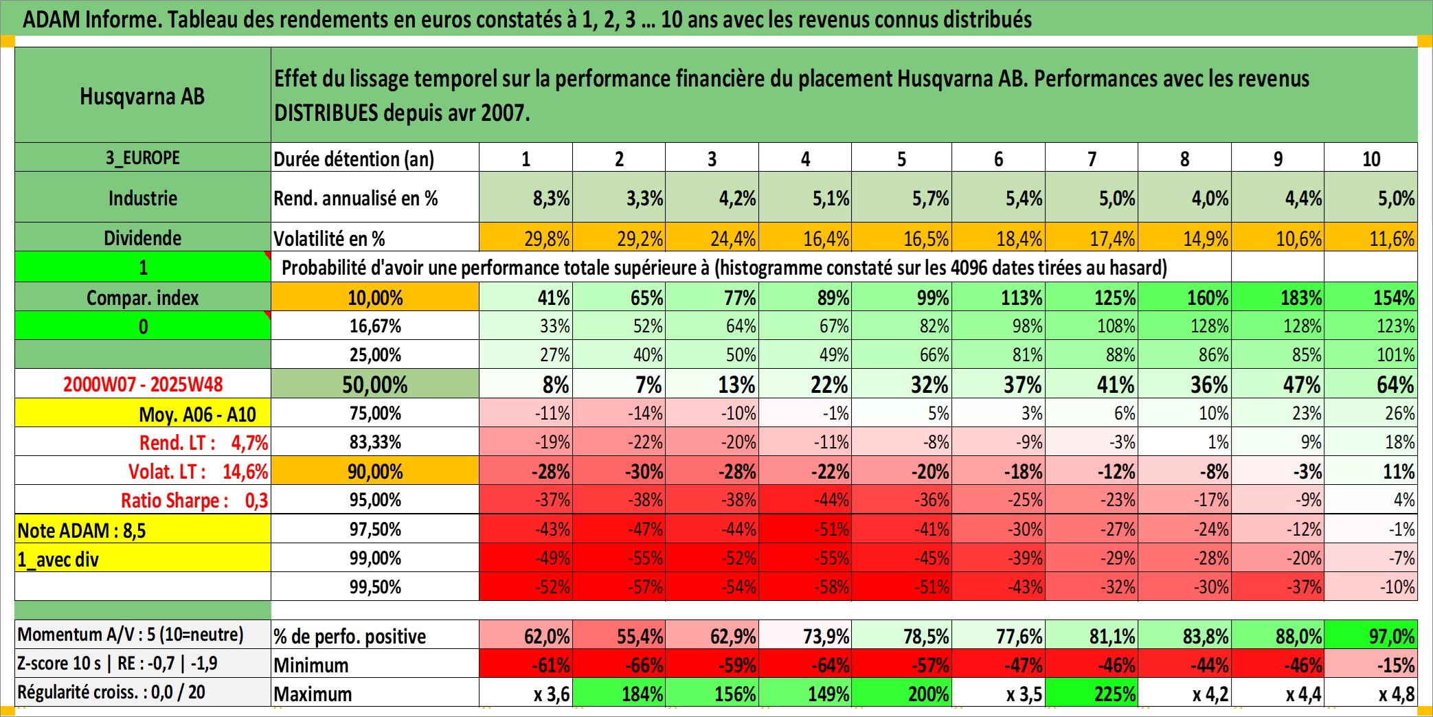 Site dédié aux investisseursPage dédiée sur site financeAnalyse des valorisations hebdomadaires de l'action Husqvarna AB. Cet actif est cote en SEK. Les valorisations sont en contrevaleur EURO et couvrent les semaines 2000W07 a 2025W48. Les revenus de cet actif financier sont pris en compte depuis la semaine 2007W16. La note ESG de cet actif n'est pas connue.