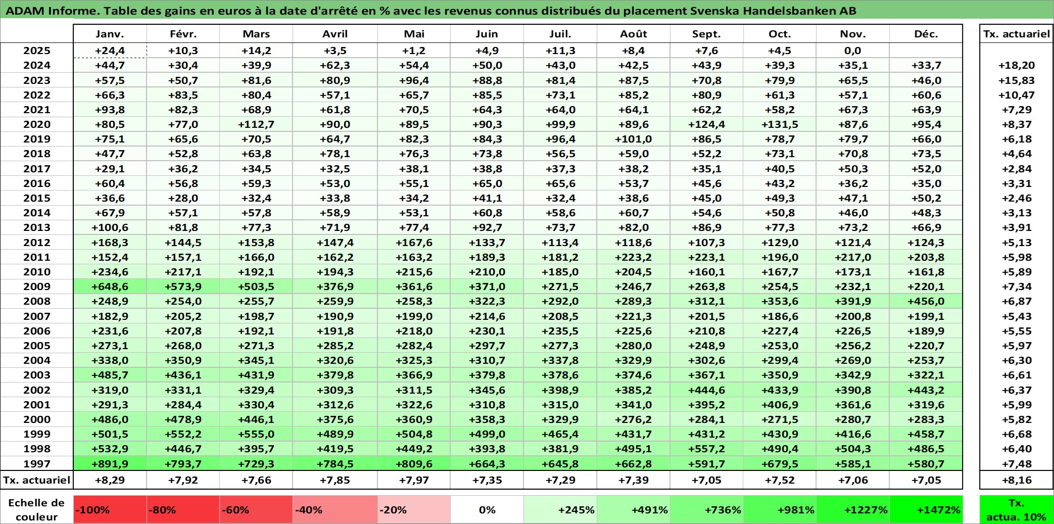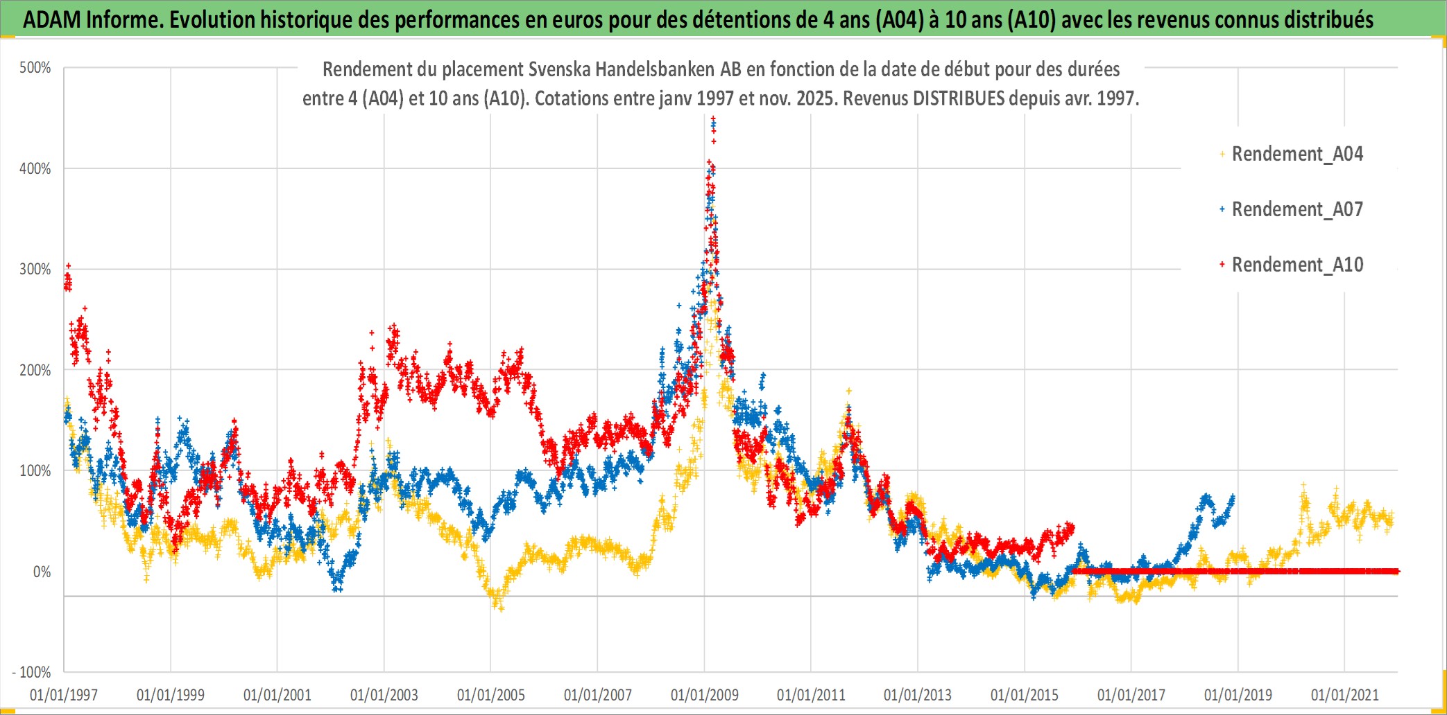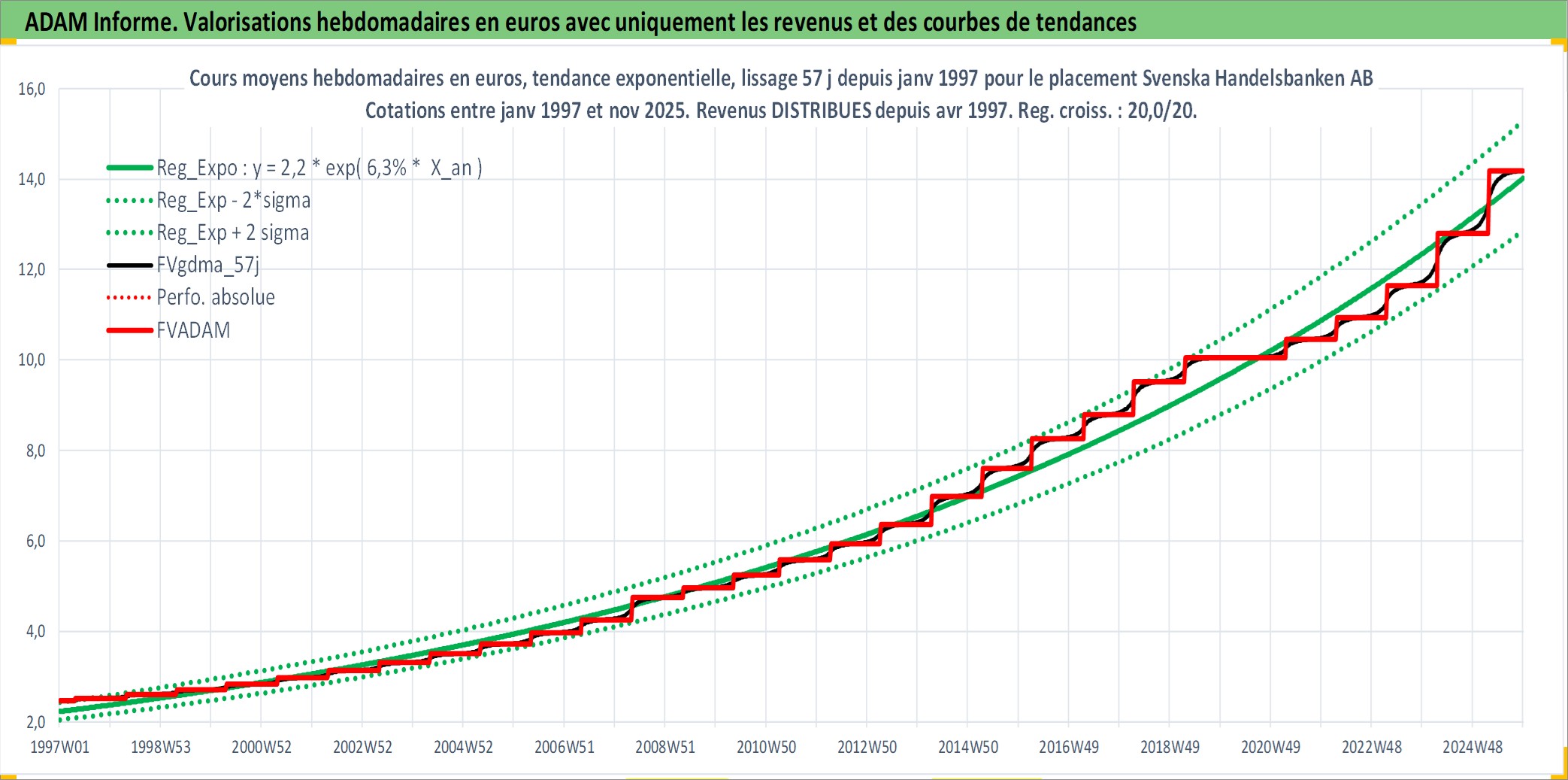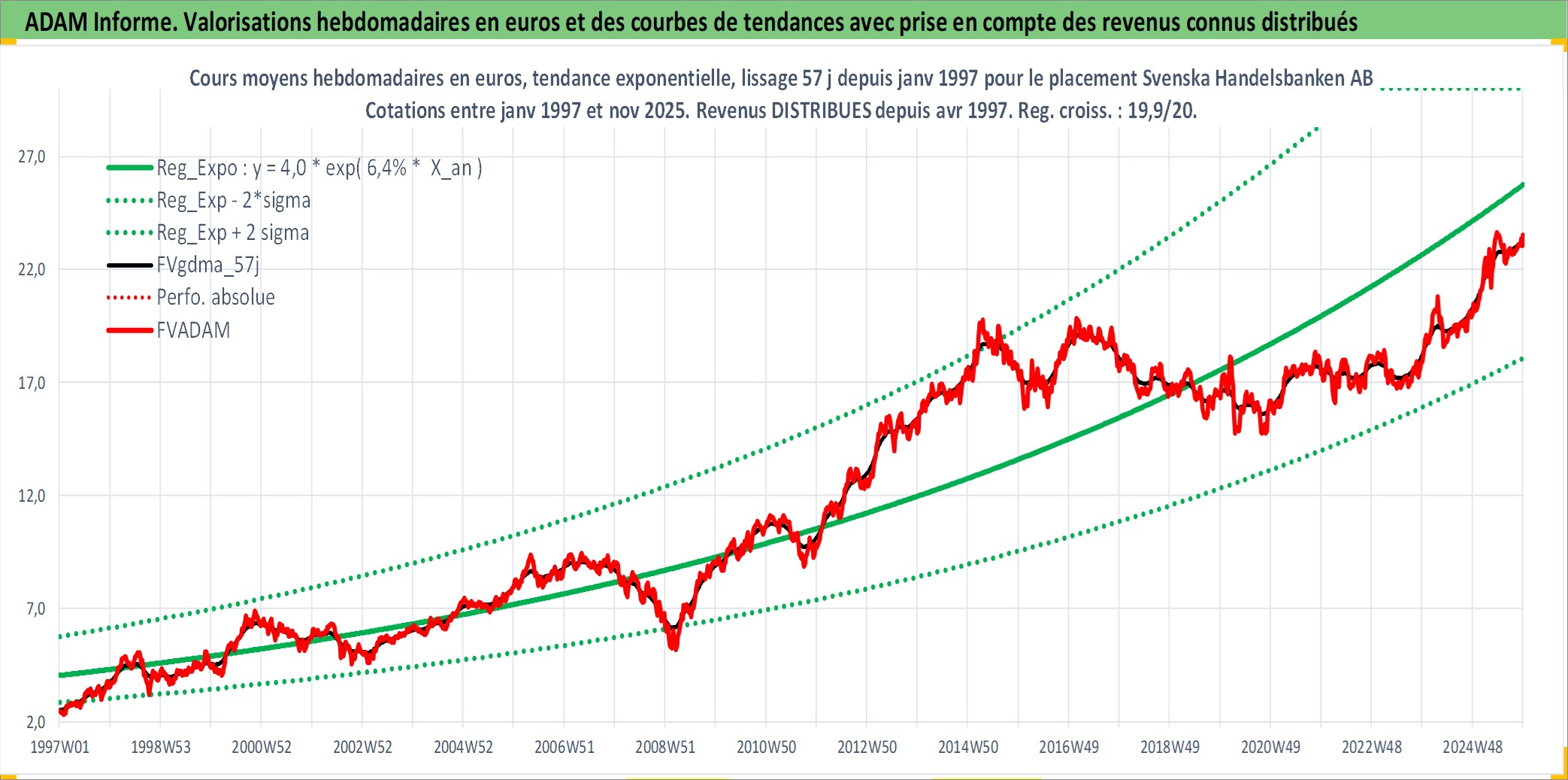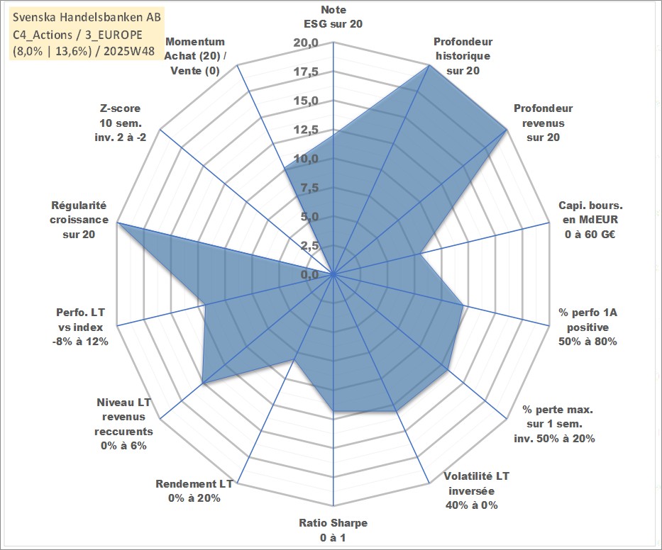 Site dédié aux investisseursPage dédiée sur site financeAnalyse des valorisations hebdomadaires de l'action Svenska Handelsbanken AB. Cet actif est cote en SEK. Les valorisations sont en contrevaleur EURO et couvrent les semaines 1997W01 a 2025W48. Les revenus de cet actif financier sont pris en compte depuis la semaine 1997W17. La note globale ESG de cet actif est estimee a 12.0 (apres rebasage entre 0 et 20).