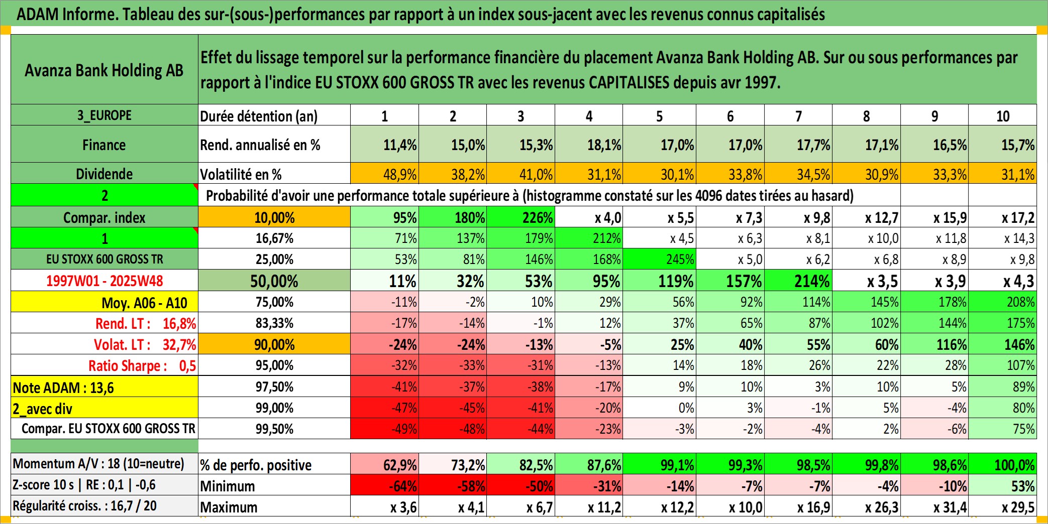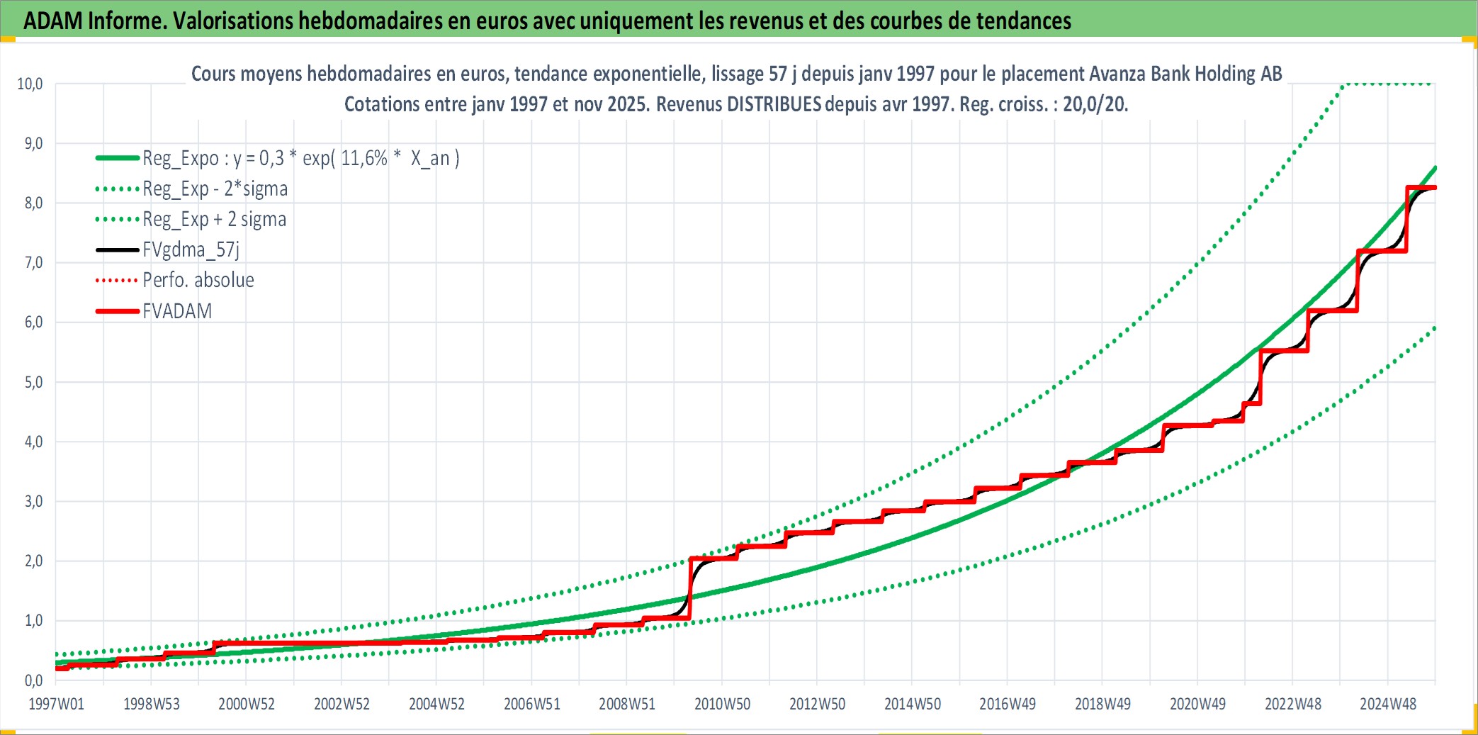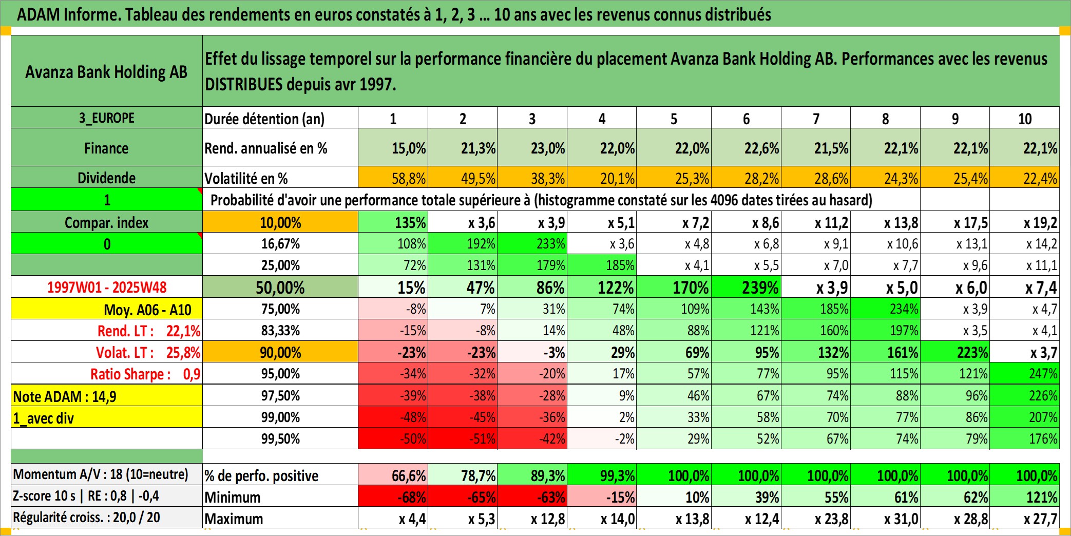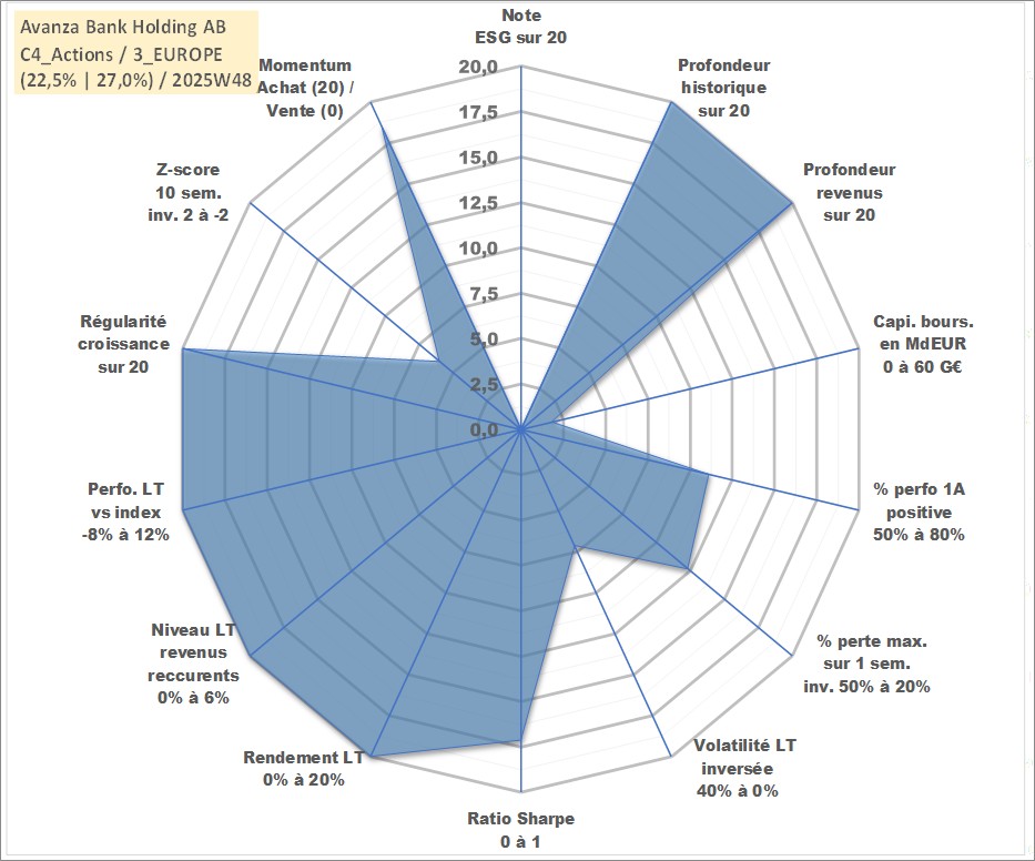 Site dédié aux investisseursPage dédiée sur site financeAnalyse des valorisations hebdomadaires de l'action Avanza Bank Holding AB. Cet actif est cote en SEK. Les valorisations sont en contrevaleur EURO et couvrent les semaines 1997W01 a 2025W48. Les revenus de cet actif financier sont pris en compte depuis la semaine 1997W15. La note ESG de cet actif n'est pas connue.