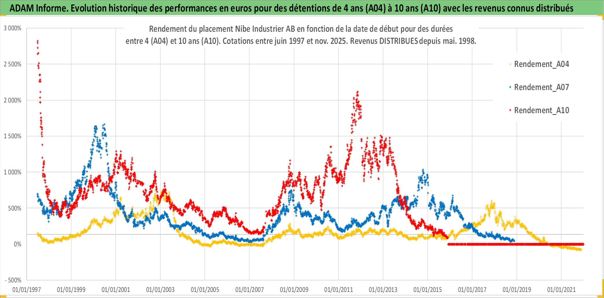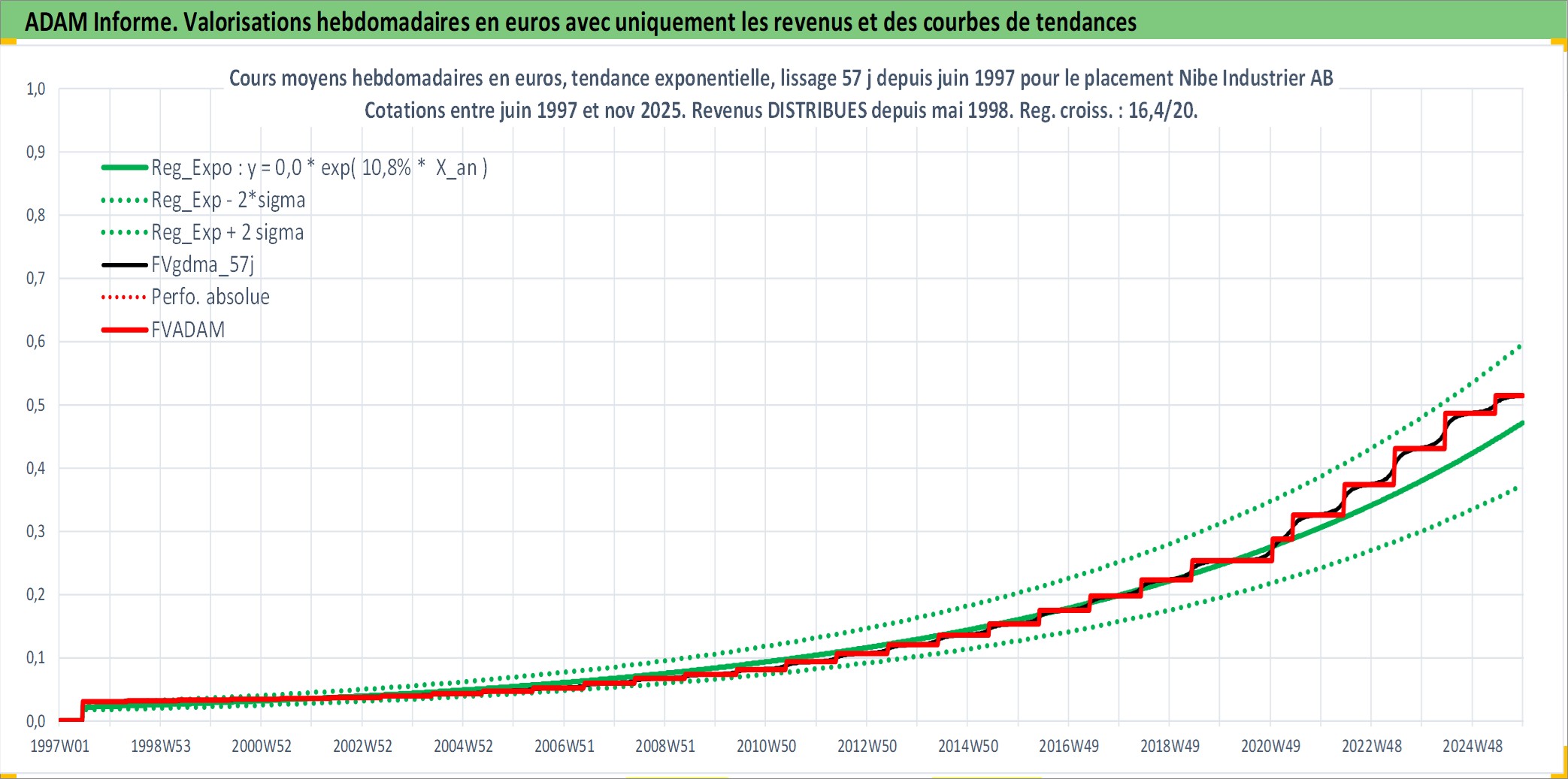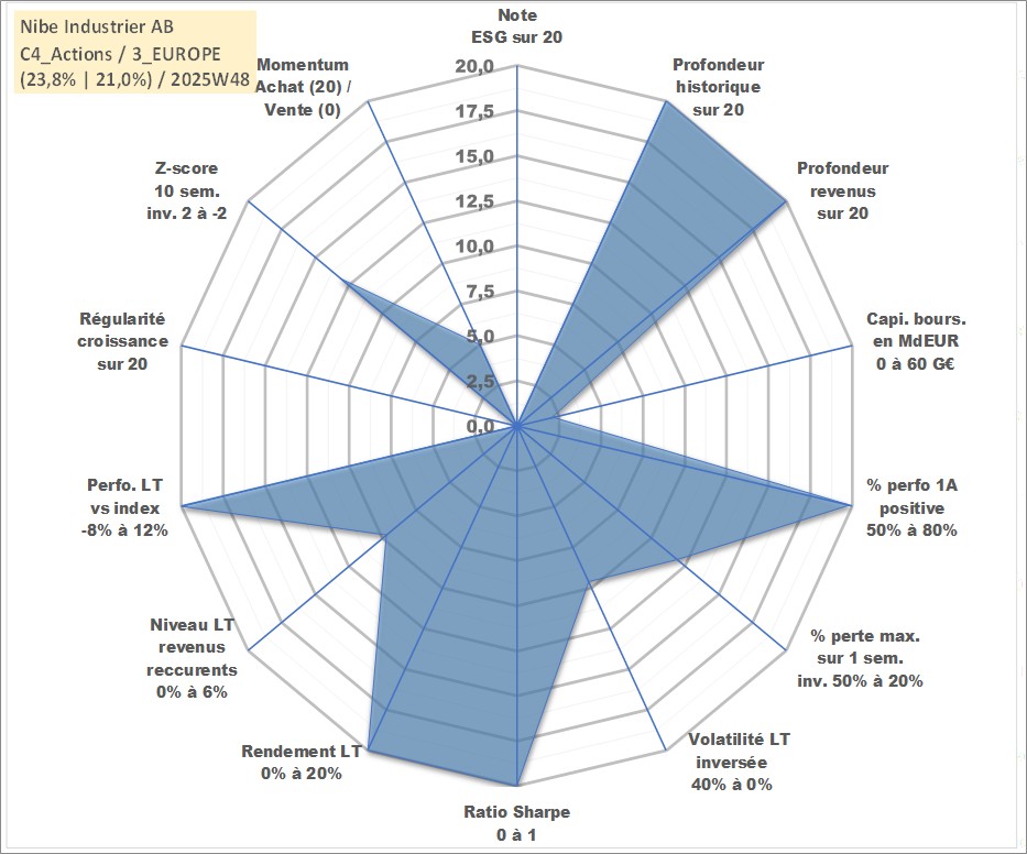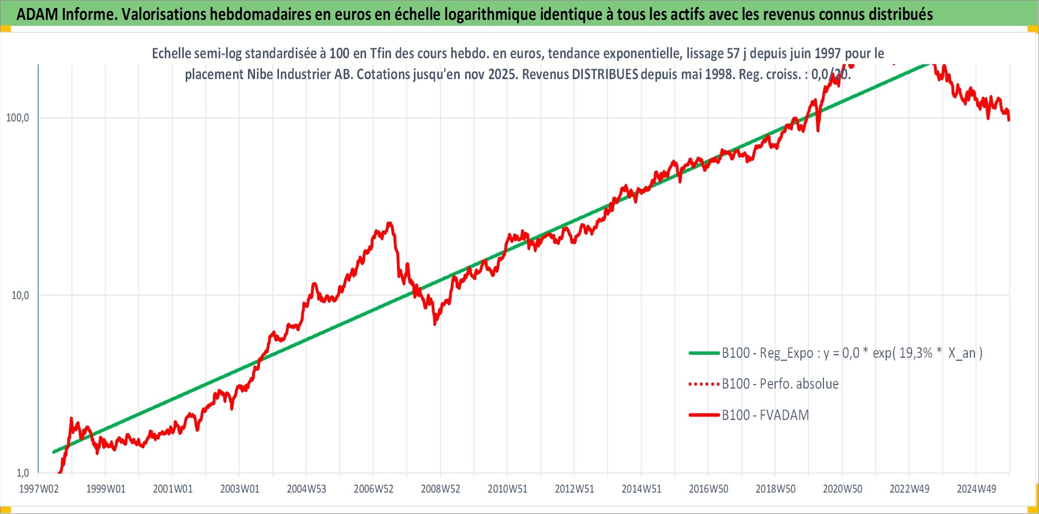 Site dédié aux investisseursPage dédiée sur site financeAnalyse des valorisations hebdomadaires de l'action Nibe Industrier AB. Cet actif est cote en SEK. Les valorisations sont en contrevaleur EURO et couvrent les semaines 1997W25 a 2025W48. Les revenus de cet actif financier sont pris en compte depuis la semaine 1998W19. La note ESG de cet actif n'est pas connue.