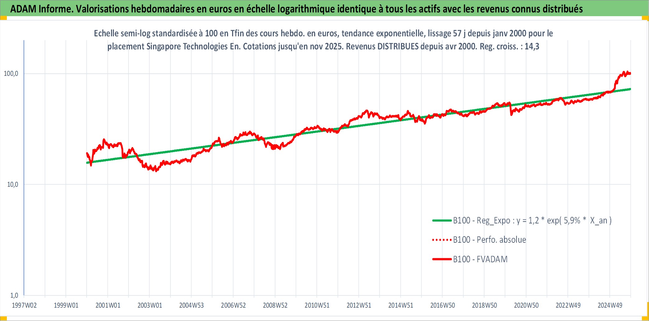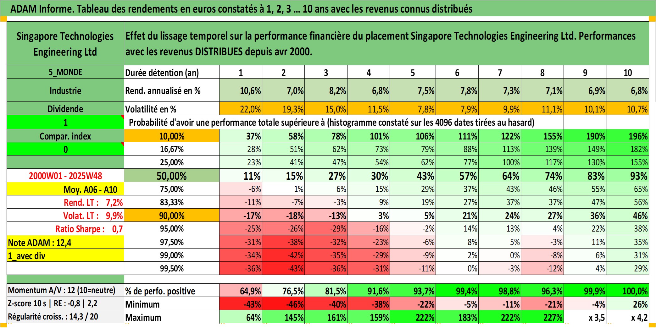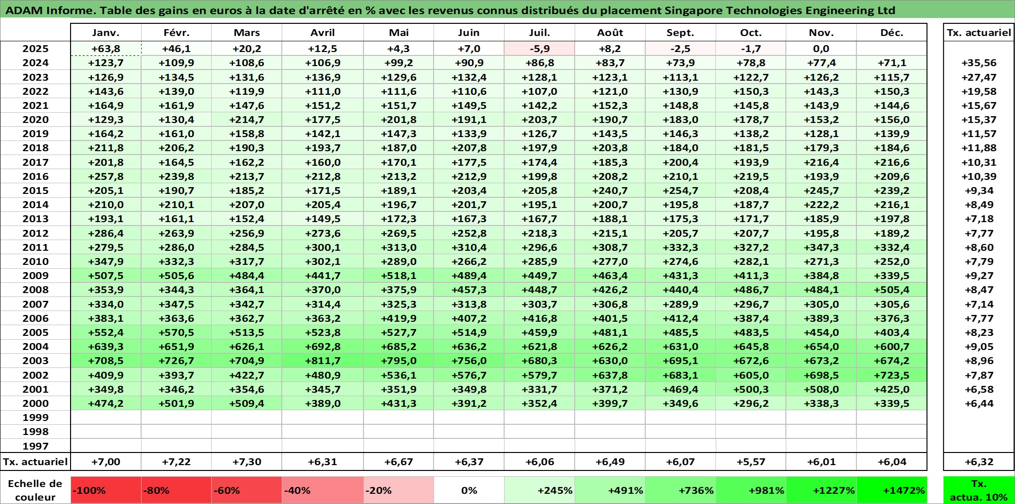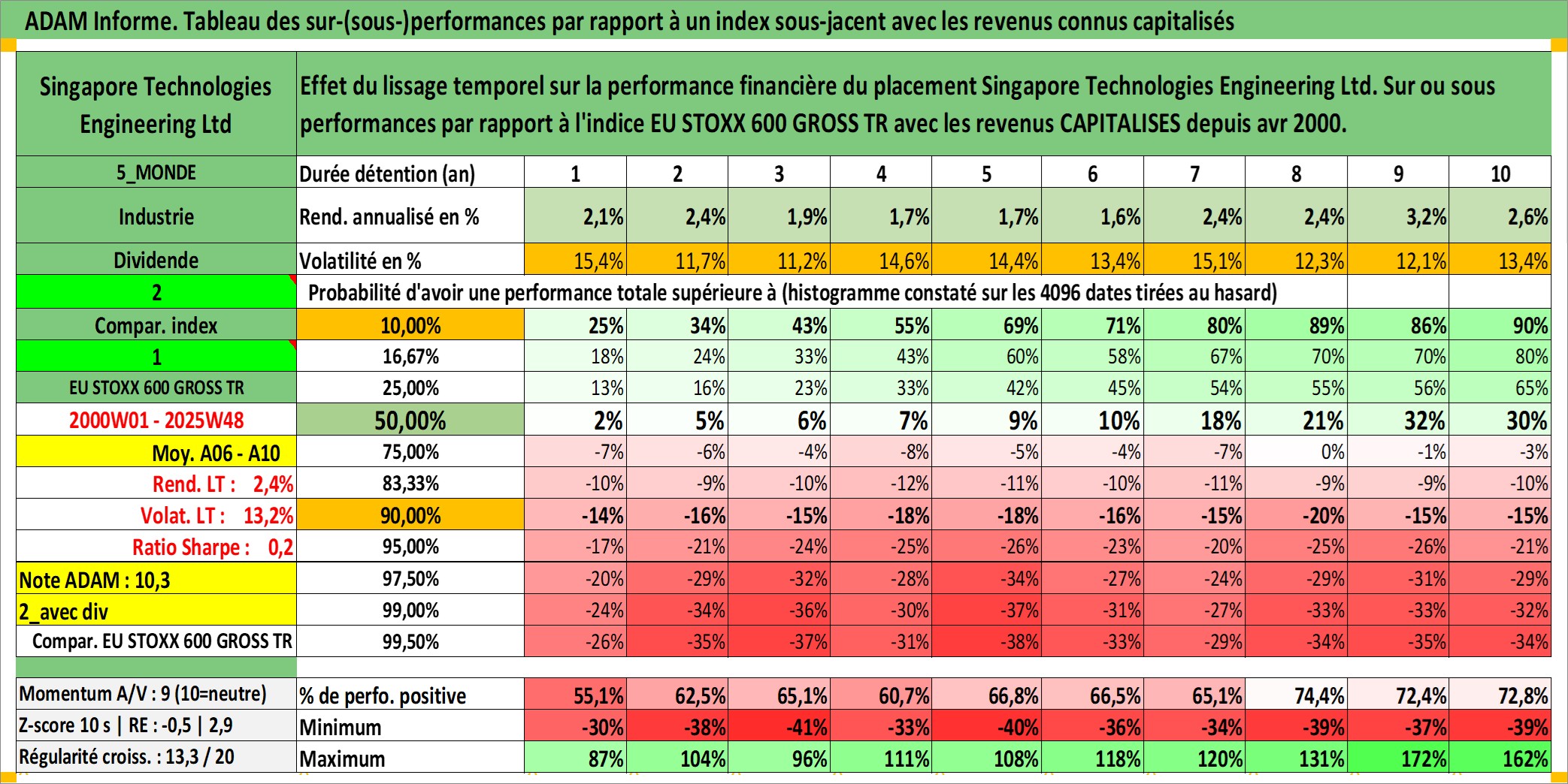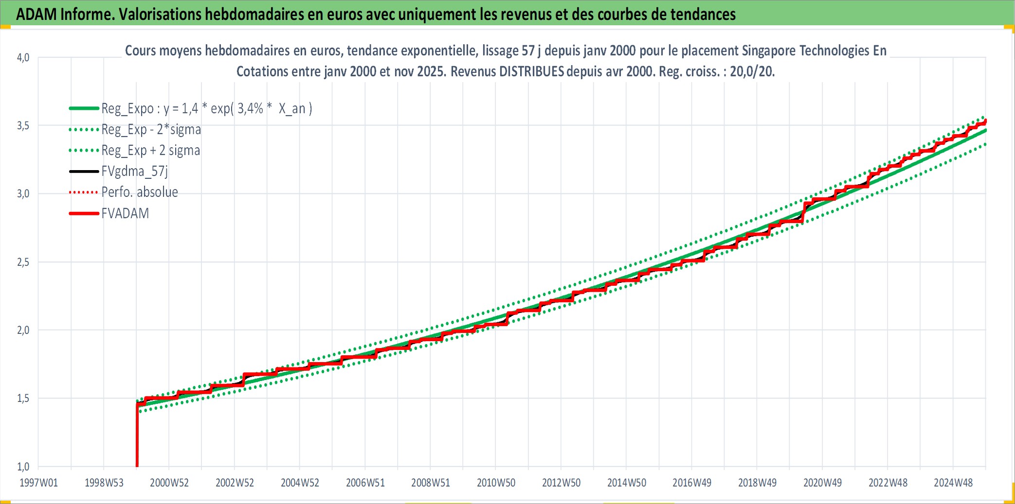 Site dédié aux investisseursPage dédiée sur site financeAnalyse des valorisations hebdomadaires de l'action Singapore Technologies Engineering Ltd. Cet actif est cote en SGD. Les valorisations sont en contrevaleur EURO et couvrent les semaines 2000W01 a 2025W48. Les revenus de cet actif financier sont pris en compte depuis la semaine 2000W14. La note globale ESG de cet actif est estimee a 5.0 (apres rebasage entre 0 et 20).