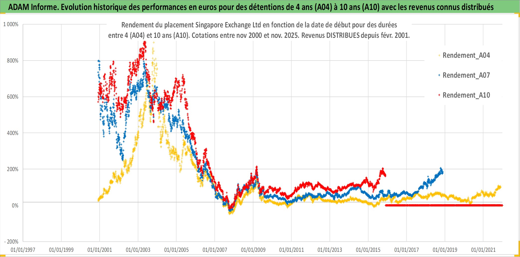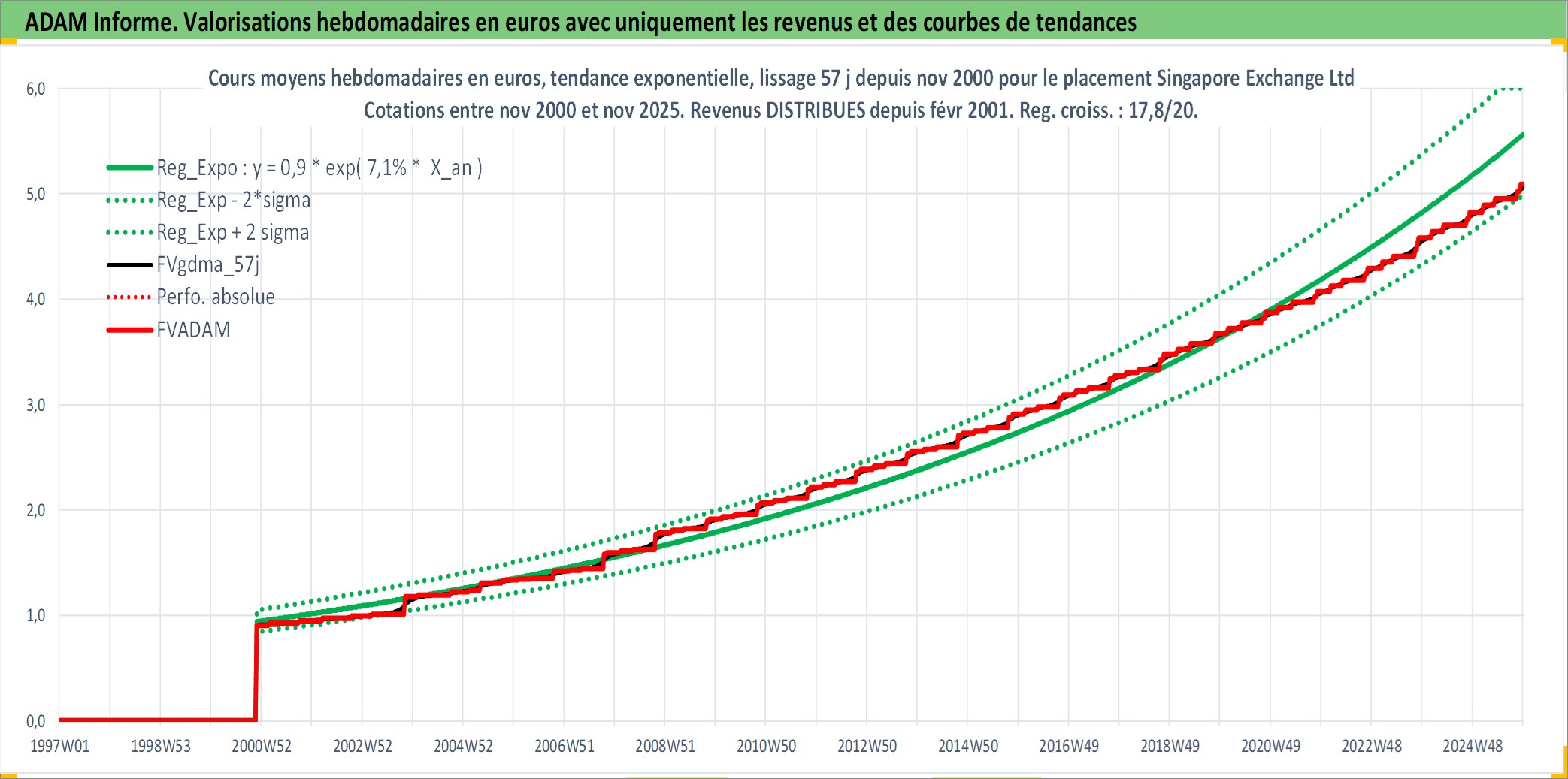 Site dédié aux investisseursPage dédiée sur site financeAnalyse des valorisations hebdomadaires de l'action Singapore Exchange Ltd. Cet actif est cote en SGD. Les valorisations sont en contrevaleur EURO et couvrent les semaines 2000W47 a 2025W48. Les revenus de cet actif financier sont pris en compte depuis la semaine 2001W08. La note globale ESG de cet actif est estimee a 10.0 (apres rebasage entre 0 et 20).