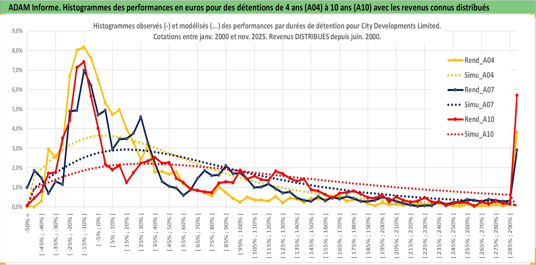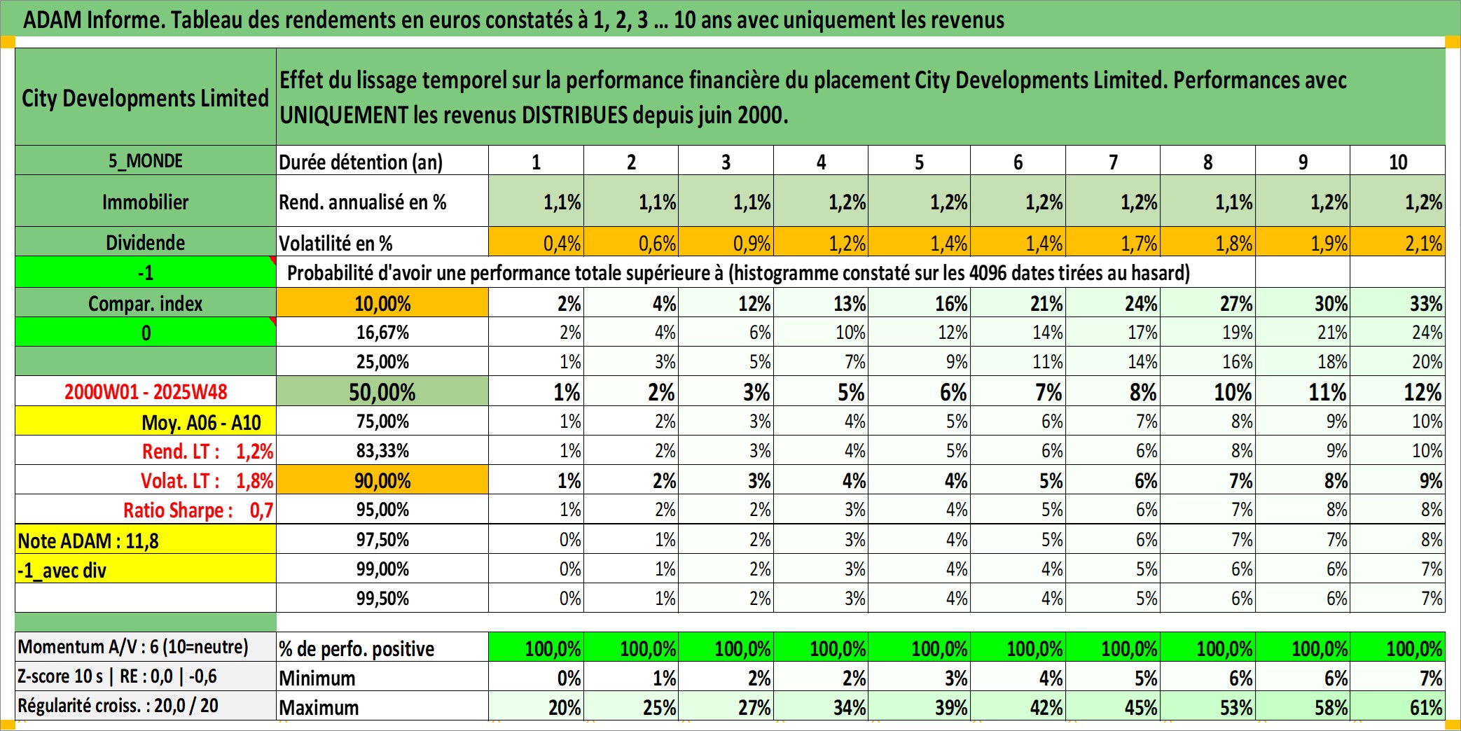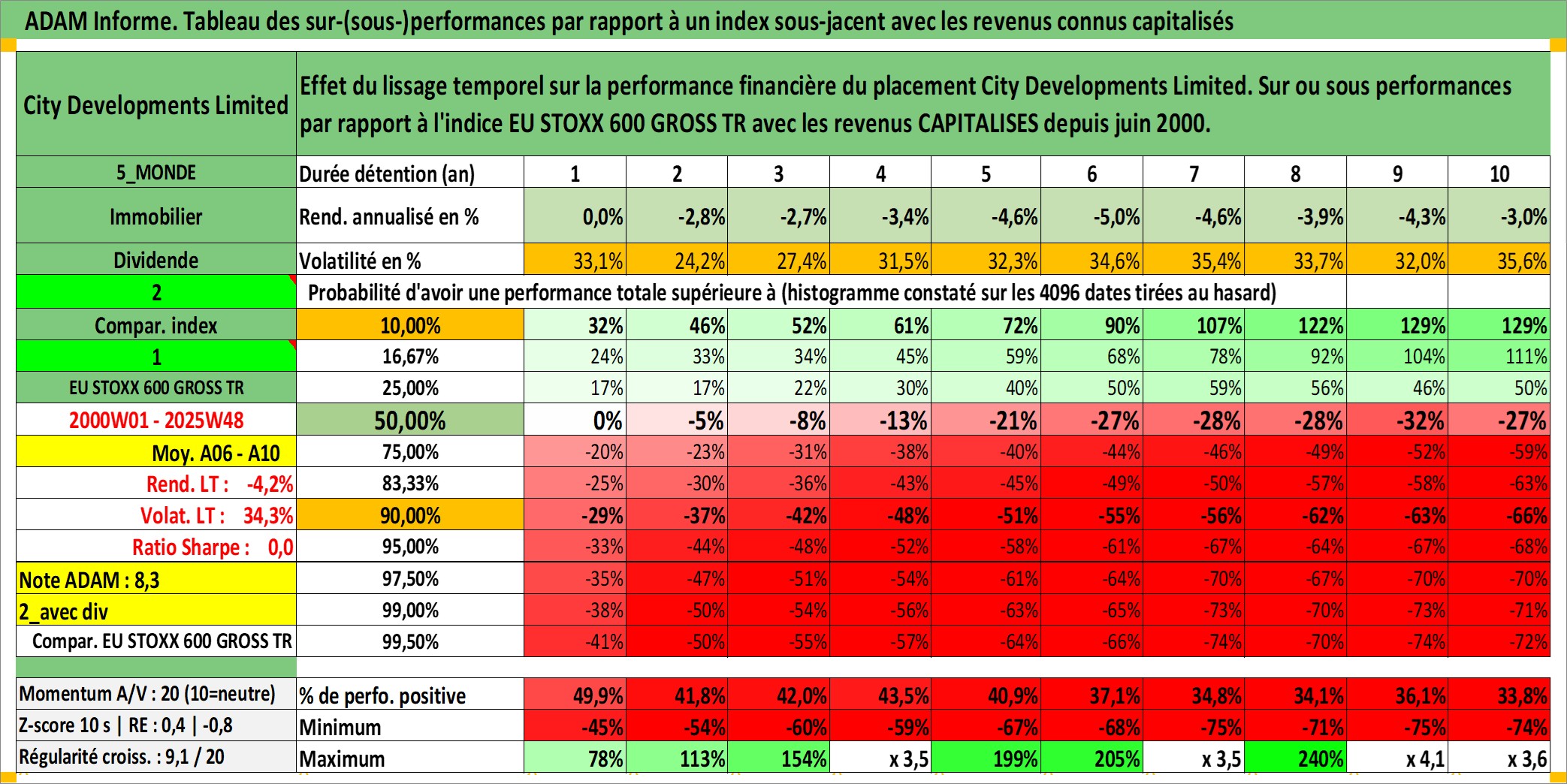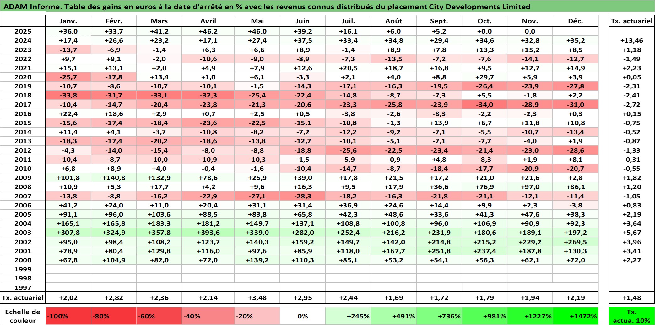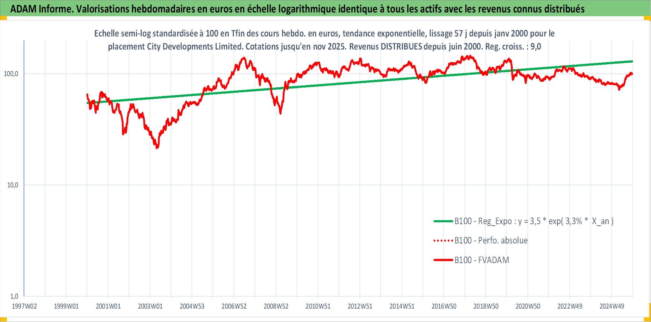Site dédié aux investisseursPage dédiée sur site financeAnalyse des valorisations hebdomadaires de l'action City Developments Limited. Cet actif est cote en SGD. Les valorisations sont en contrevaleur EURO et couvrent les semaines 2000W01 a 2025W48. Les revenus de cet actif financier sont pris en compte depuis la semaine 2000W23. La note globale ESG de cet actif est estimee a 18.0 (apres rebasage entre 0 et 20).