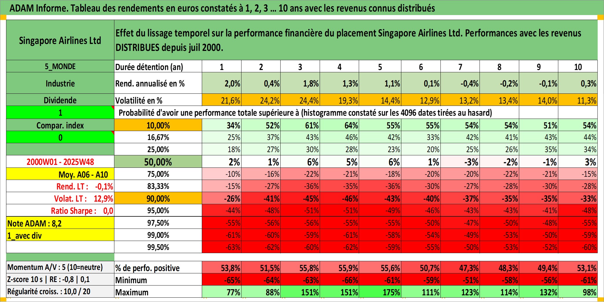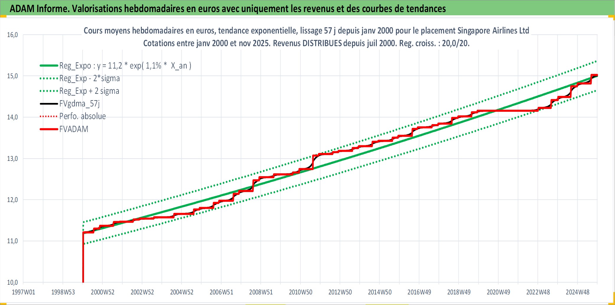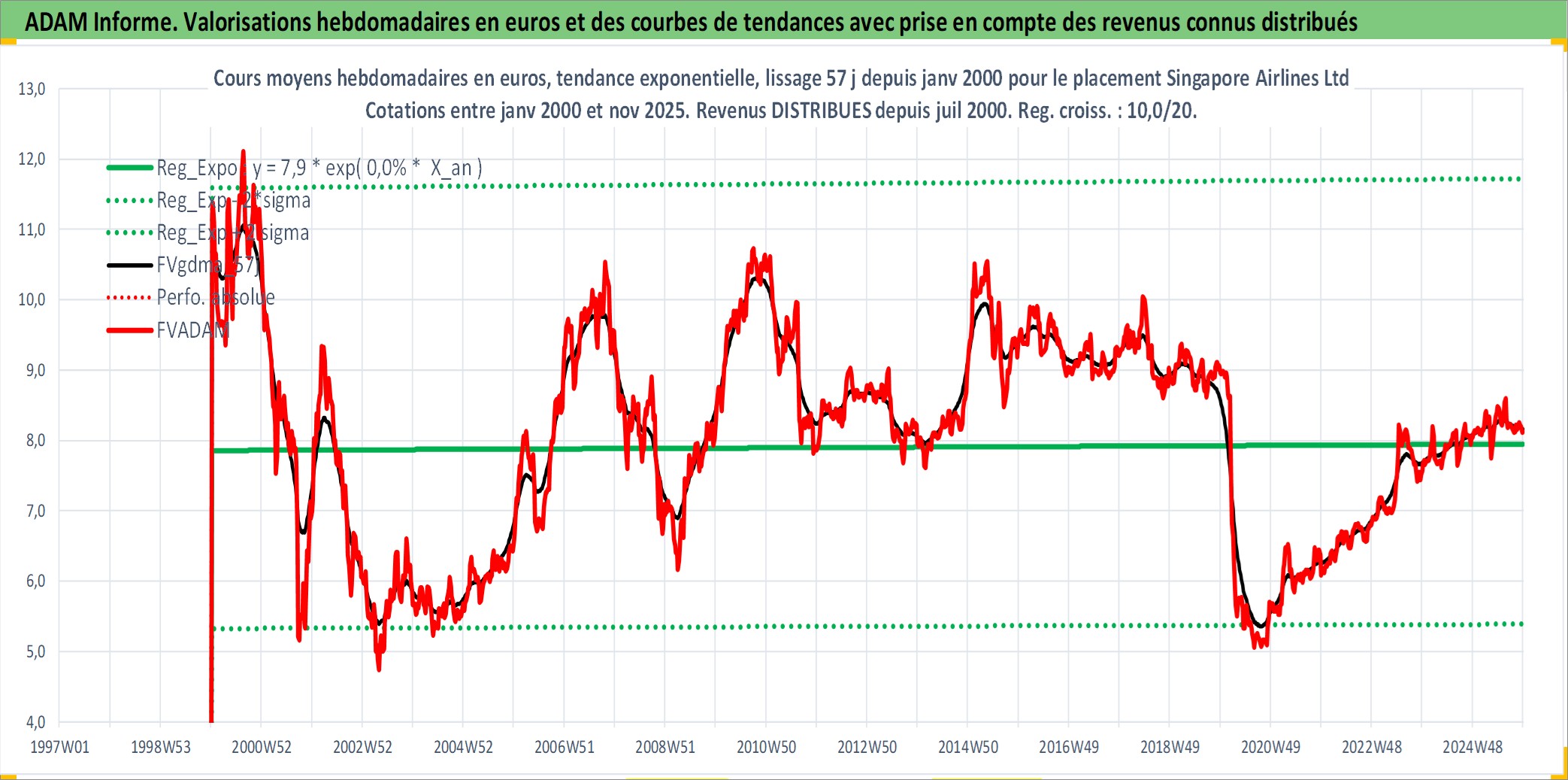 Site dédié aux investisseursPage dédiée sur site financeAnalyse des valorisations hebdomadaires de l'action Singapore Airlines Ltd. Cet actif est cote en SGD. Les valorisations sont en contrevaleur EURO et couvrent les semaines 2000W01 a 2025W48. Les revenus de cet actif financier sont pris en compte depuis la semaine 2000W29. La note globale ESG de cet actif est estimee a 7.0 (apres rebasage entre 0 et 20).