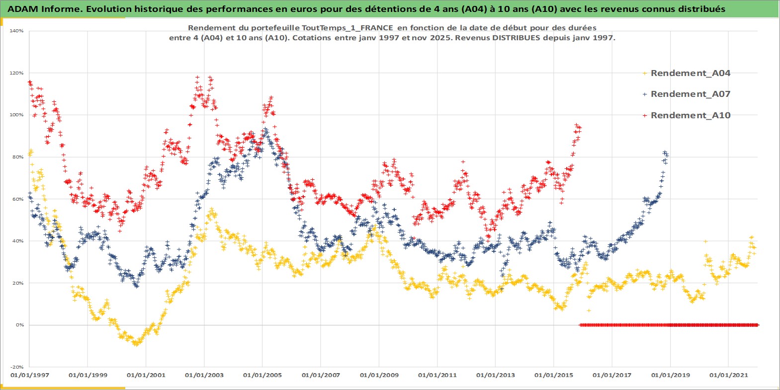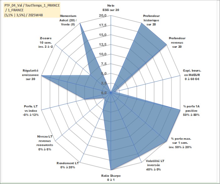 Site dédié aux investisseursPage dédiée sur site financeAnalyse des valorisations hebdomadaires du portefeuille ToutTemps_1_FRANCE_4actifs avec un profil P6_PurActions. Ce portefeuille est cote en EUR. Les valorisations couvrent les semaines 1997W01 a 2025W48. Les revenus de cet actif financier sont pris en compte depuis la semaine 1997W01. La note ESG de cet actif n'est pas connue.