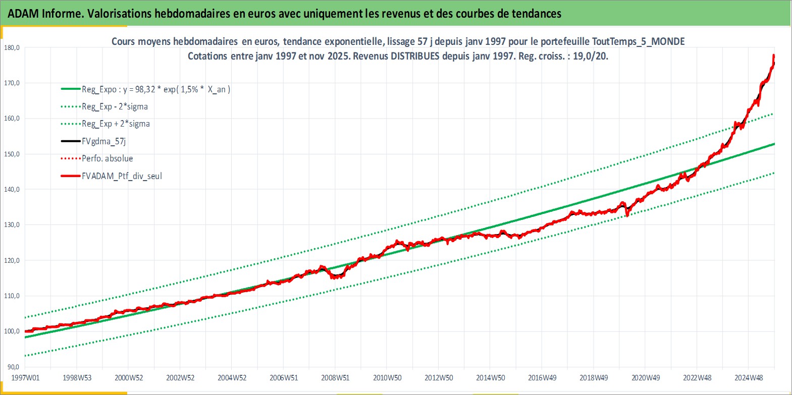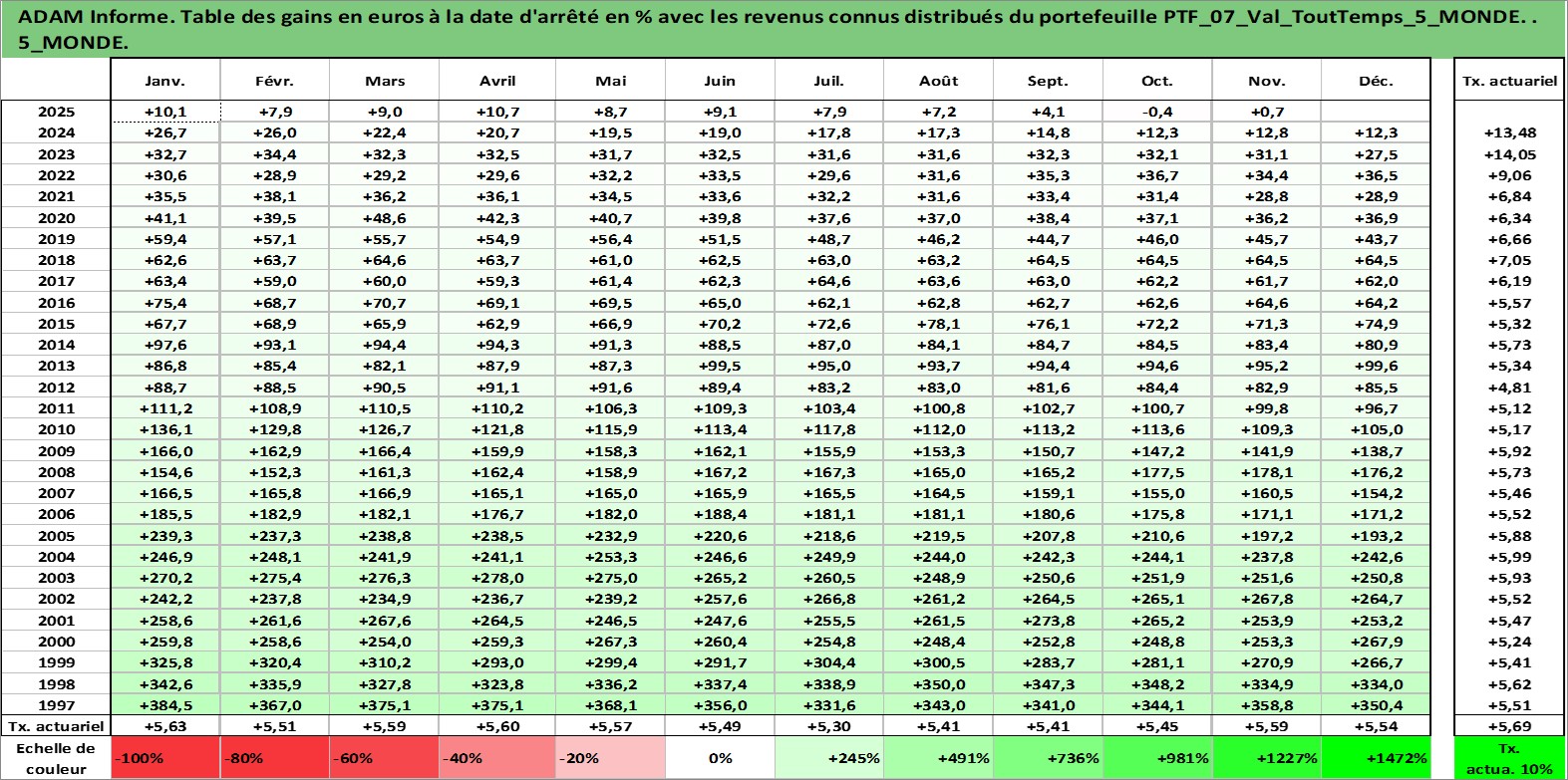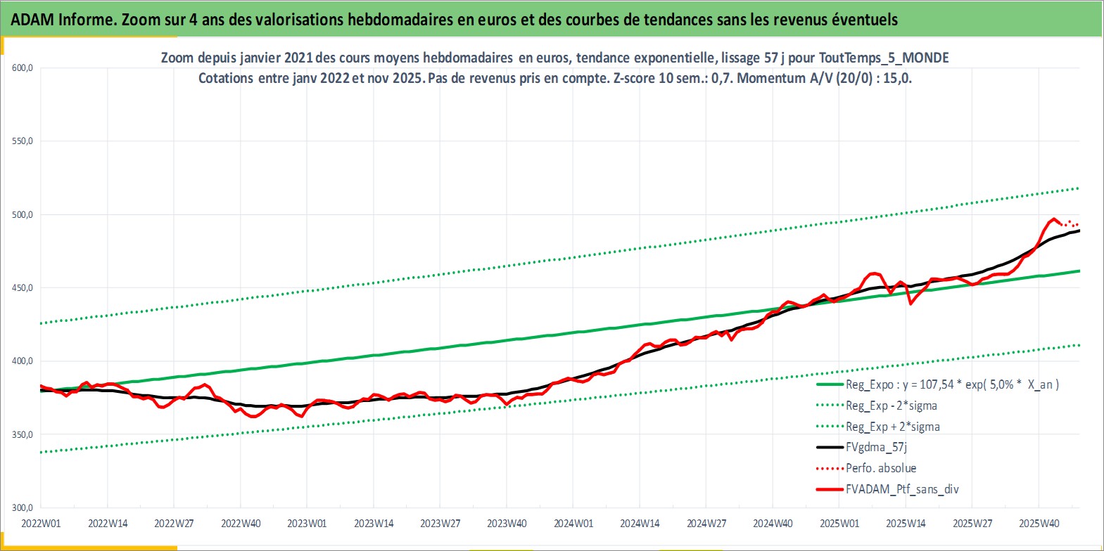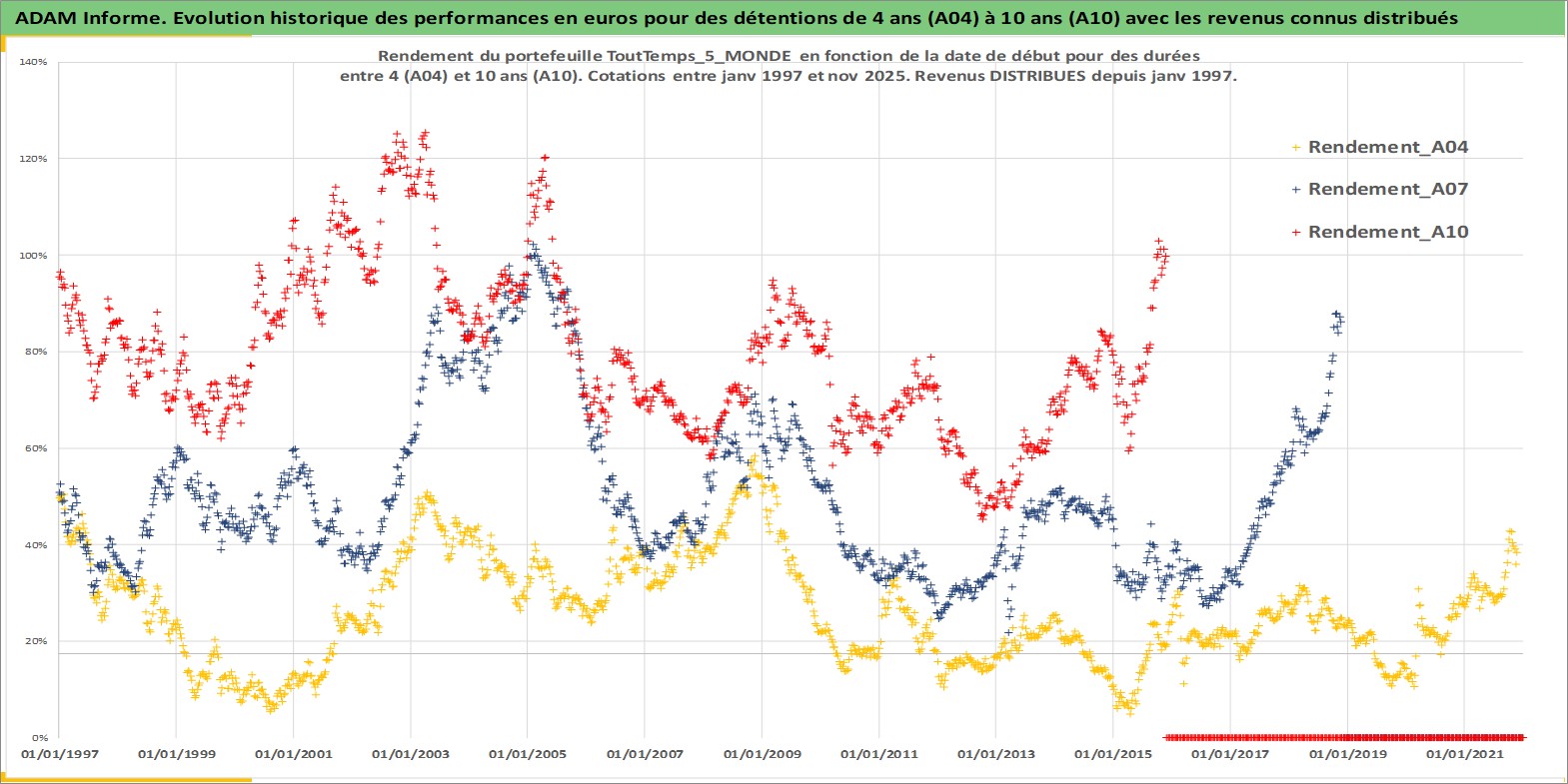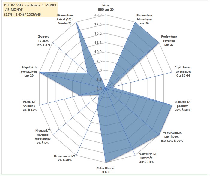 Site dédié aux investisseursPage dédiée sur site financeAnalyse des valorisations hebdomadaires du portefeuille ToutTemps_5_MONDE_7actifs avec un profil P6_PurActions. Ce portefeuille est cote en EUR. Les valorisations couvrent les semaines 1997W01 a 2025W48. Les revenus de cet actif financier sont pris en compte depuis la semaine 1997W01. La note ESG de cet actif n'est pas connue.