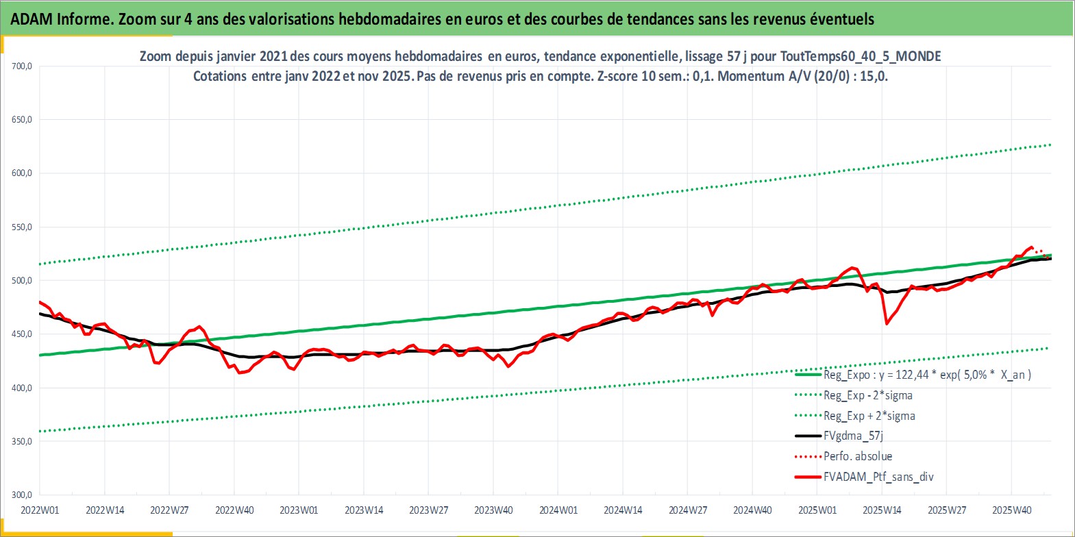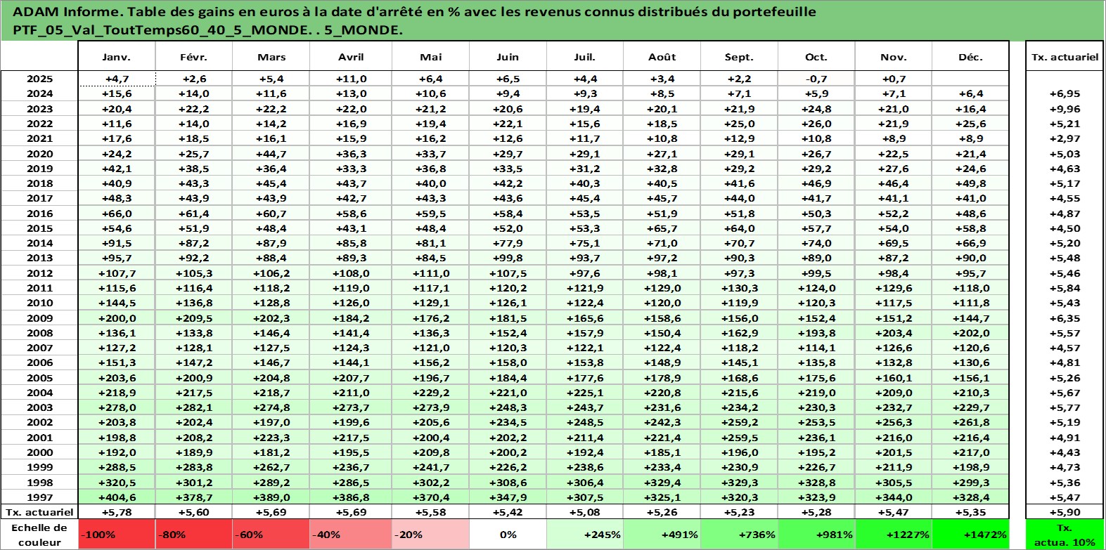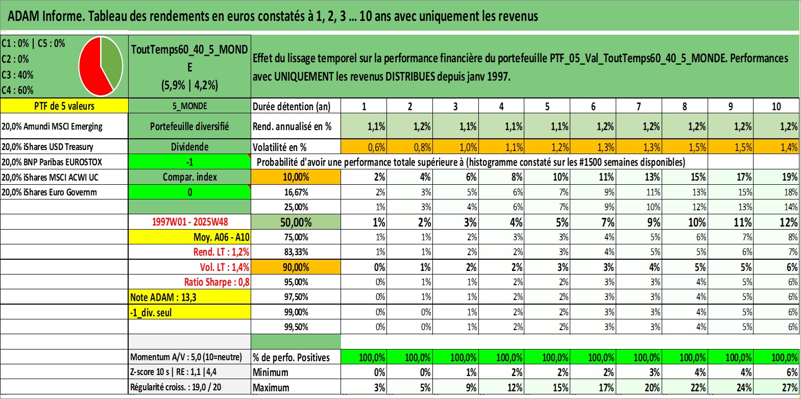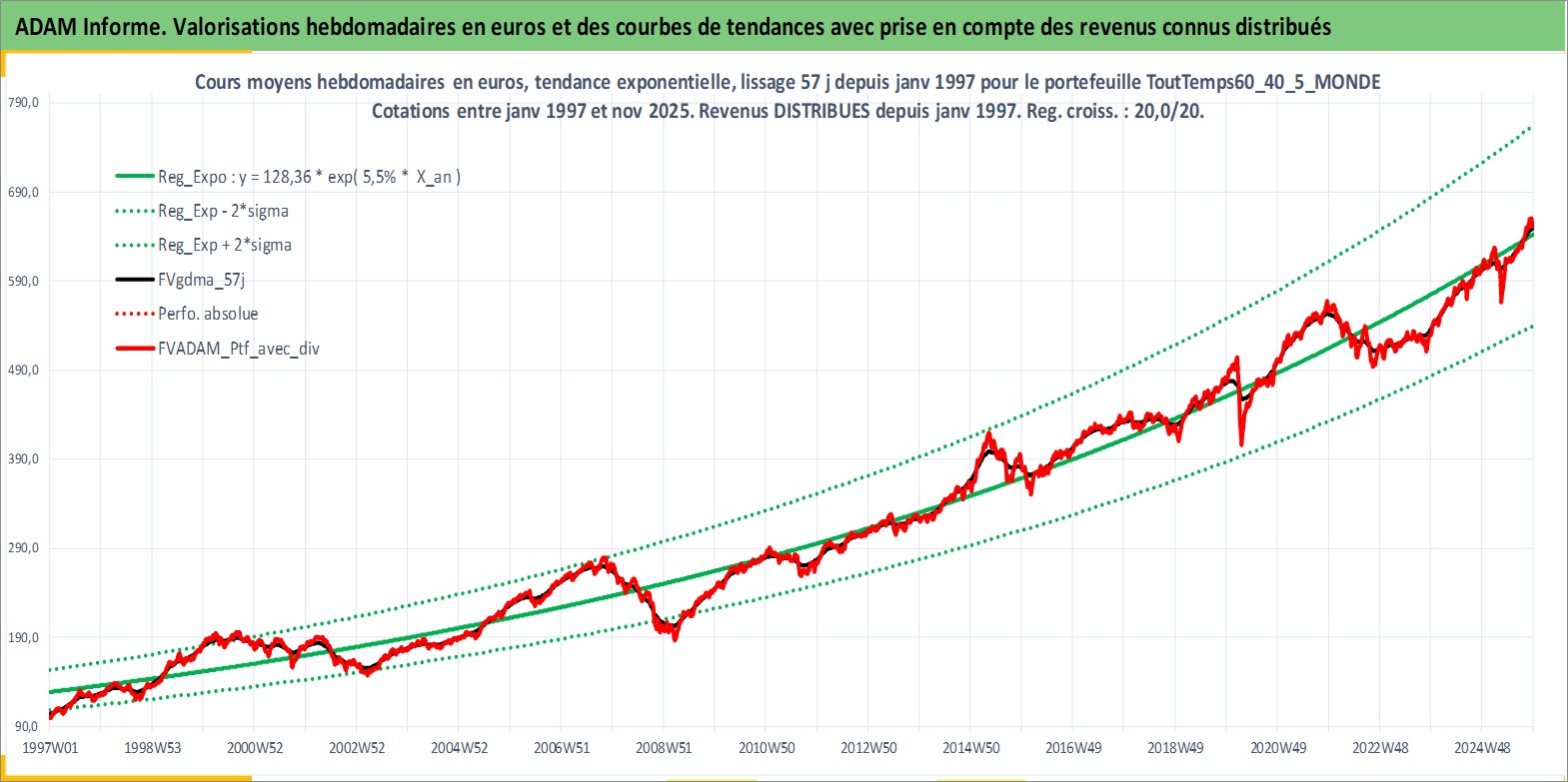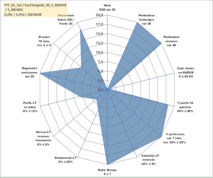 Site dédié aux investisseursPage dédiée sur site financeAnalyse des valorisations hebdomadaires du portefeuille ToutTemps60_40_5_MONDE_5actifs avec un profil P6_PurActions. Ce portefeuille est cote en EUR. Les valorisations couvrent les semaines 1997W01 a 2025W48. Les revenus de cet actif financier sont pris en compte depuis la semaine 1997W01. La note ESG de cet actif n'est pas connue.