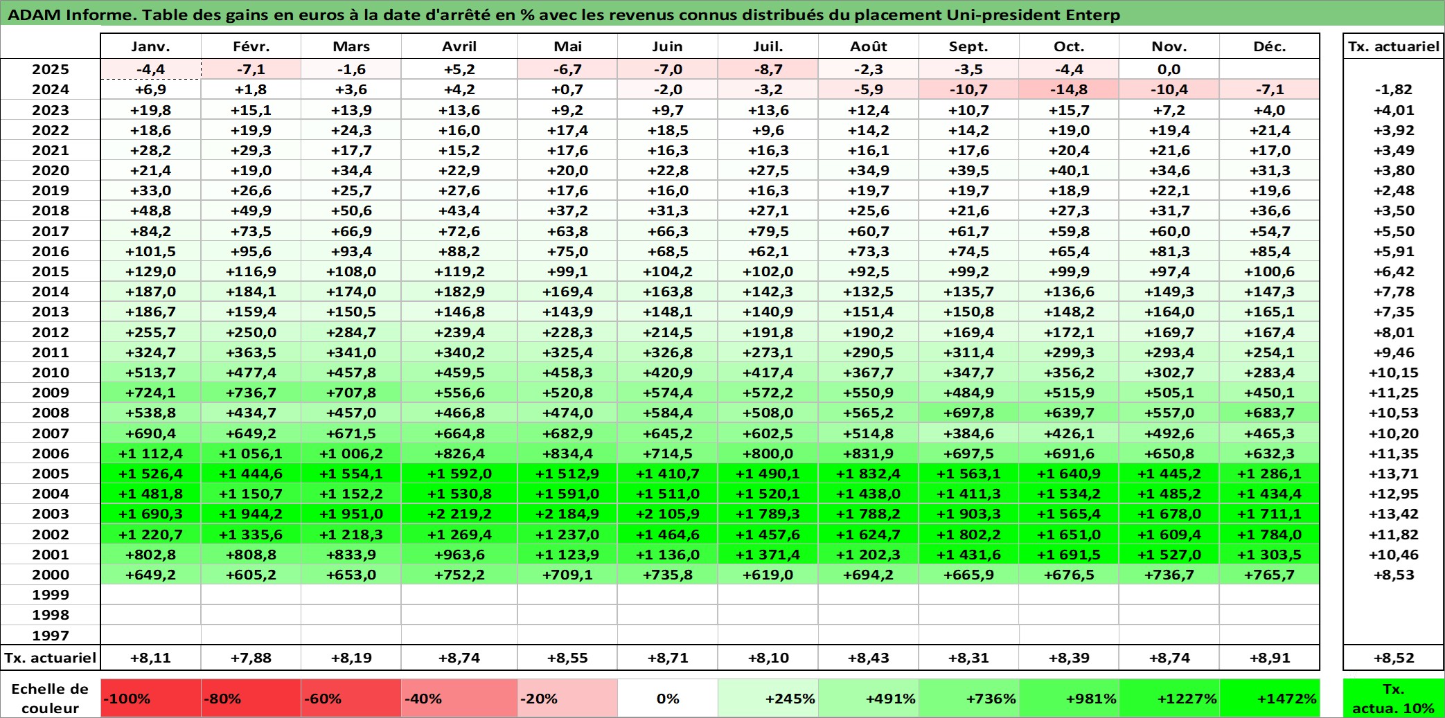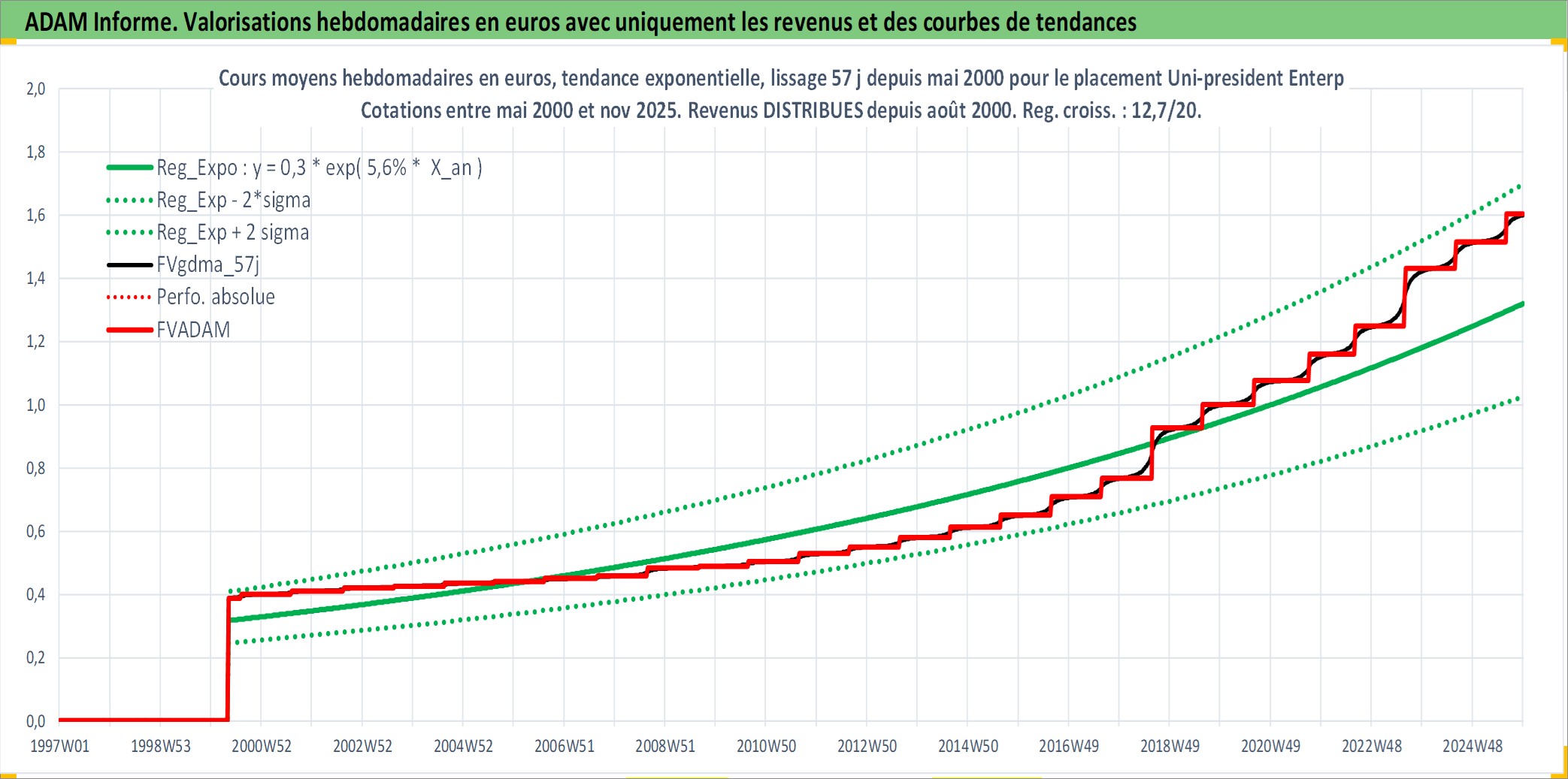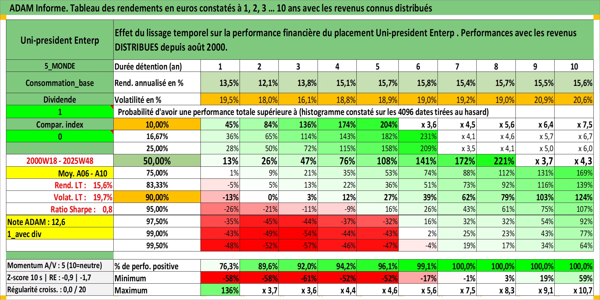 Site dédié aux investisseursPage dédiée sur site financeAnalyse des valorisations hebdomadaires de l'action Uni-president Enterp . Cet actif est cote en TWD. Les valorisations sont en contrevaleur EURO et couvrent les semaines 2000W18 a 2025W48. Les revenus de cet actif financier sont pris en compte depuis la semaine 2000W31. La note globale ESG de cet actif est estimee a 6.0 (apres rebasage entre 0 et 20).