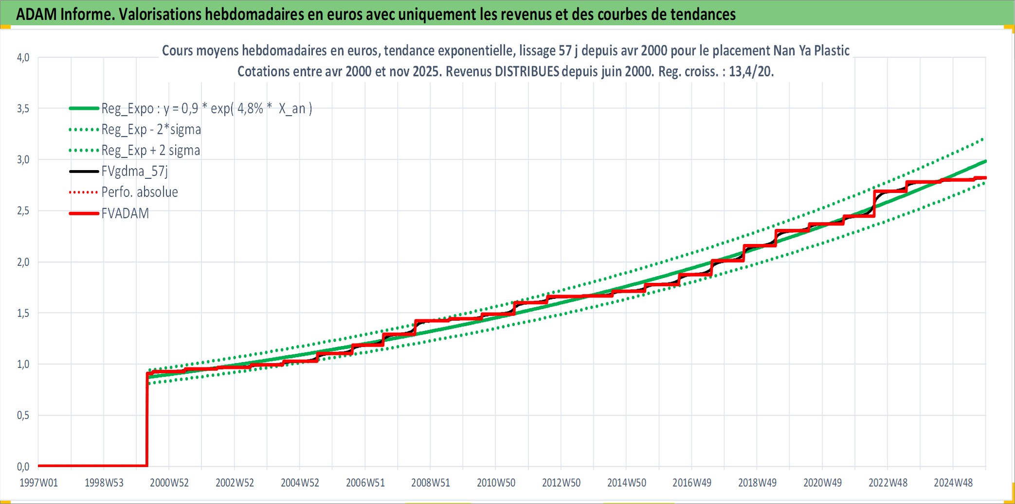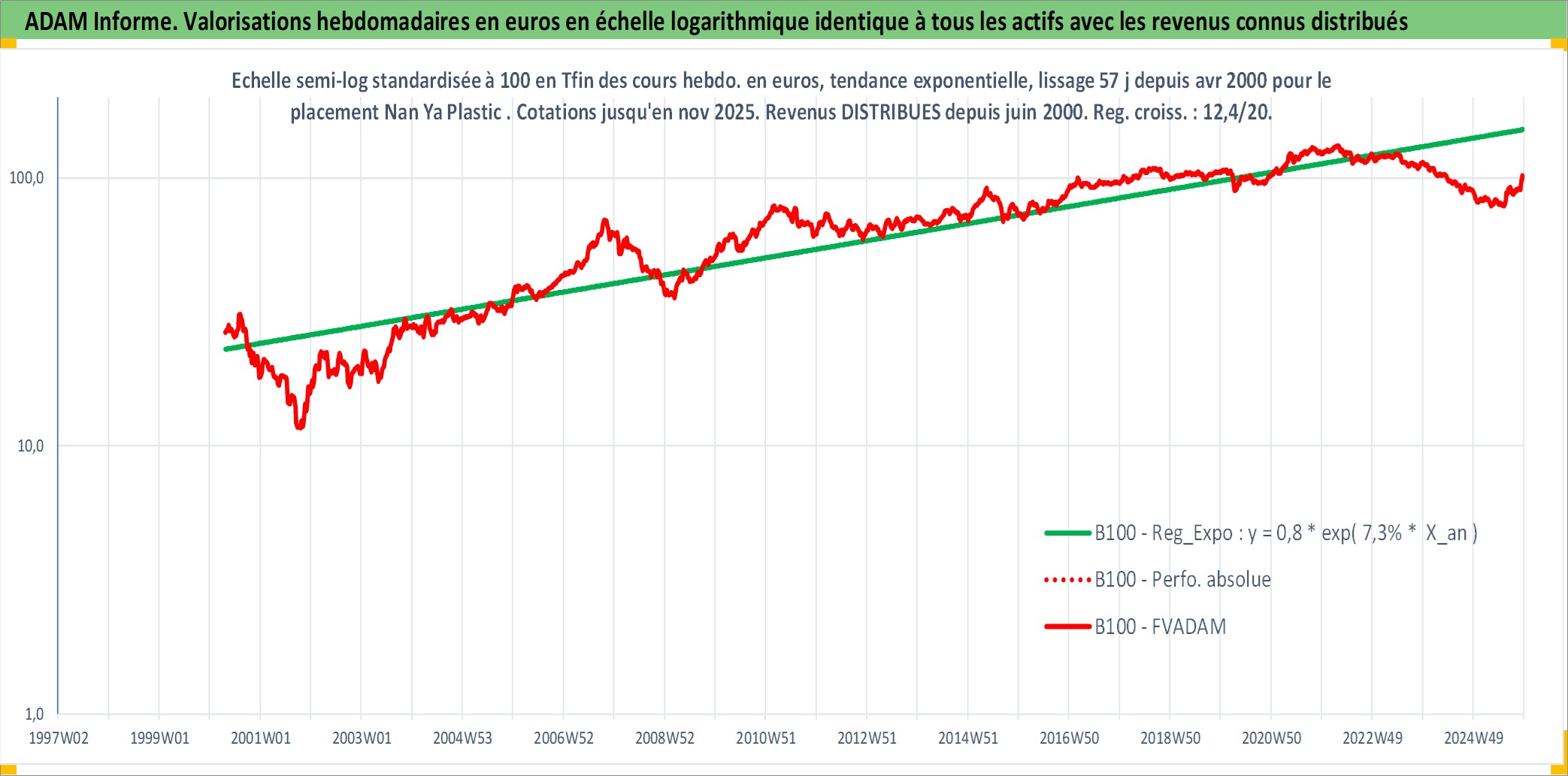 Site dédié aux investisseursPage dédiée sur site financeAnalyse des valorisations hebdomadaires de l'action Nan Ya Plastic . Cet actif est cote en TWD. Les valorisations sont en contrevaleur EURO et couvrent les semaines 2000W17 a 2025W48. Les revenus de cet actif financier sont pris en compte depuis la semaine 2000W26. La note globale ESG de cet actif est estimee a 7.0 (apres rebasage entre 0 et 20).