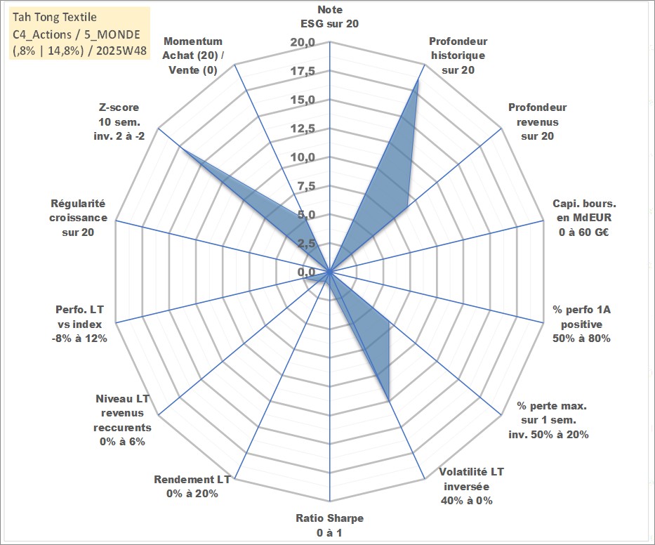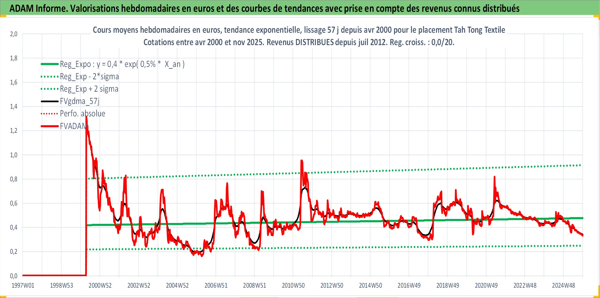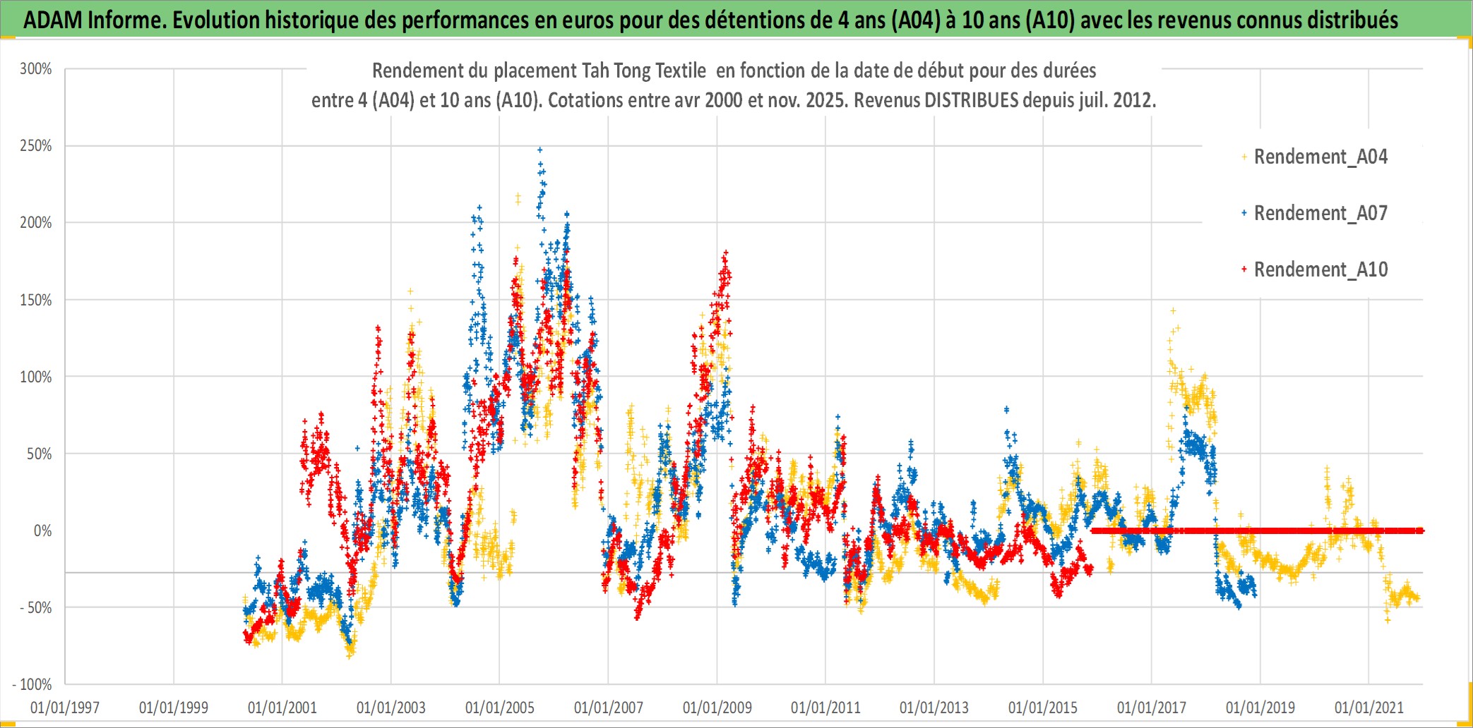 Site dédié aux investisseursPage dédiée sur site financeAnalyse des valorisations hebdomadaires de l'action Tah Tong Textile . Cet actif est cote en TWD. Les valorisations sont en contrevaleur EURO et couvrent les semaines 2000W15 a 2025W48. Les revenus de cet actif financier sont pris en compte depuis la semaine 2012W27. La note ESG de cet actif n'est pas connue.