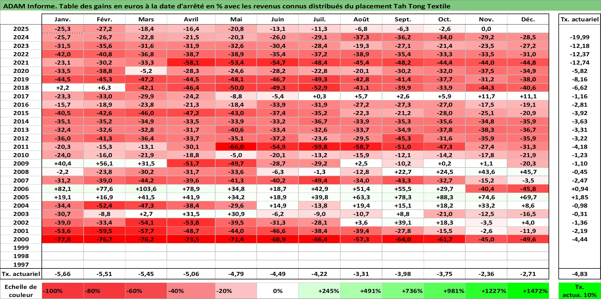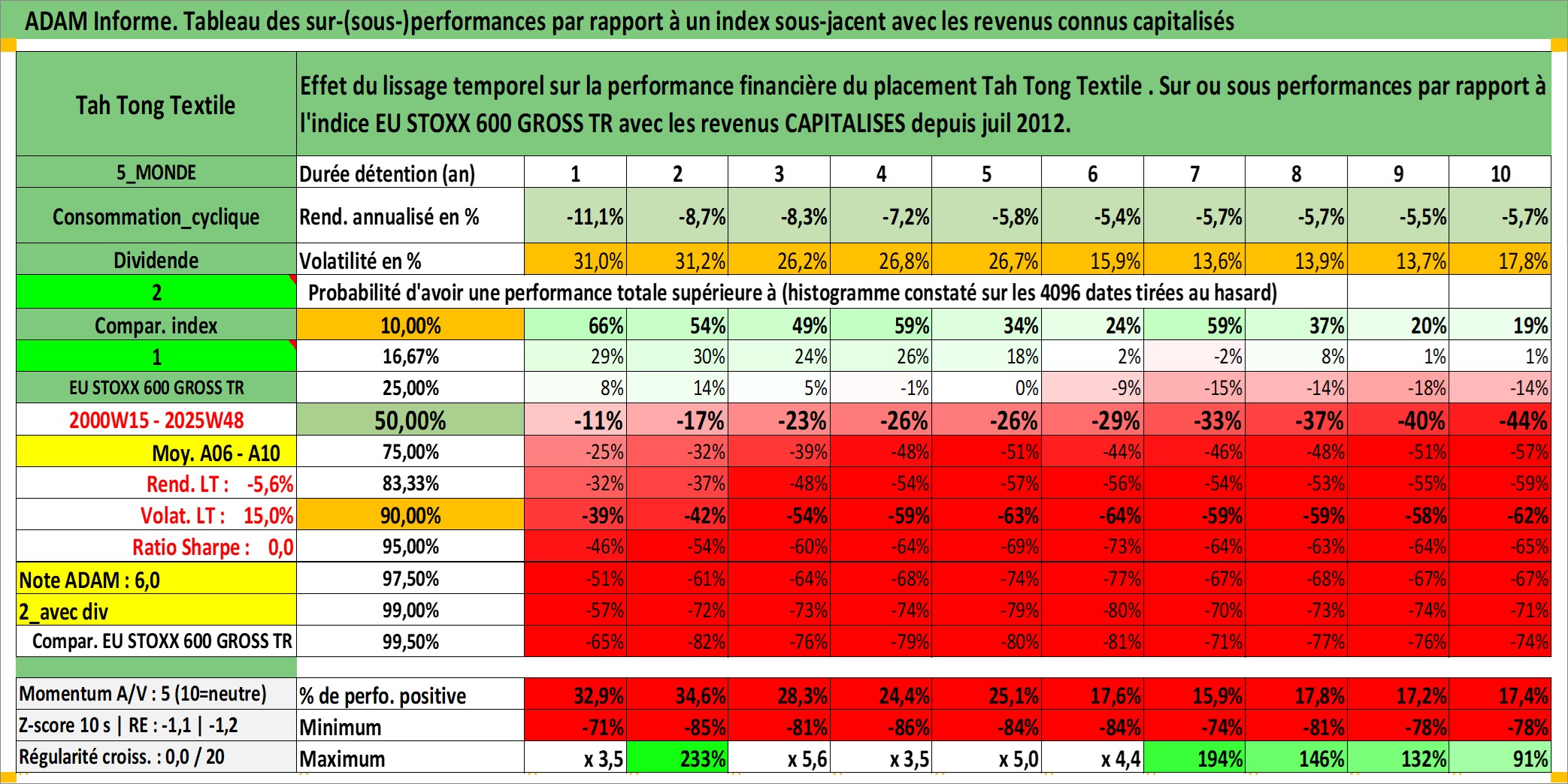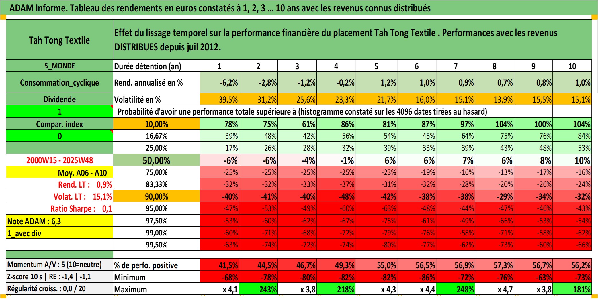 Site dédié aux investisseursPage dédiée sur site financeAnalyse des valorisations hebdomadaires de l'action Tah Tong Textile . Cet actif est cote en TWD. Les valorisations sont en contrevaleur EURO et couvrent les semaines 2000W15 a 2025W48. Les revenus de cet actif financier sont pris en compte depuis la semaine 2012W27. La note ESG de cet actif n'est pas connue.