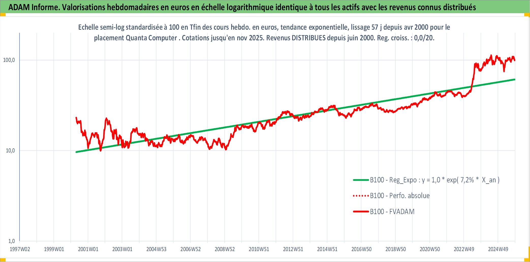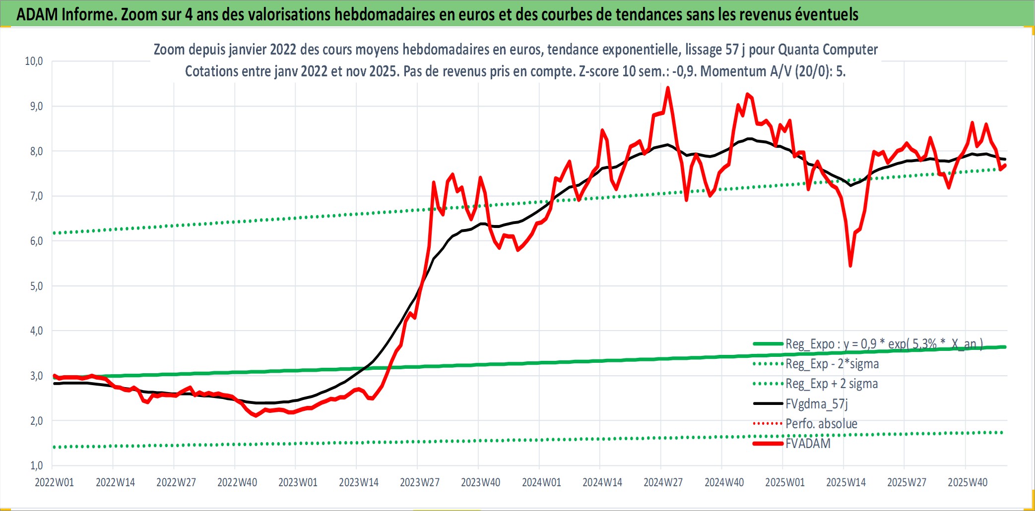 Site dédié aux investisseursPage dédiée sur site financeAnalyse des valorisations hebdomadaires de l'action Quanta Computer . Cet actif est cote en TWD. Les valorisations sont en contrevaleur EURO et couvrent les semaines 2000W17 a 2025W48. Les revenus de cet actif financier sont pris en compte depuis la semaine 2000W24. La note globale ESG de cet actif est estimee a 9.0 (apres rebasage entre 0 et 20).