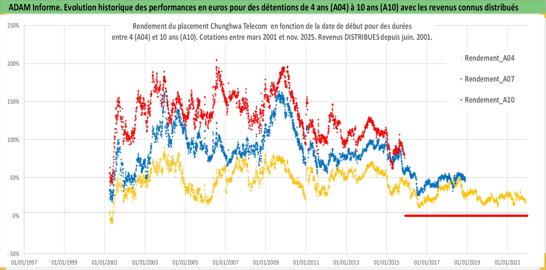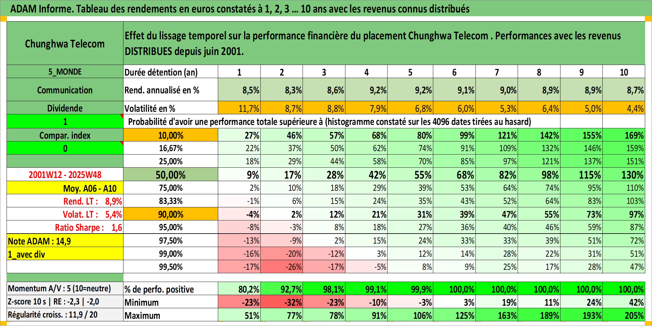 Site dédié aux investisseursPage dédiée sur site financeAnalyse des valorisations hebdomadaires de l'action Chunghwa Telecom . Cet actif est cote en TWD. Les valorisations sont en contrevaleur EURO et couvrent les semaines 2001W12 a 2025W48. Les revenus de cet actif financier sont pris en compte depuis la semaine 2001W25. La note globale ESG de cet actif est estimee a 12.0 (apres rebasage entre 0 et 20).