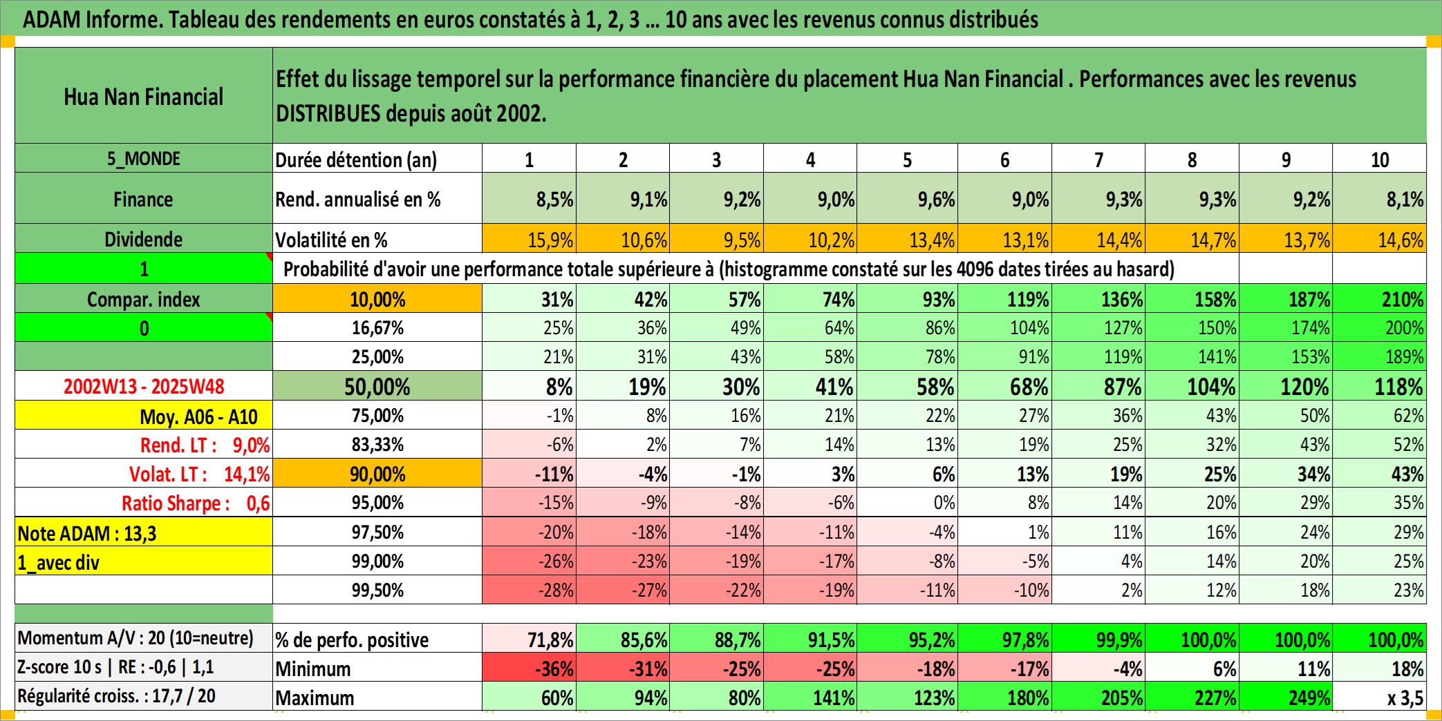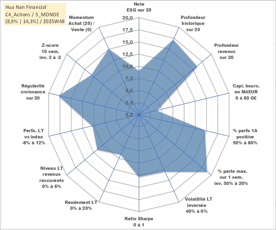 Site dédié aux investisseursPage dédiée sur site financeAnalyse des valorisations hebdomadaires de l'action Hua Nan Financial . Cet actif est cote en TWD. Les valorisations sont en contrevaleur EURO et couvrent les semaines 2002W13 a 2025W48. Les revenus de cet actif financier sont pris en compte depuis la semaine 2002W33. La note globale ESG de cet actif est estimee a 9.0 (apres rebasage entre 0 et 20).