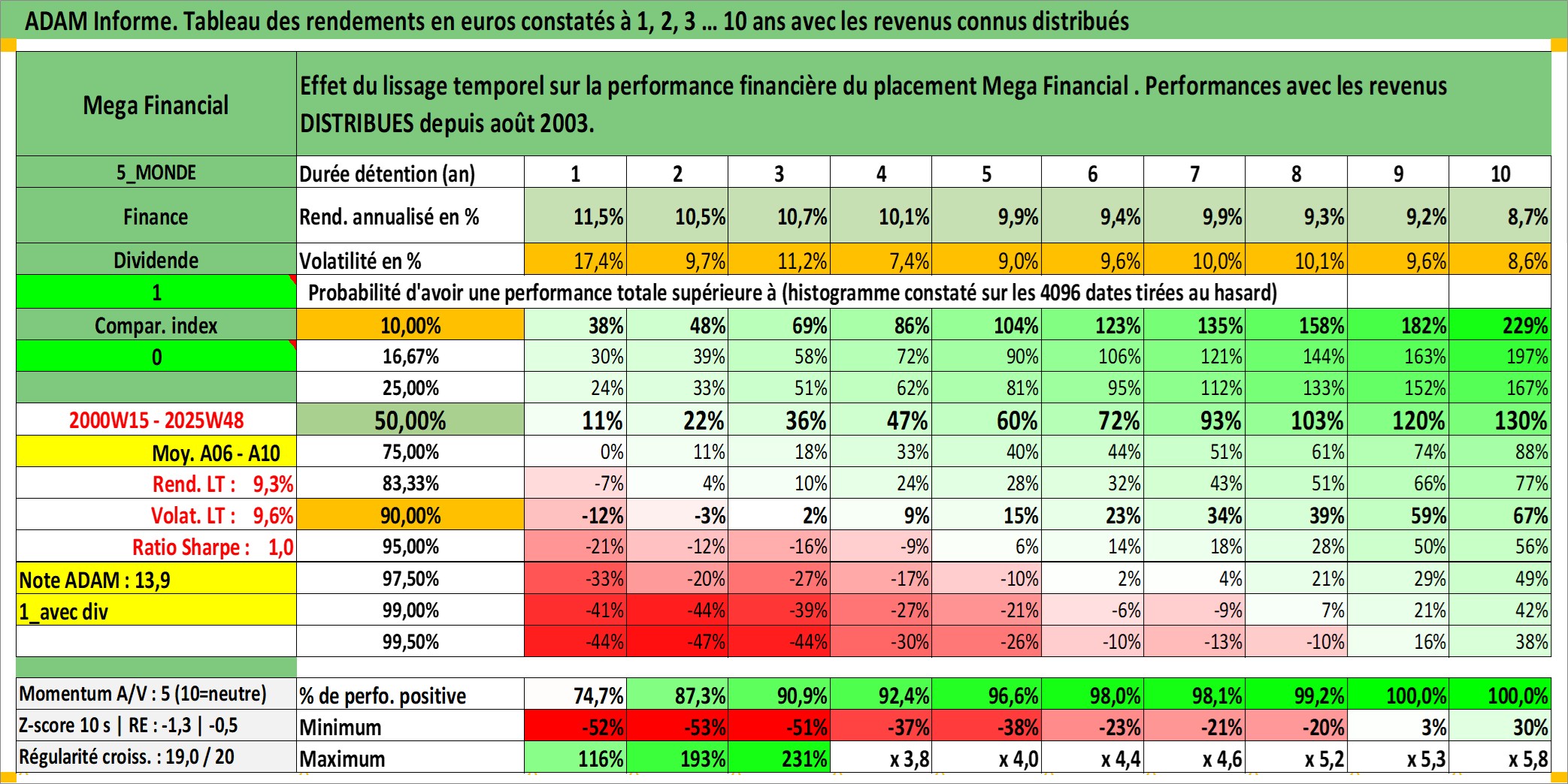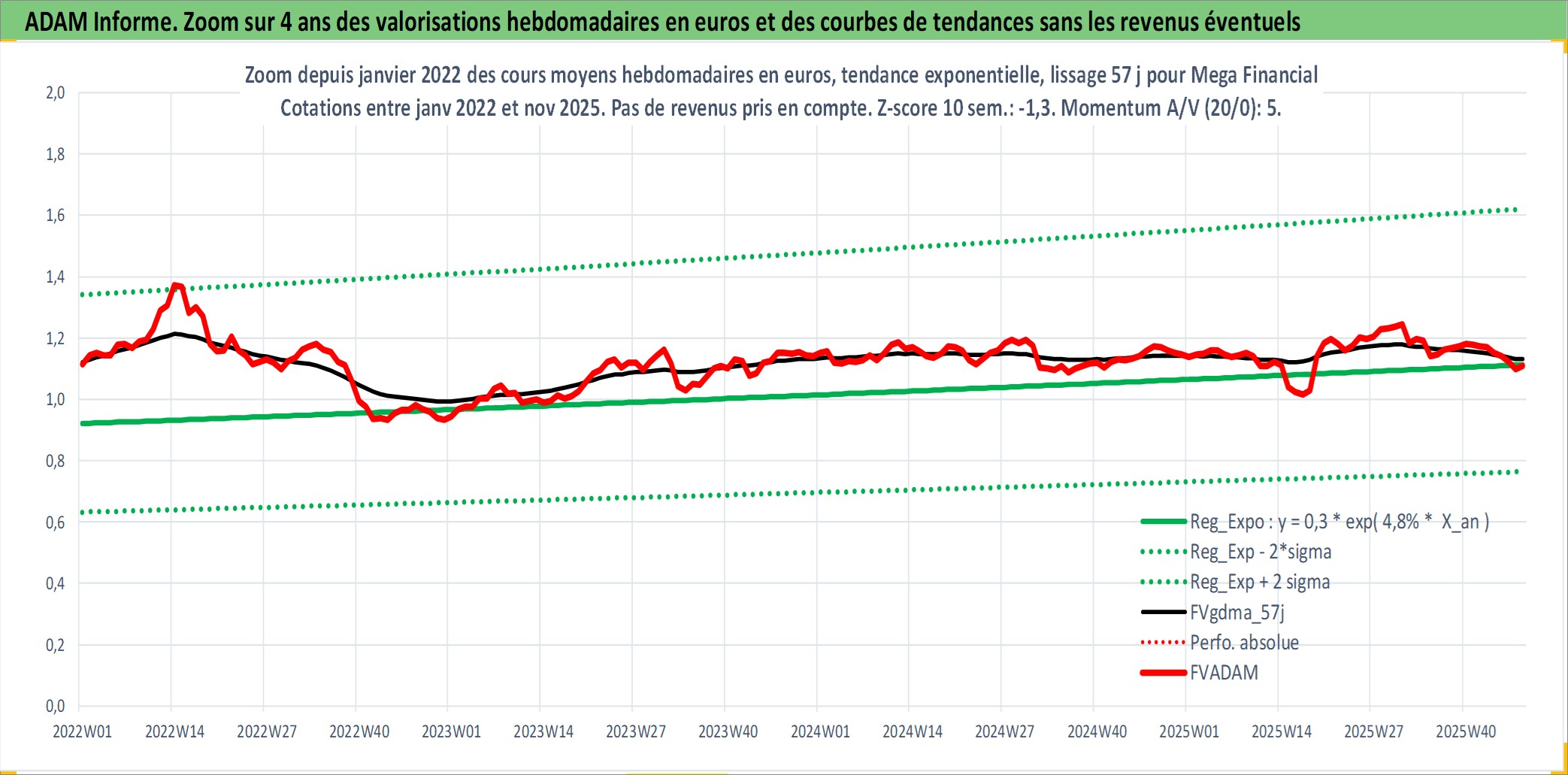 Site dédié aux investisseursPage dédiée sur site financeAnalyse des valorisations hebdomadaires de l'action Mega Financial . Cet actif est cote en TWD. Les valorisations sont en contrevaleur EURO et couvrent les semaines 2000W15 a 2025W48. Les revenus de cet actif financier sont pris en compte depuis la semaine 2003W32. La note globale ESG de cet actif est estimee a 8.0 (apres rebasage entre 0 et 20).