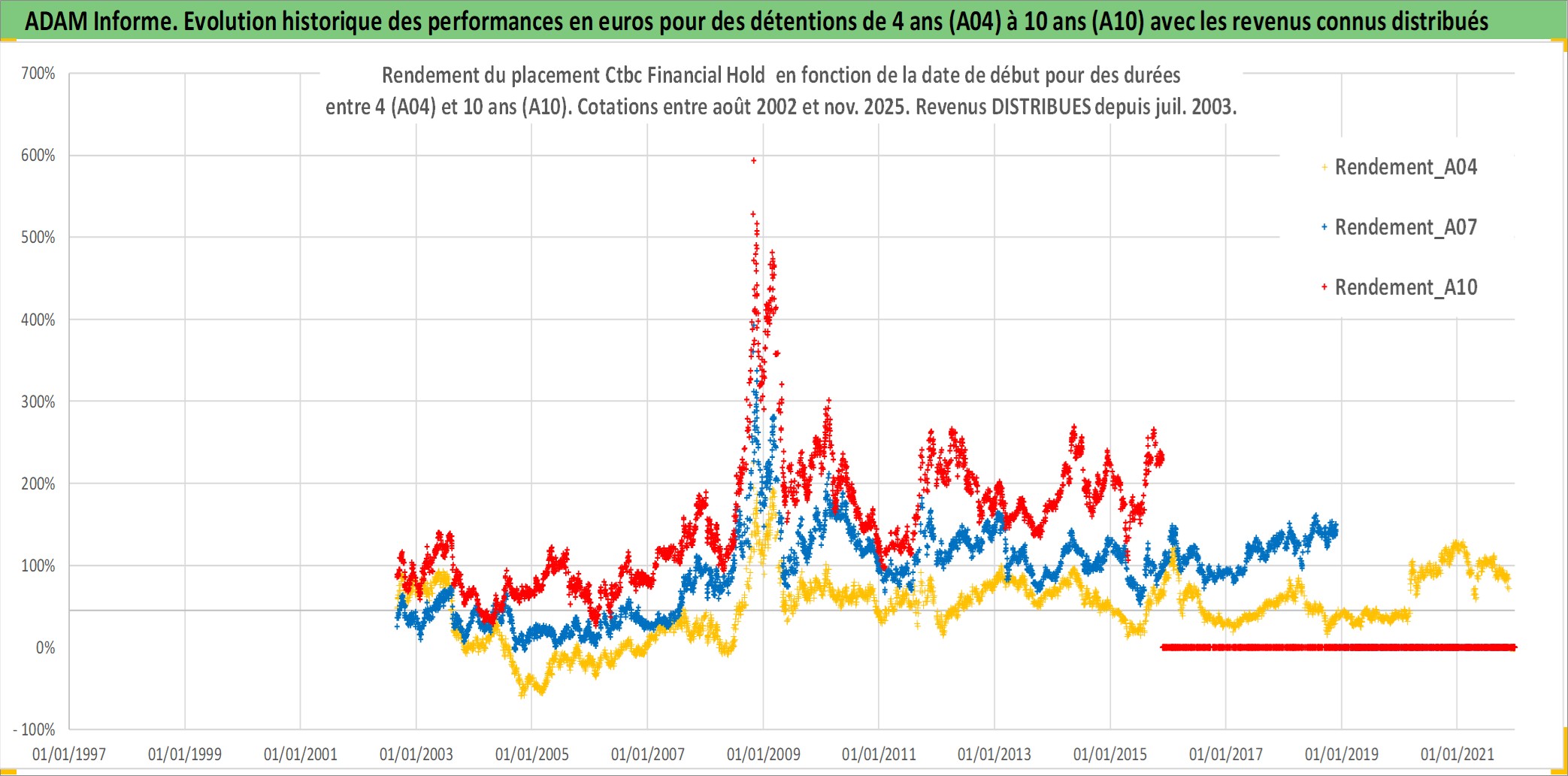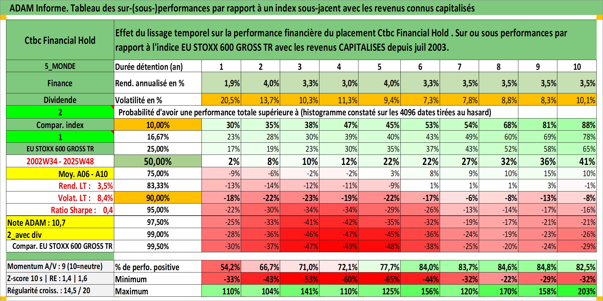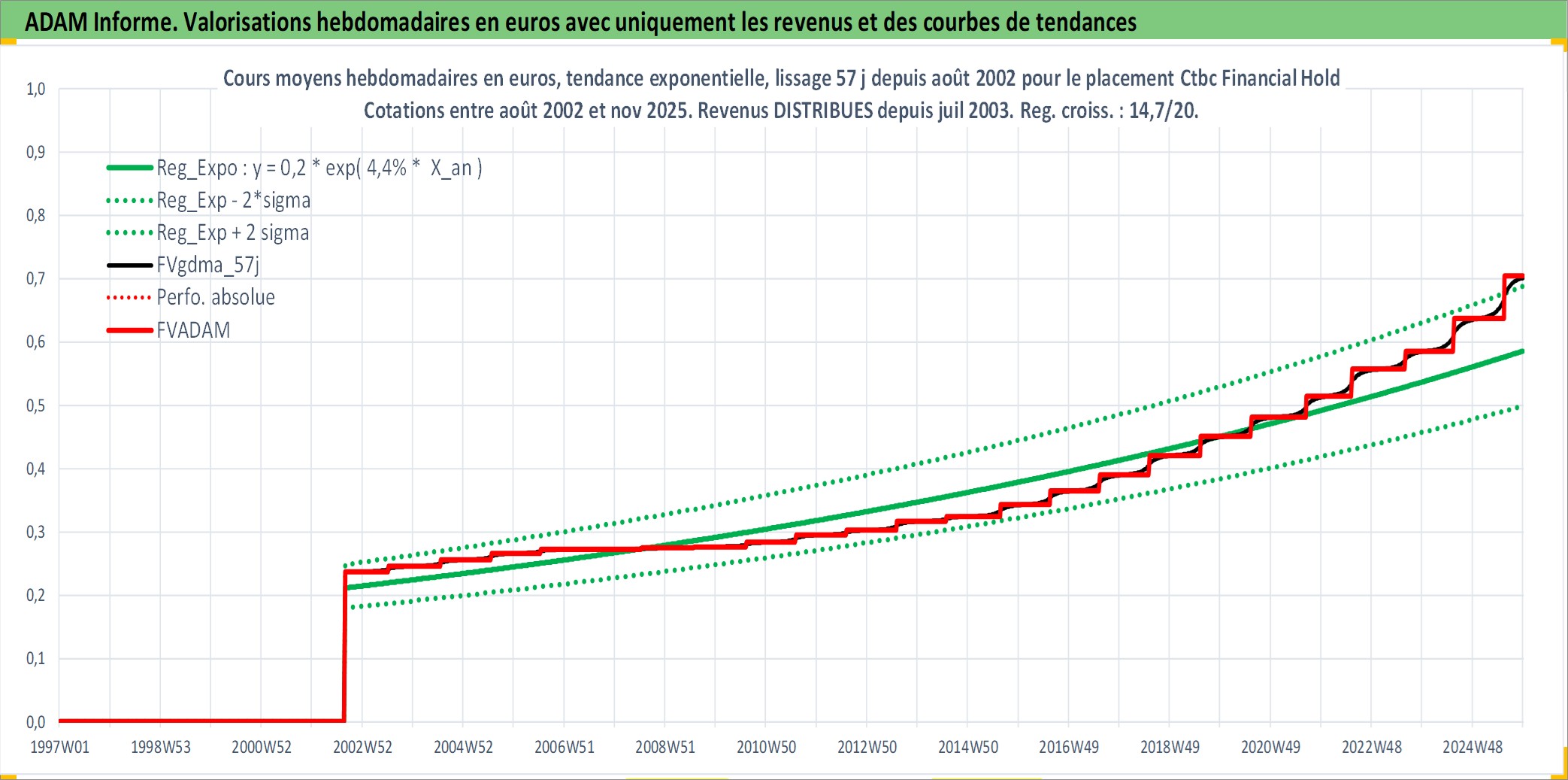 Site dédié aux investisseursPage dédiée sur site financeAnalyse des valorisations hebdomadaires de l'action Ctbc Financial Hold . Cet actif est cote en TWD. Les valorisations sont en contrevaleur EURO et couvrent les semaines 2002W34 a 2025W48. Les revenus de cet actif financier sont pris en compte depuis la semaine 2003W27. La note globale ESG de cet actif est estimee a 10.0 (apres rebasage entre 0 et 20).