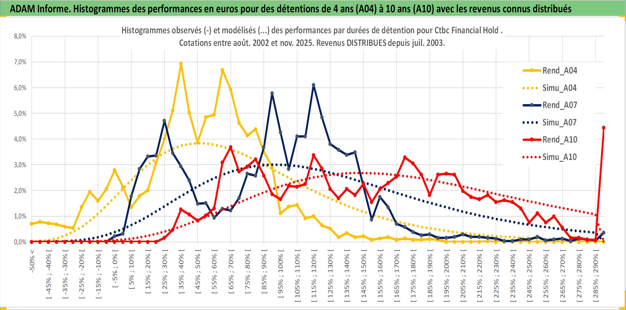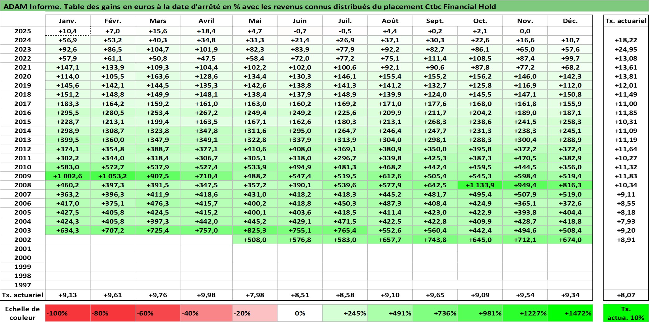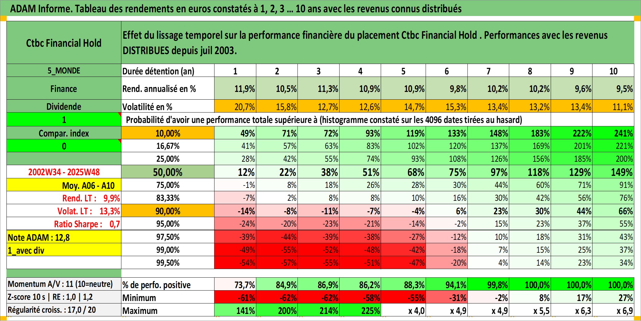 Site dédié aux investisseursPage dédiée sur site financeAnalyse des valorisations hebdomadaires de l'action Ctbc Financial Hold . Cet actif est cote en TWD. Les valorisations sont en contrevaleur EURO et couvrent les semaines 2002W34 a 2025W48. Les revenus de cet actif financier sont pris en compte depuis la semaine 2003W27. La note globale ESG de cet actif est estimee a 10.0 (apres rebasage entre 0 et 20).