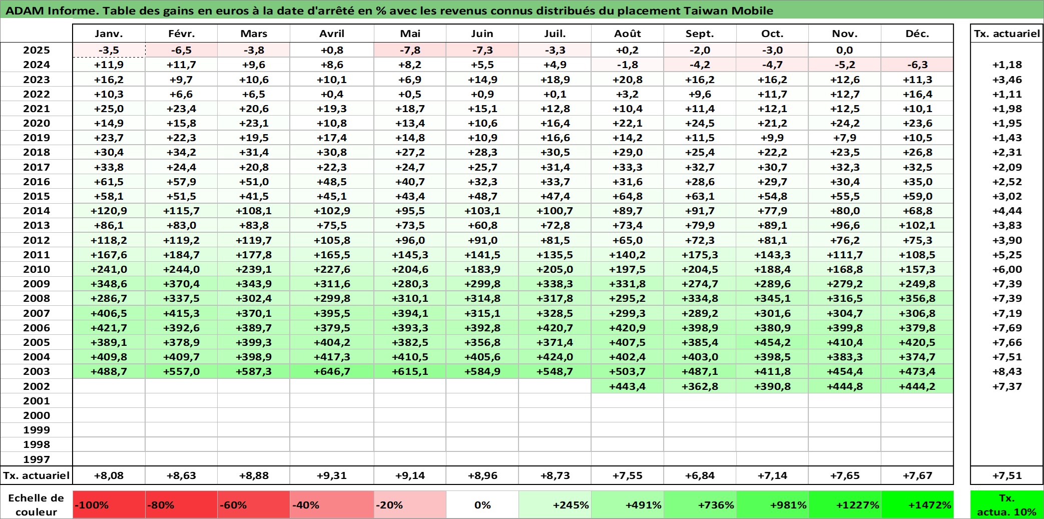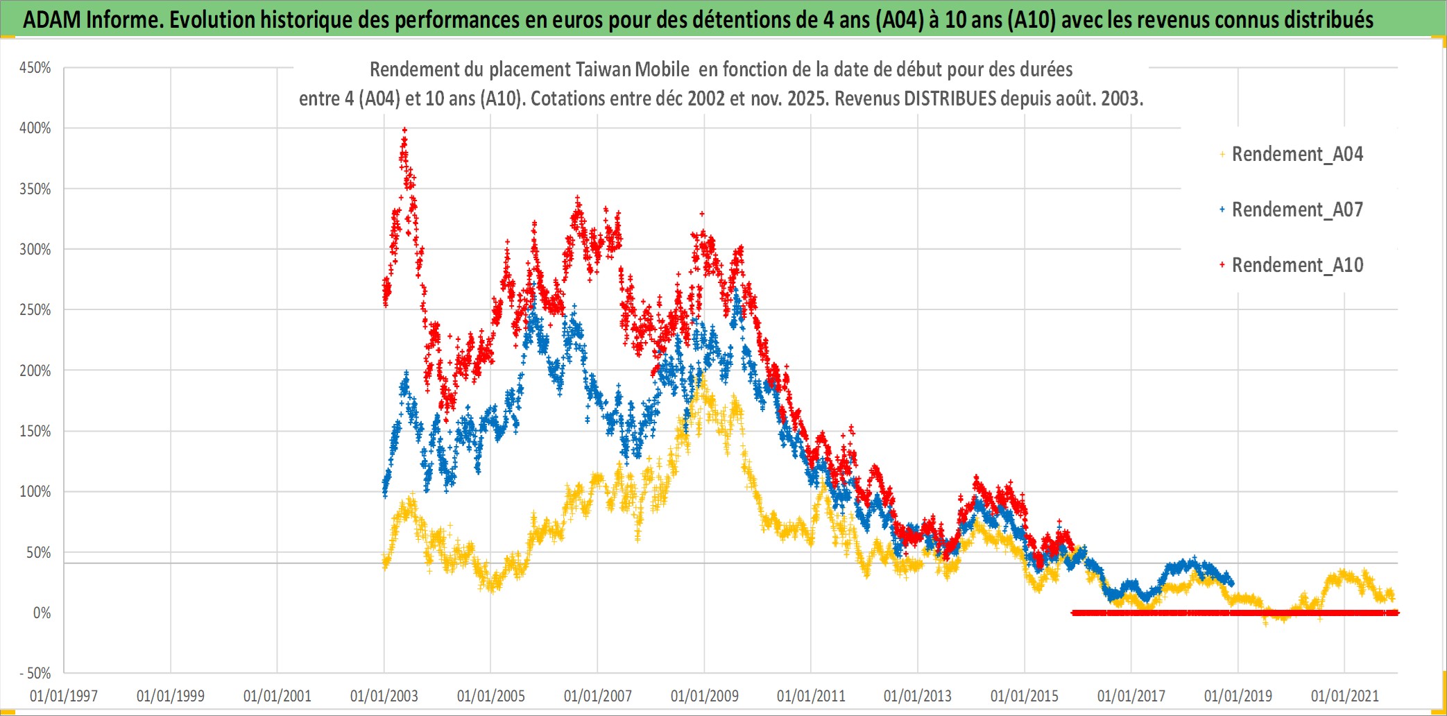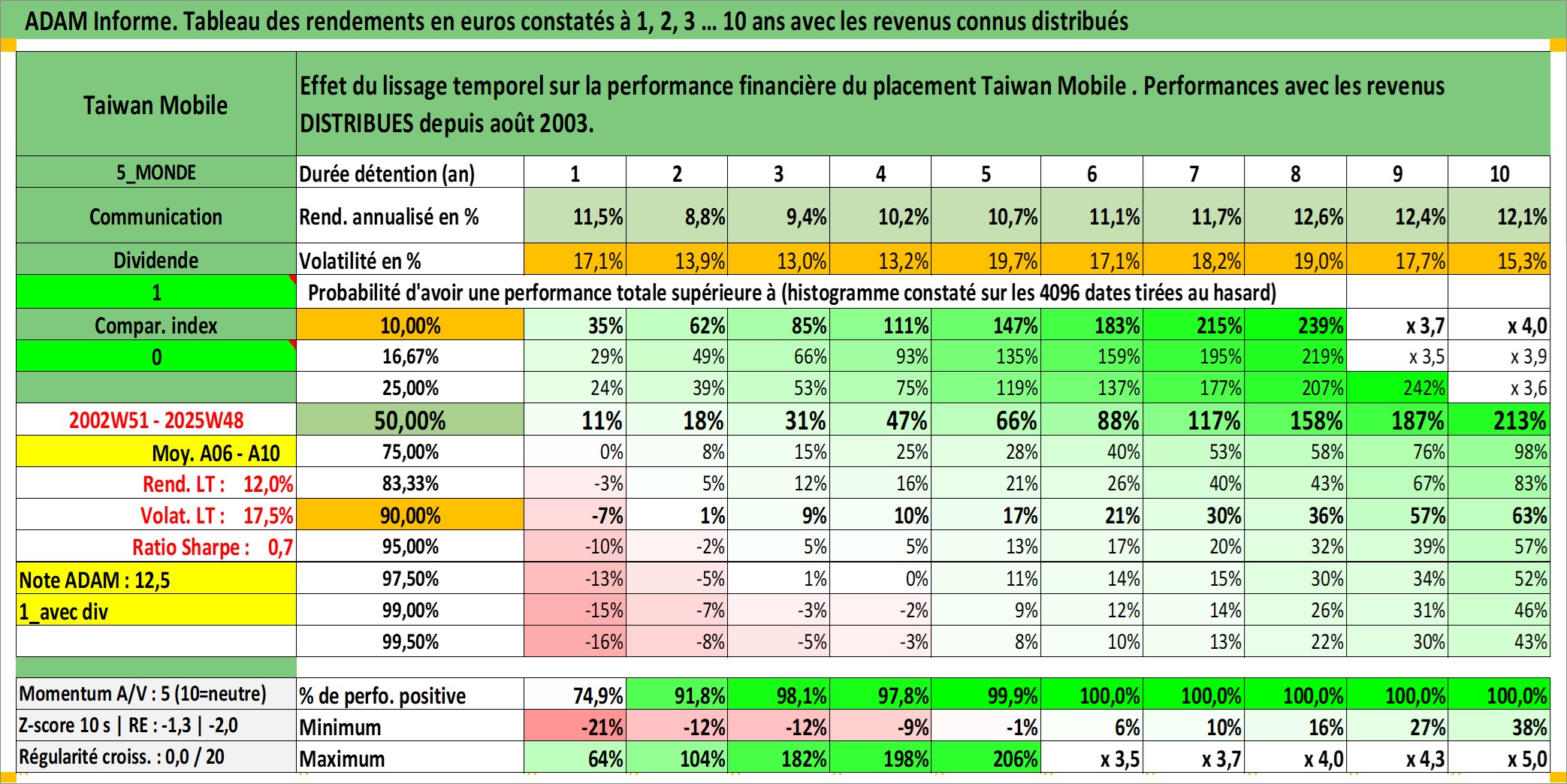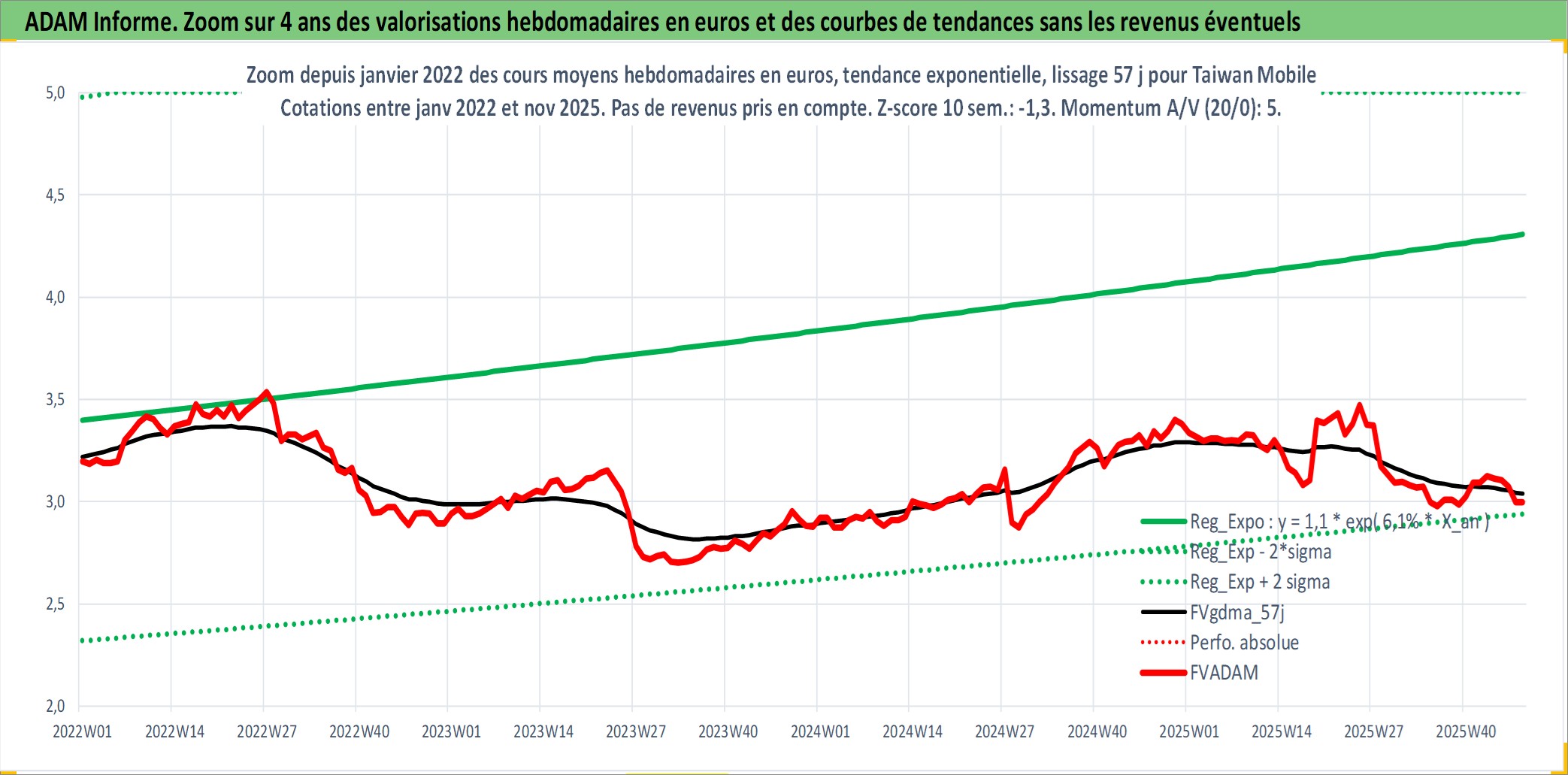Site dédié aux investisseursPage dédiée sur site financeAnalyse des valorisations hebdomadaires de l'action Taiwan Mobile . Cet actif est cote en TWD. Les valorisations sont en contrevaleur EURO et couvrent les semaines 2002W51 a 2025W48. Les revenus de cet actif financier sont pris en compte depuis la semaine 2003W33. La note globale ESG de cet actif est estimee a 11.0 (apres rebasage entre 0 et 20).