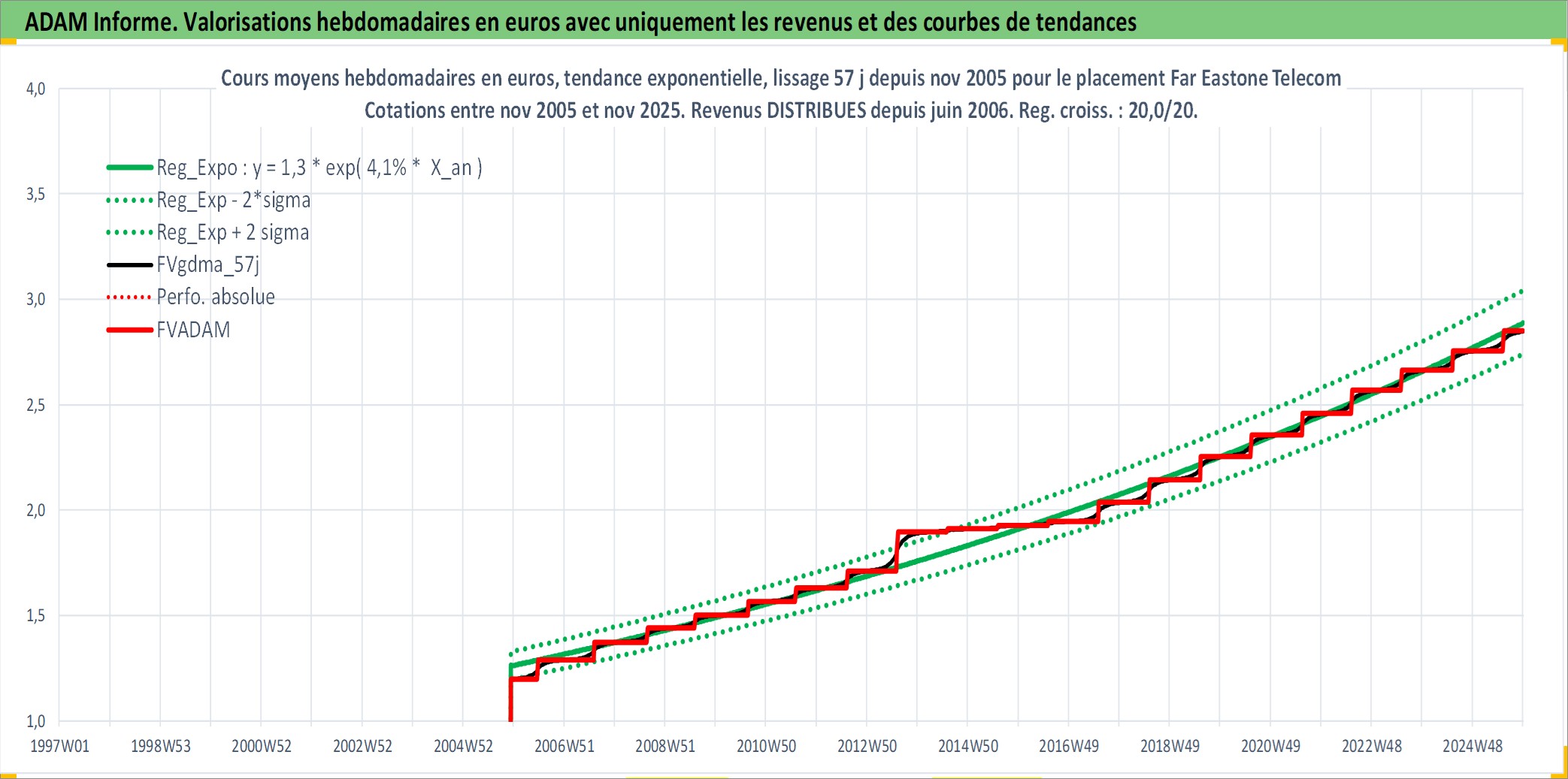 Site dédié aux investisseursPage dédiée sur site financeAnalyse des valorisations hebdomadaires de l'action Far Eastone Telecom . Cet actif est cote en TWD. Les valorisations sont en contrevaleur EURO et couvrent les semaines 2005W48 a 2025W48. Les revenus de cet actif financier sont pris en compte depuis la semaine 2006W24. La note globale ESG de cet actif est estimee a 10.0 (apres rebasage entre 0 et 20).