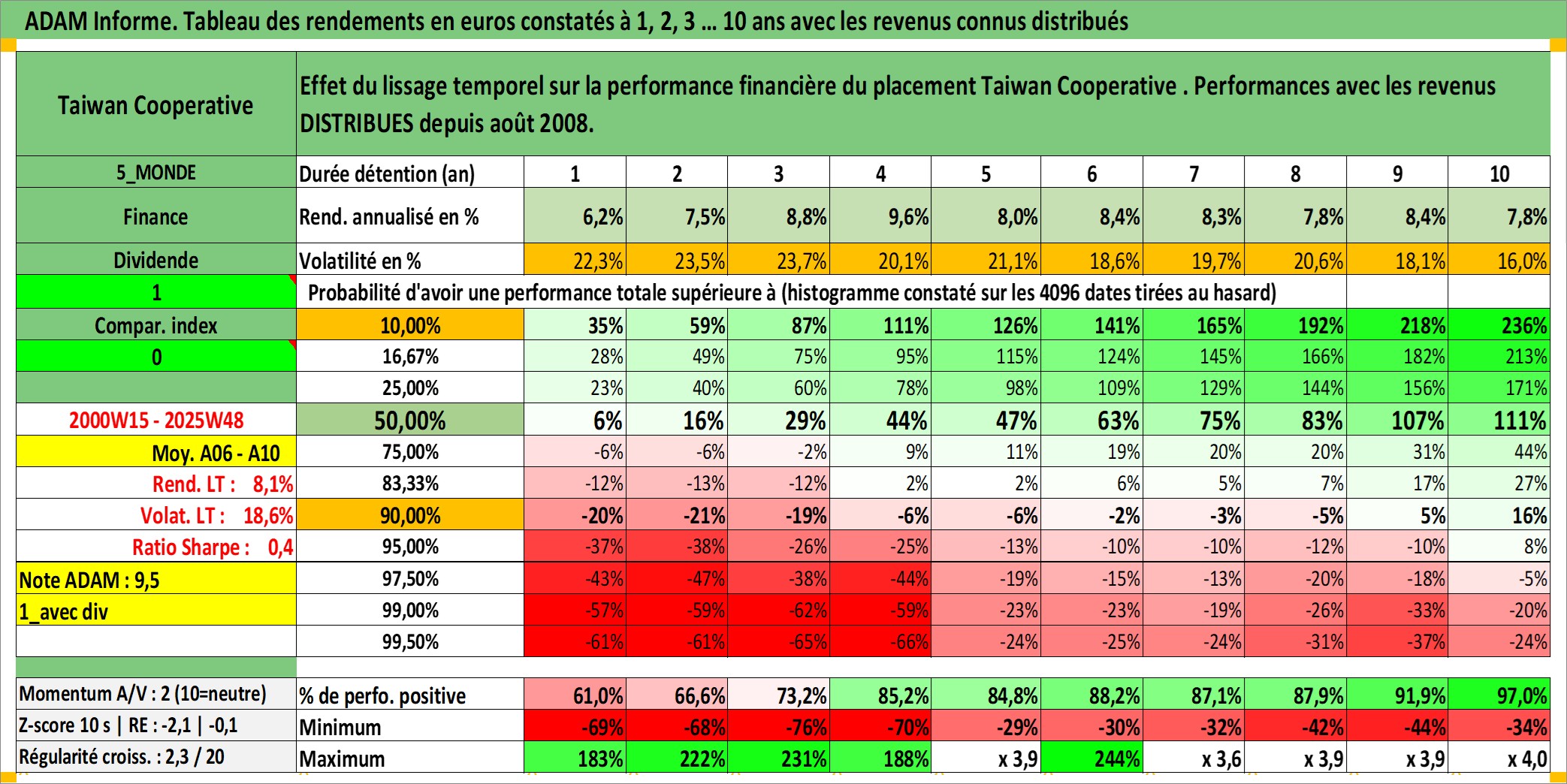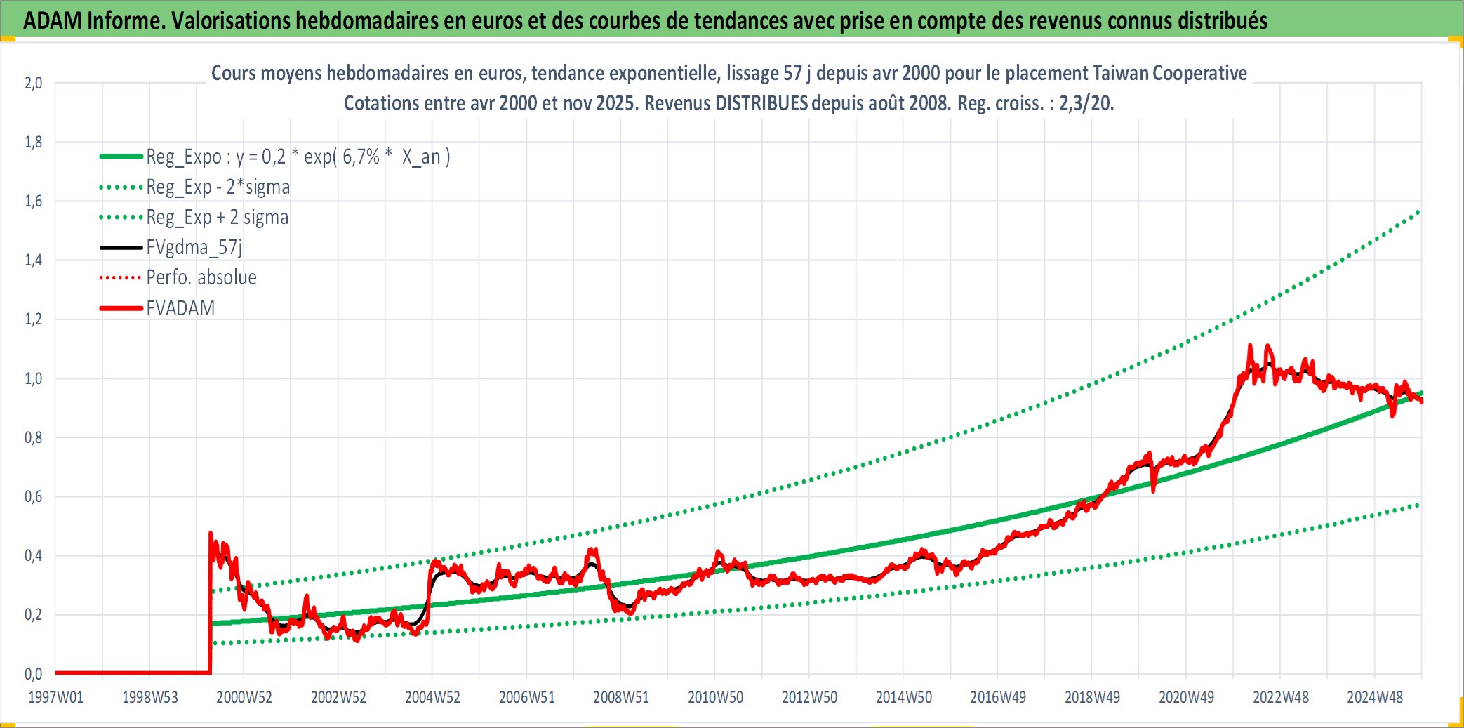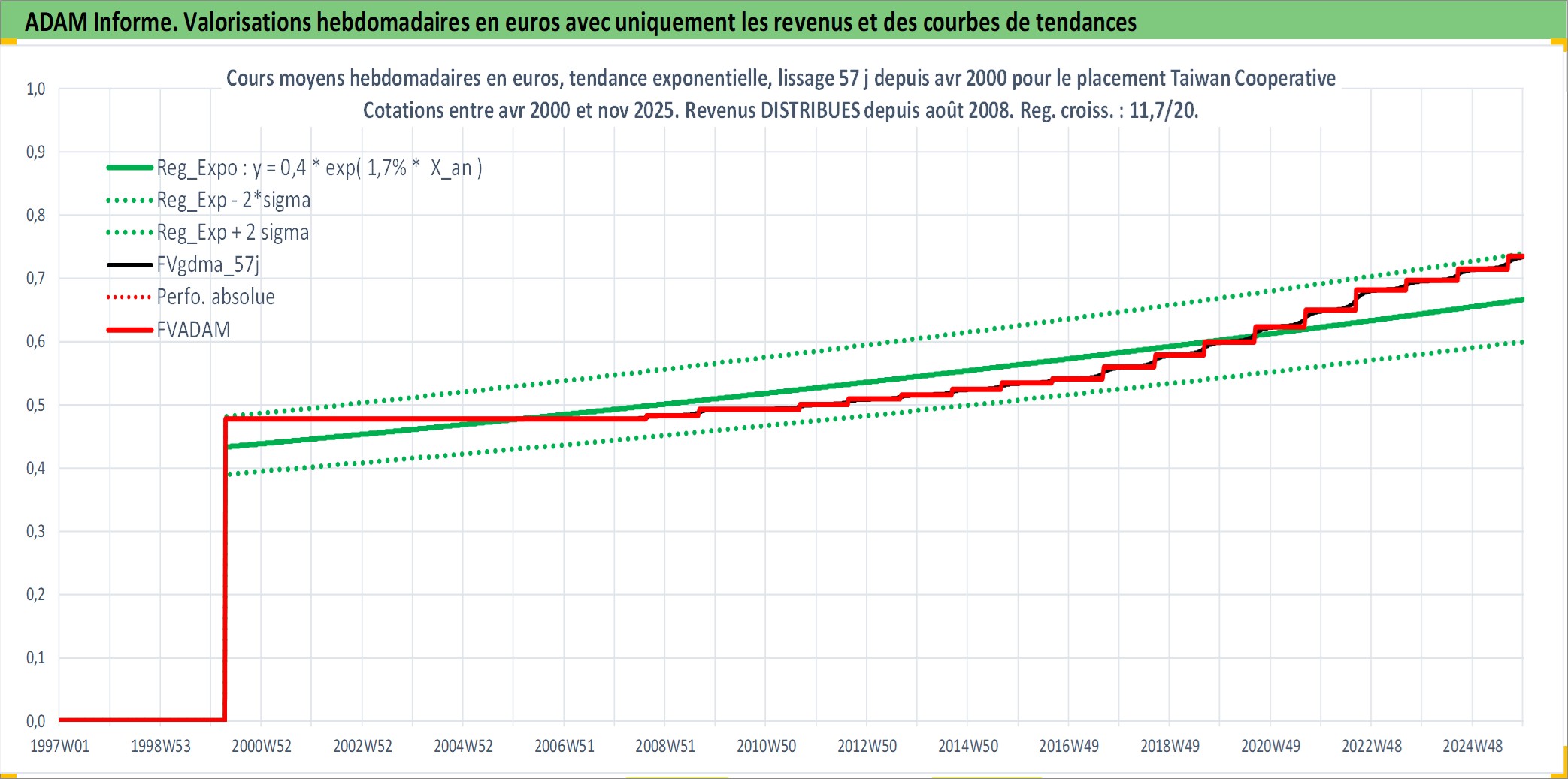 Site dédié aux investisseursPage dédiée sur site financeAnalyse des valorisations hebdomadaires de l'action Taiwan Cooperative . Cet actif est cote en TWD. Les valorisations sont en contrevaleur EURO et couvrent les semaines 2000W15 a 2025W48. Les revenus de cet actif financier sont pris en compte depuis la semaine 2008W32. La note globale ESG de cet actif est estimee a 7.0 (apres rebasage entre 0 et 20).