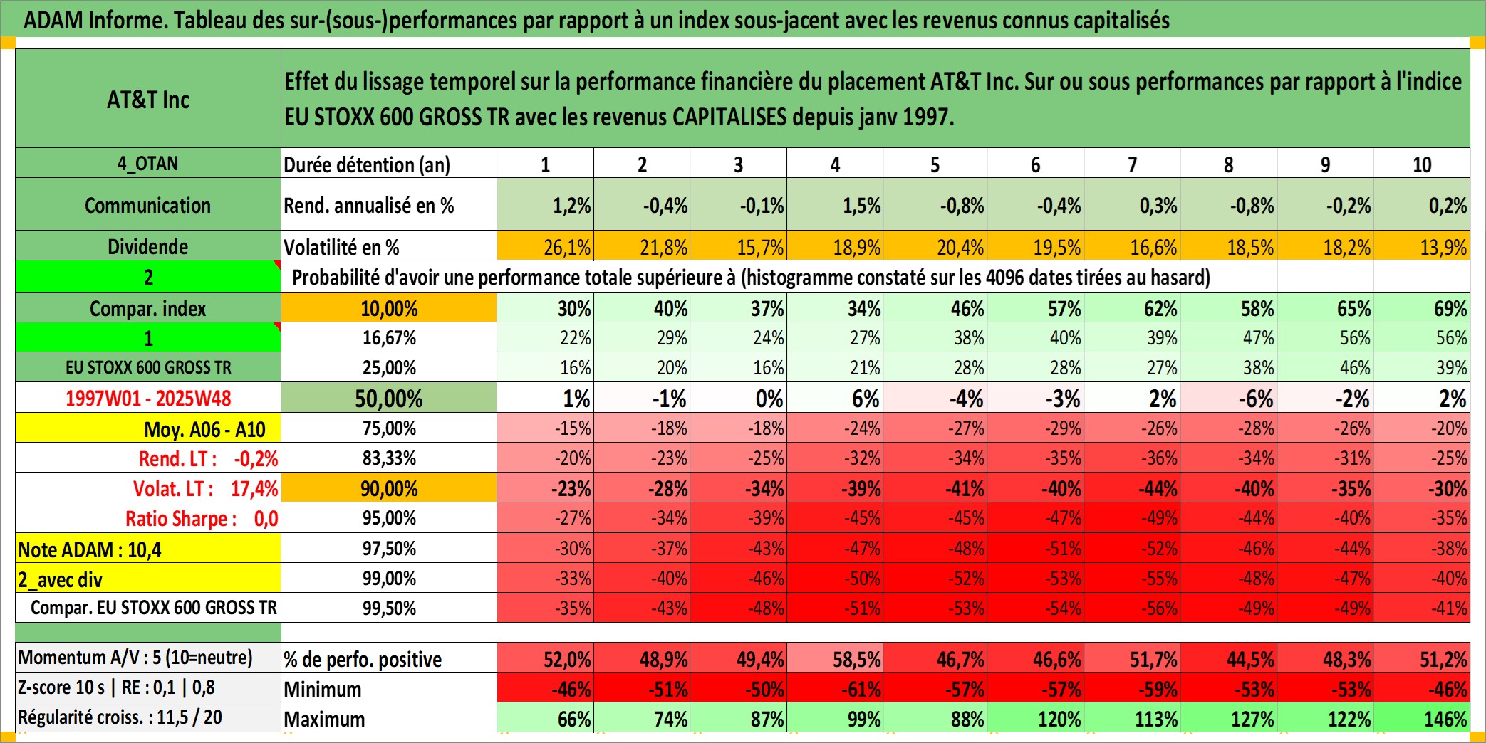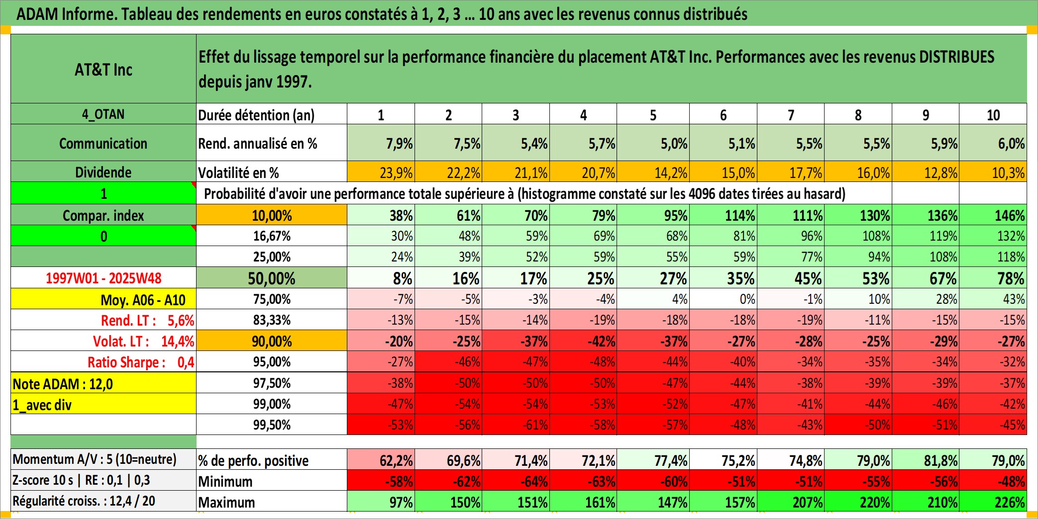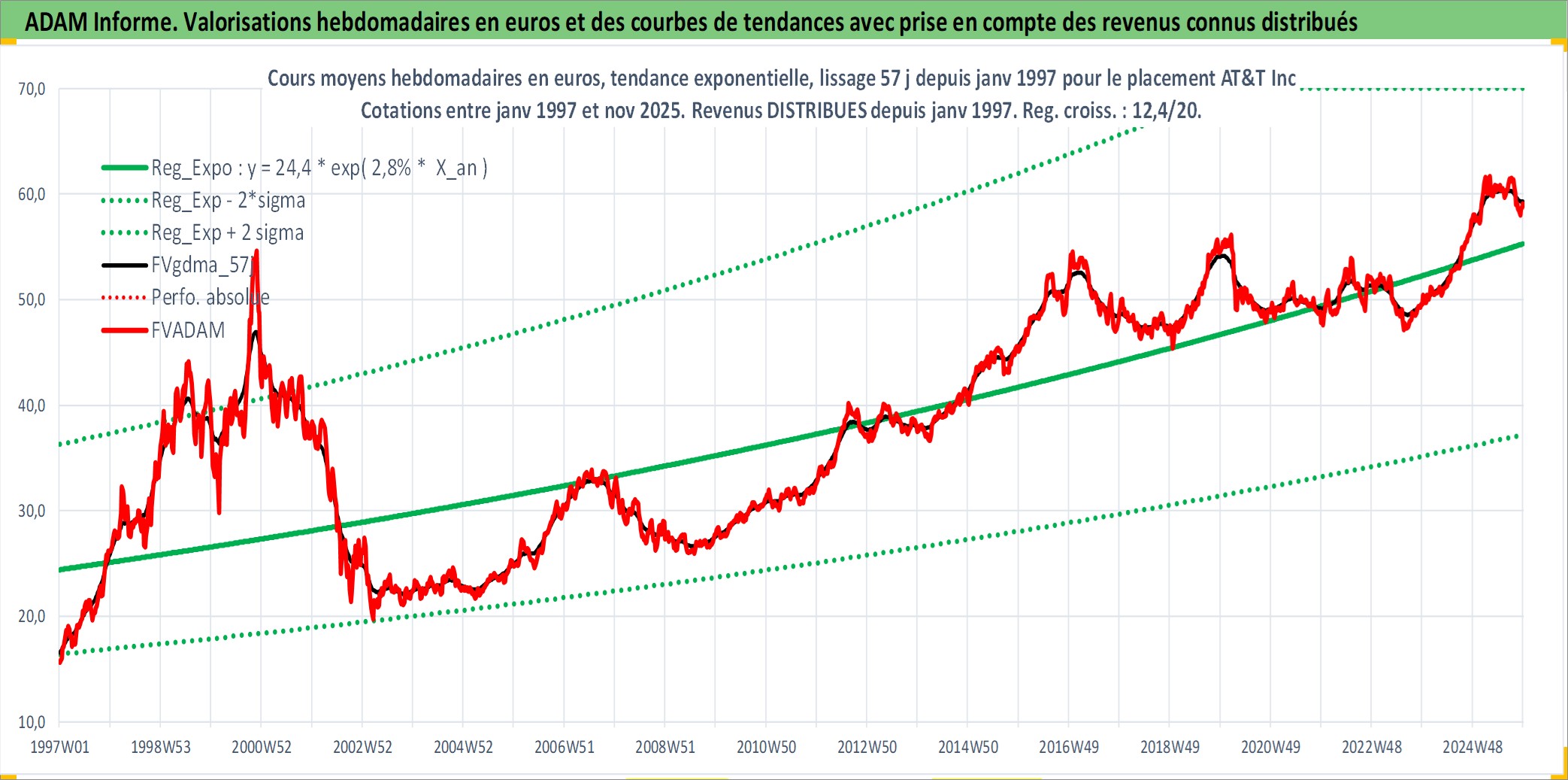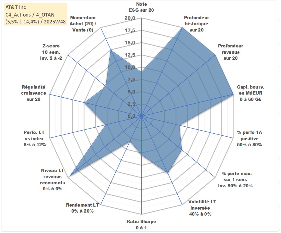 Site dédié aux investisseursPage dédiée sur site financeAnalyse des valorisations hebdomadaires de l'action AT&T Inc. Cet actif est cote en USD. Les valorisations sont en contrevaleur EURO et couvrent les semaines 1997W01 a 2025W48. Les revenus de cet actif financier sont pris en compte depuis la semaine 1997W02. La note globale ESG de cet actif est estimee a 9.0 (apres rebasage entre 0 et 20).