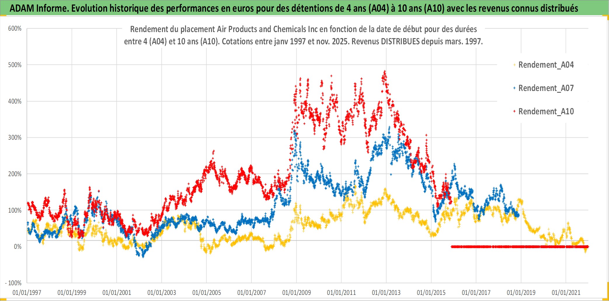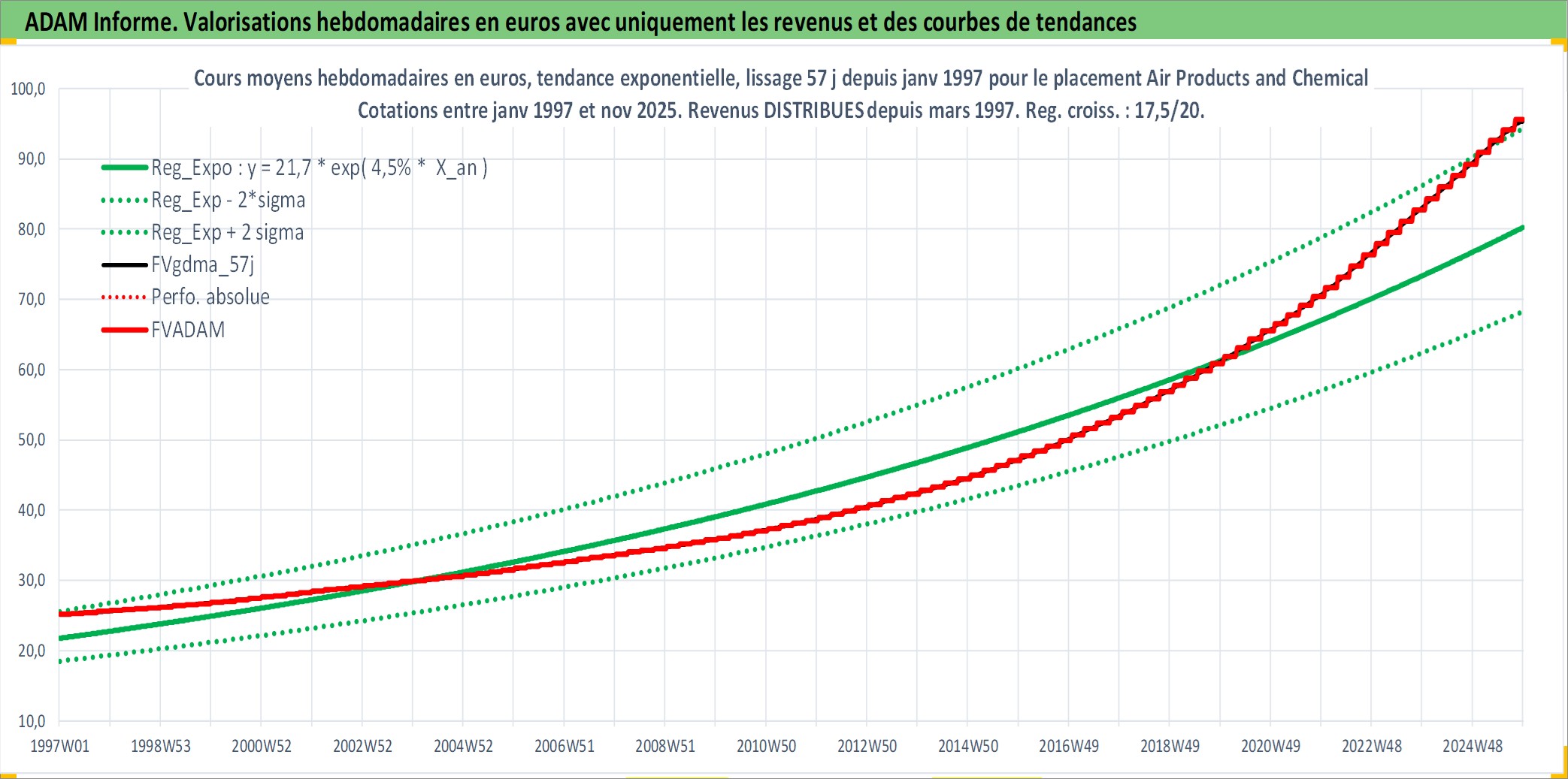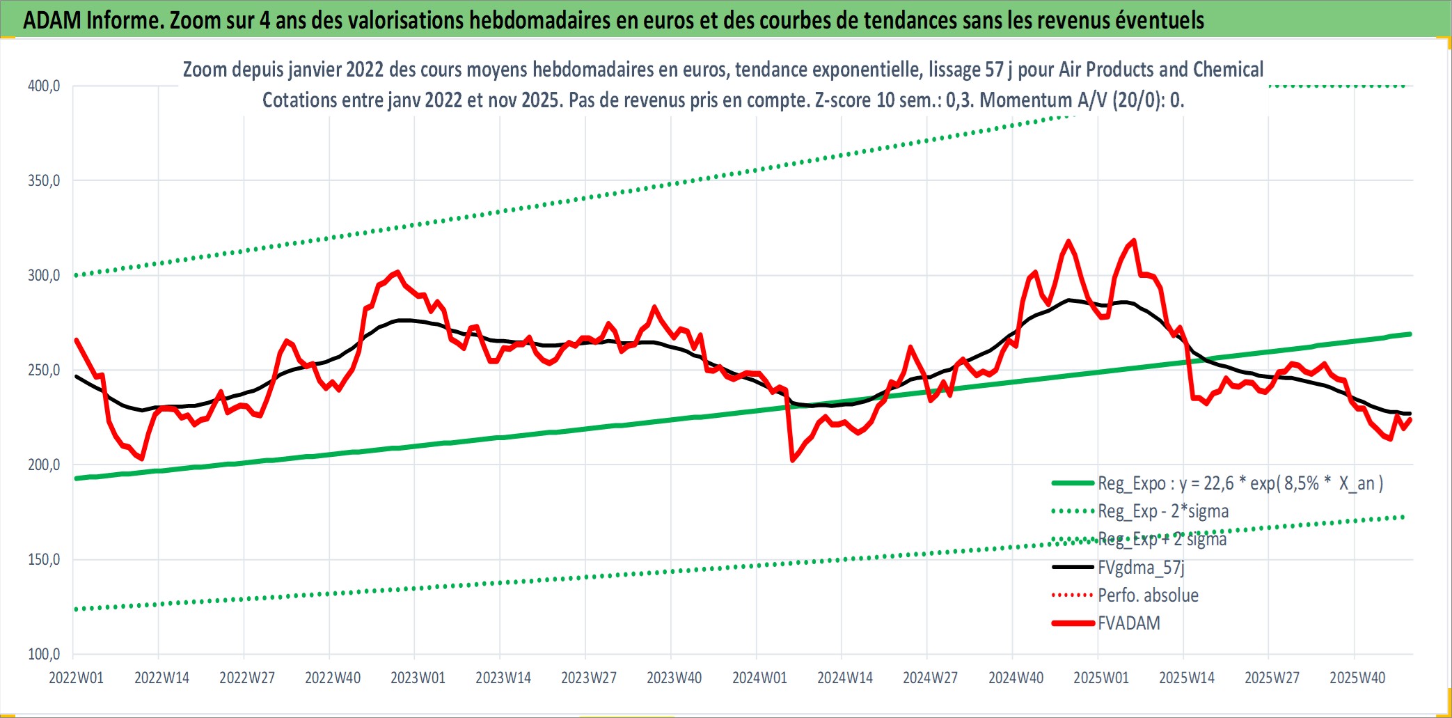 Site dédié aux investisseursPage dédiée sur site financeAnalyse des valorisations hebdomadaires de l'action Air Products and Chemicals Inc. Cet actif est cote en USD. Les valorisations sont en contrevaleur EURO et couvrent les semaines 1997W01 a 2025W48. Les revenus de cet actif financier sont pris en compte depuis la semaine 1997W13. La note globale ESG de cet actif est estimee a 16.0 (apres rebasage entre 0 et 20).