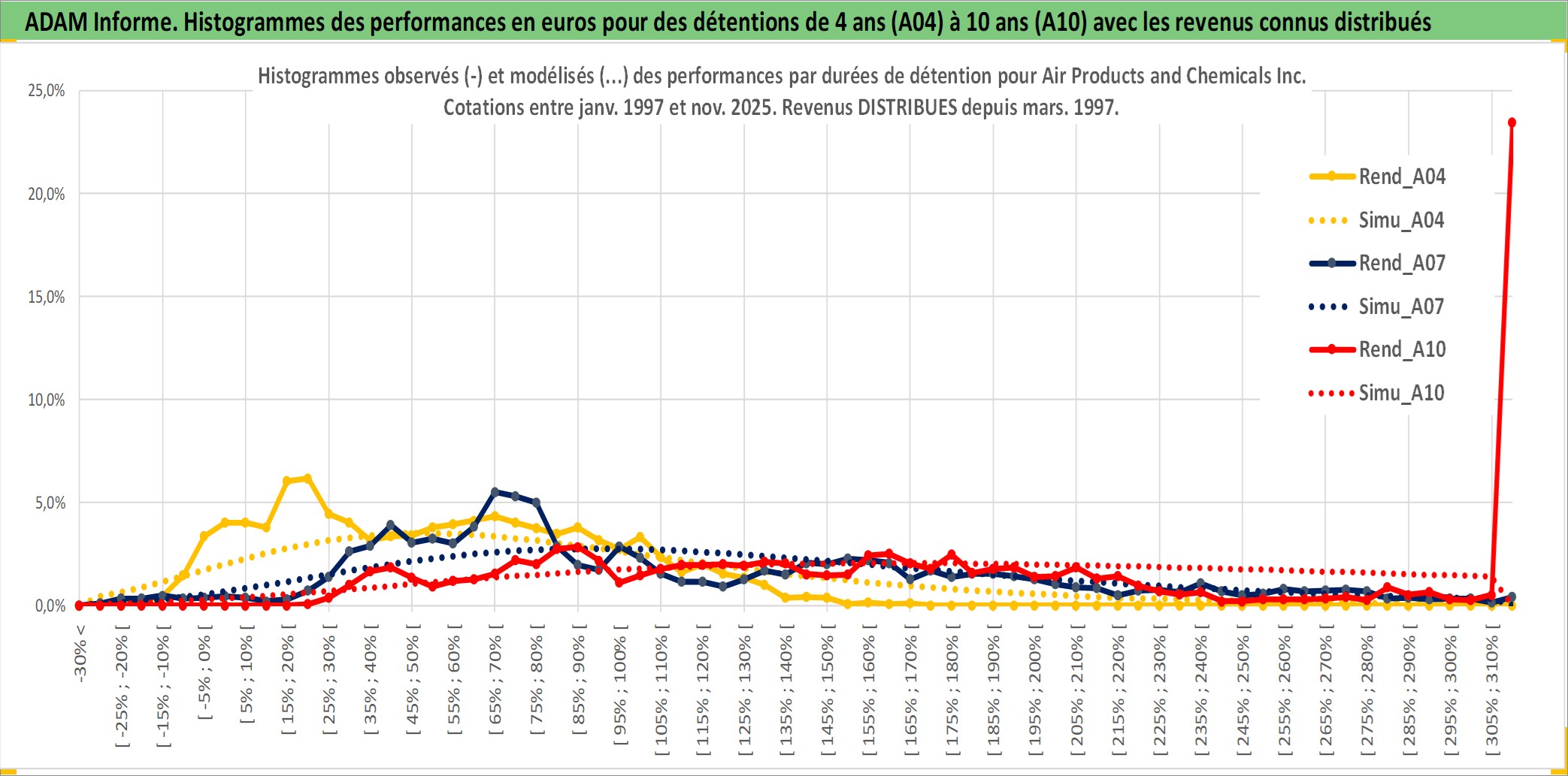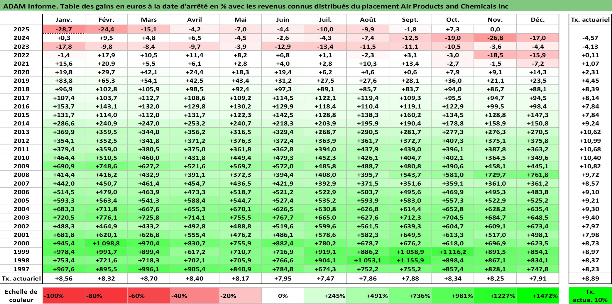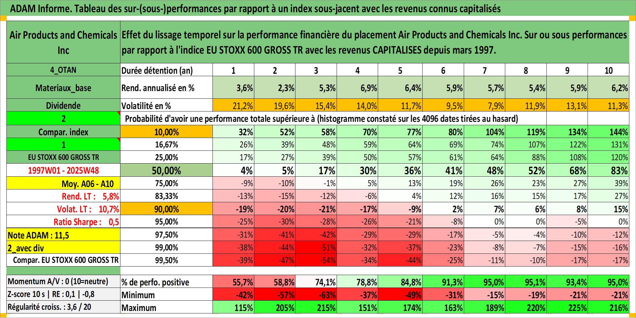 Site dédié aux investisseursPage dédiée sur site financeAnalyse des valorisations hebdomadaires de l'action Air Products and Chemicals Inc. Cet actif est cote en USD. Les valorisations sont en contrevaleur EURO et couvrent les semaines 1997W01 a 2025W48. Les revenus de cet actif financier sont pris en compte depuis la semaine 1997W13. La note globale ESG de cet actif est estimee a 16.0 (apres rebasage entre 0 et 20).