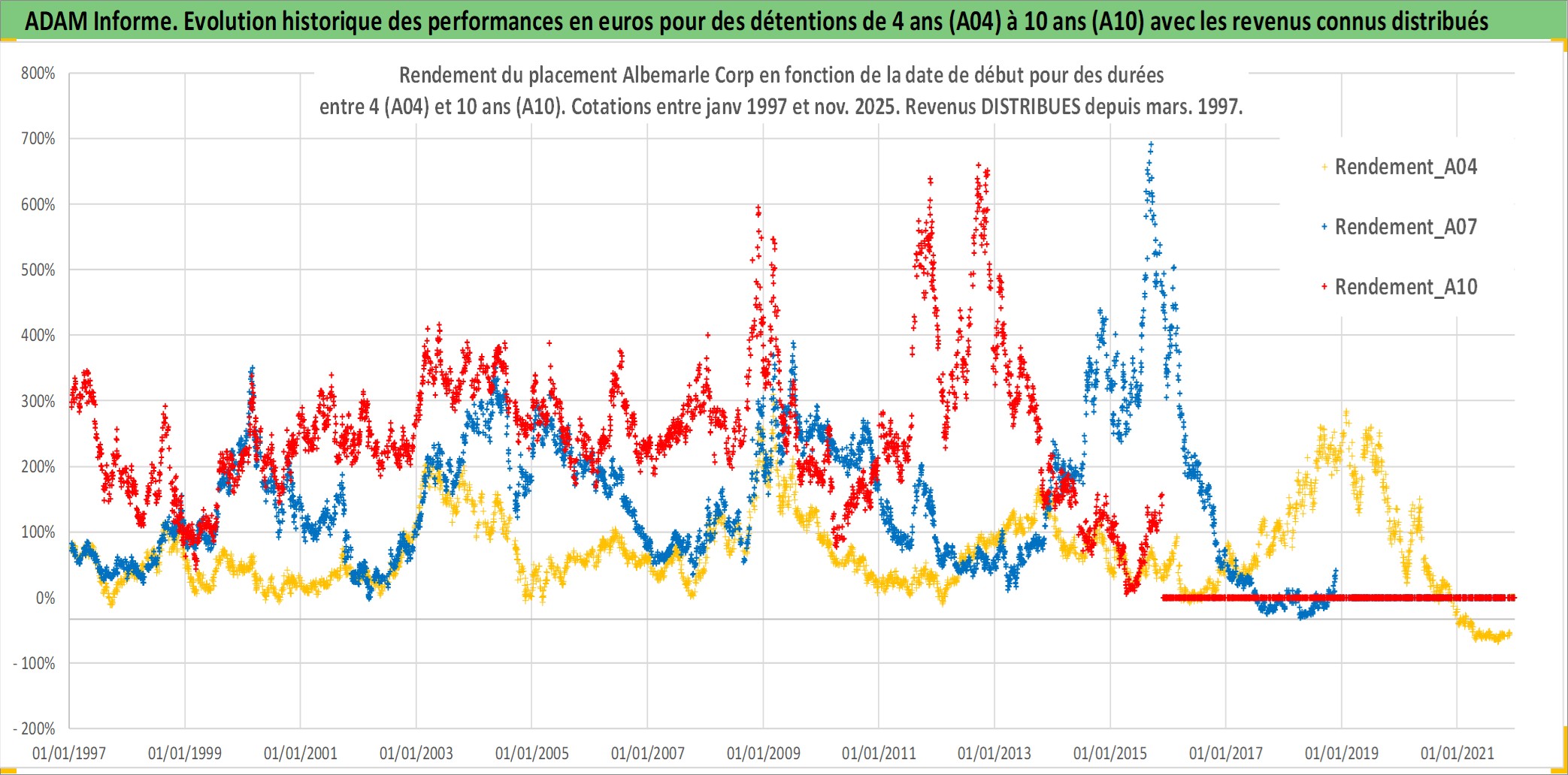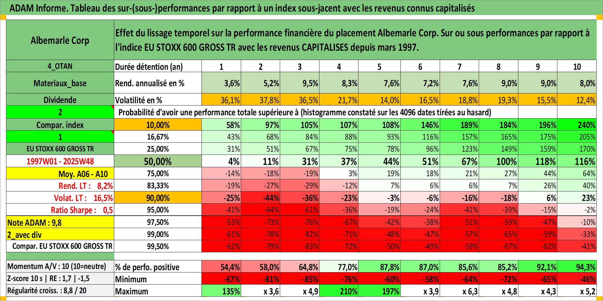 Site dédié aux investisseursPage dédiée sur site financeAnalyse des valorisations hebdomadaires de l'action Albemarle Corp. Cet actif est cote en USD. Les valorisations sont en contrevaleur EURO et couvrent les semaines 1997W01 a 2025W48. Les revenus de cet actif financier sont pris en compte depuis la semaine 1997W10. La note globale ESG de cet actif est estimee a 6.0 (apres rebasage entre 0 et 20).