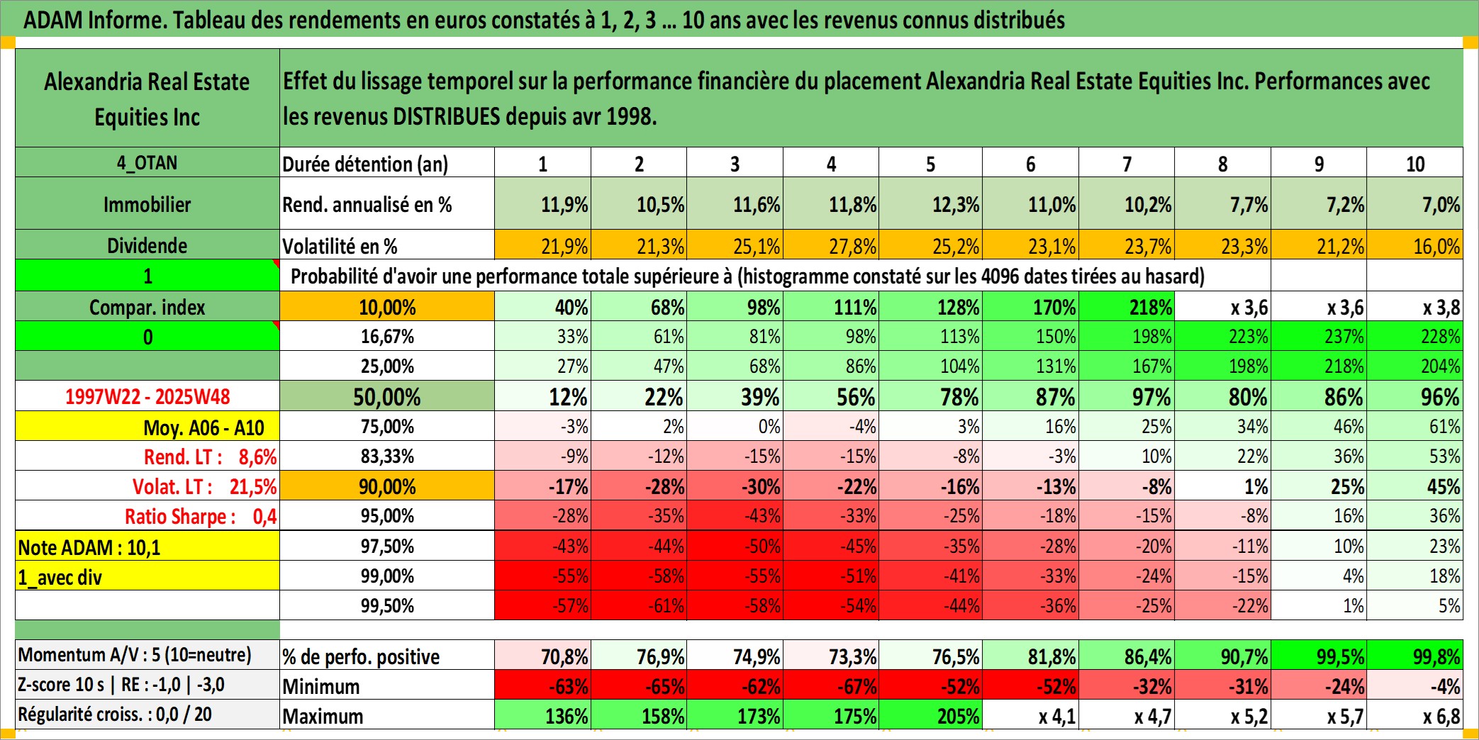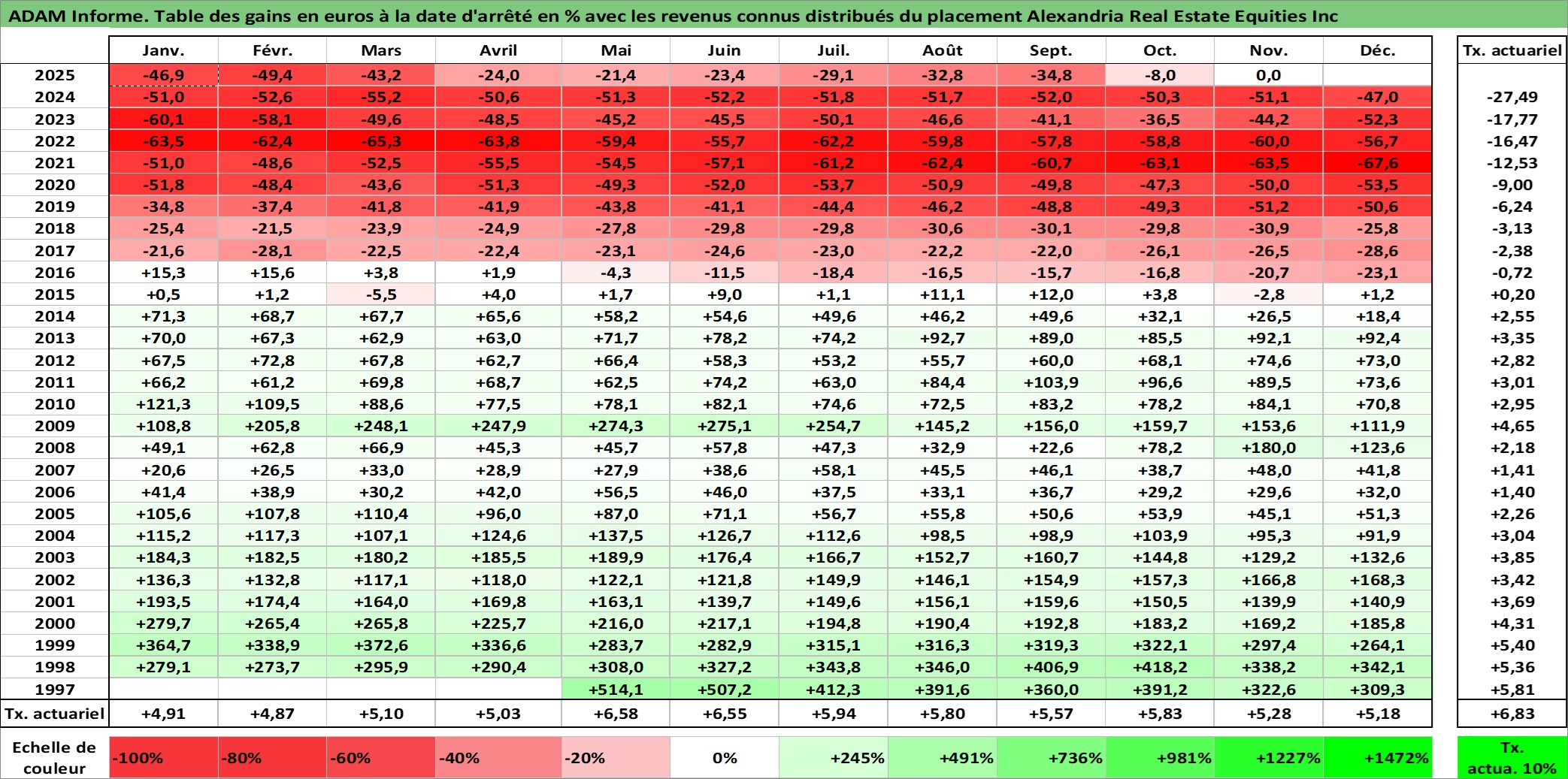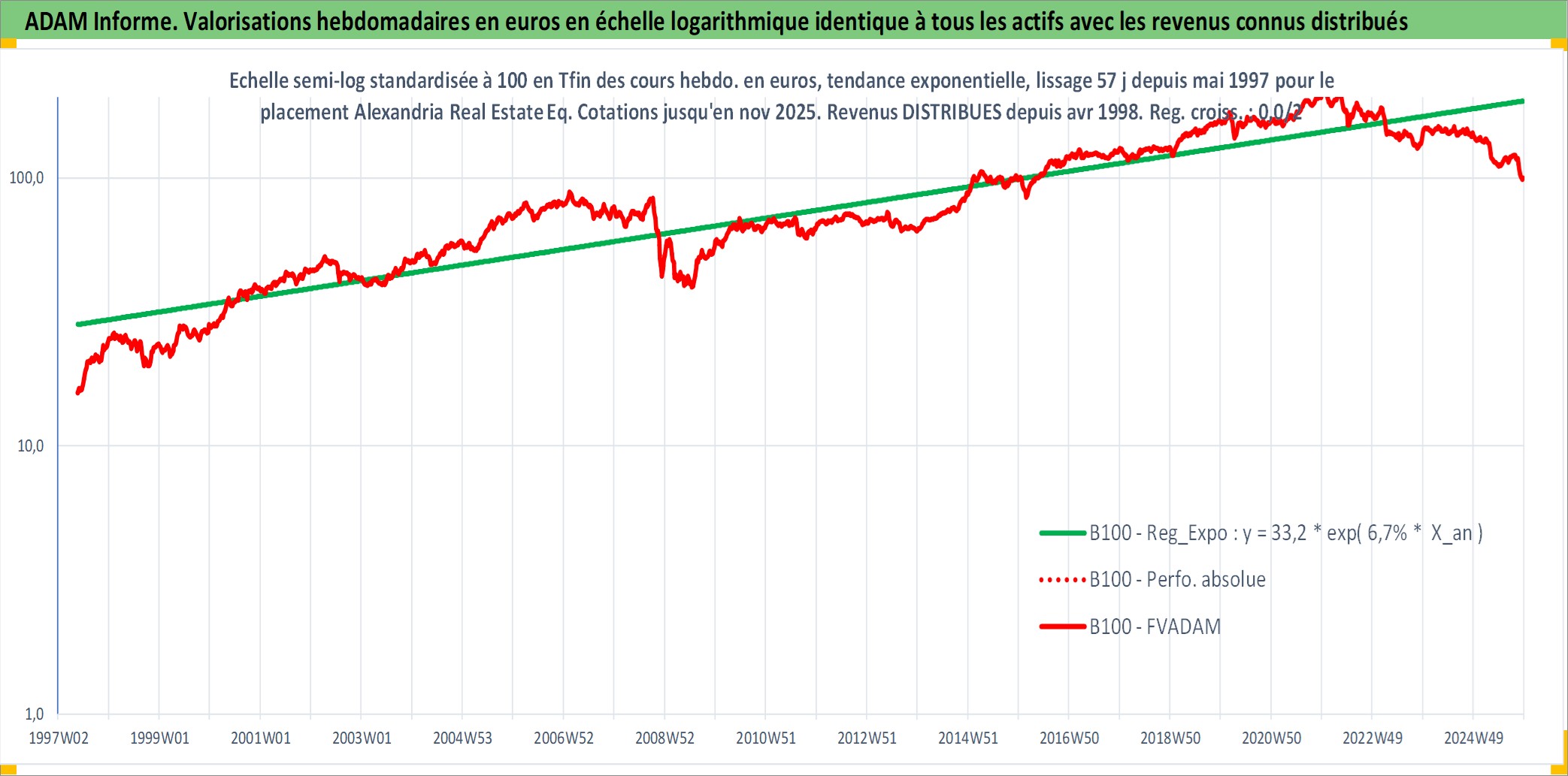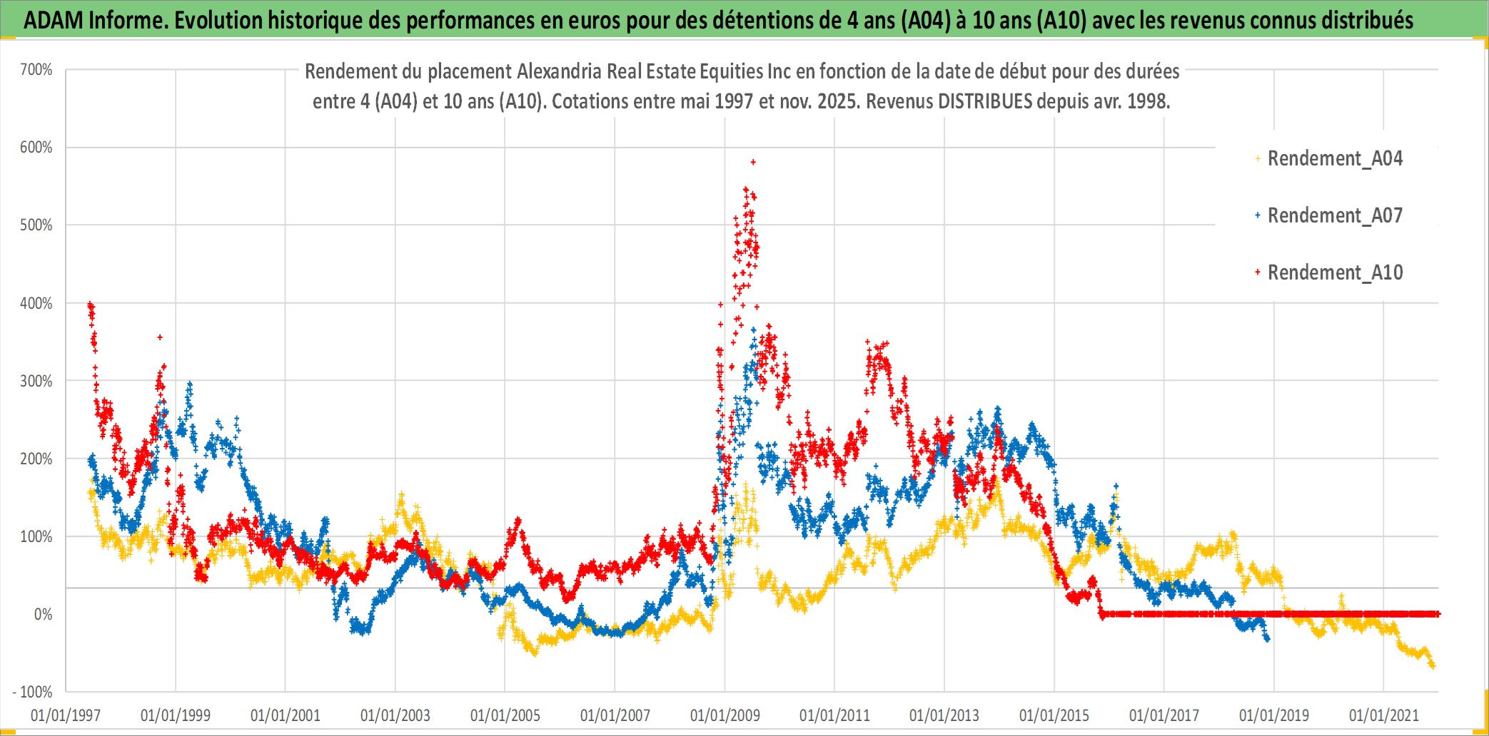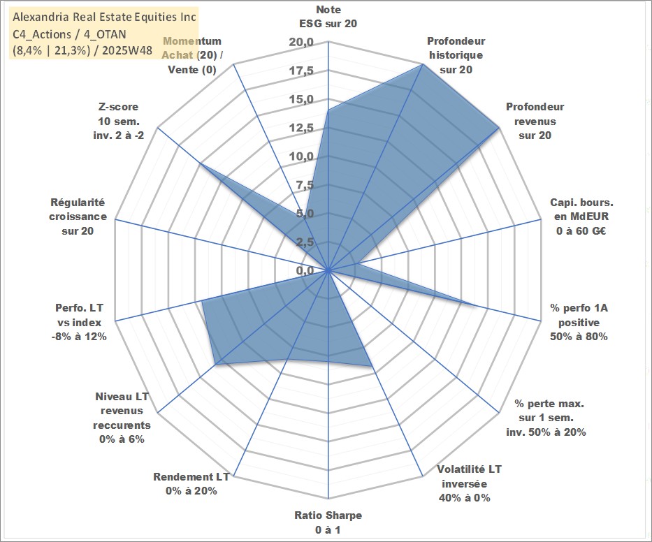 Site dédié aux investisseursPage dédiée sur site financeAnalyse des valorisations hebdomadaires de l'action Alexandria Real Estate Equities Inc. Cet actif est cote en USD. Les valorisations sont en contrevaleur EURO et couvrent les semaines 1997W22 a 2025W48. Les revenus de cet actif financier sont pris en compte depuis la semaine 1998W14. La note globale ESG de cet actif est estimee a 14.0 (apres rebasage entre 0 et 20).