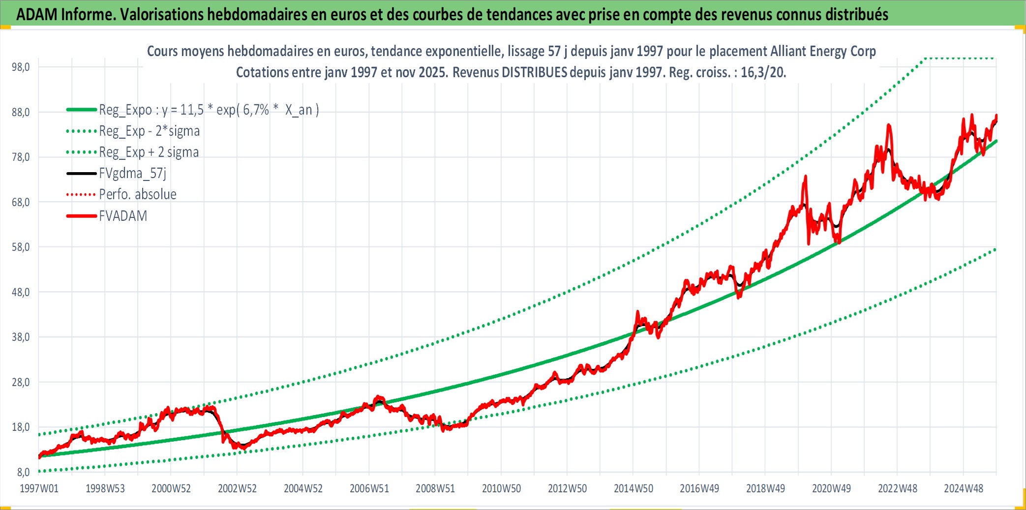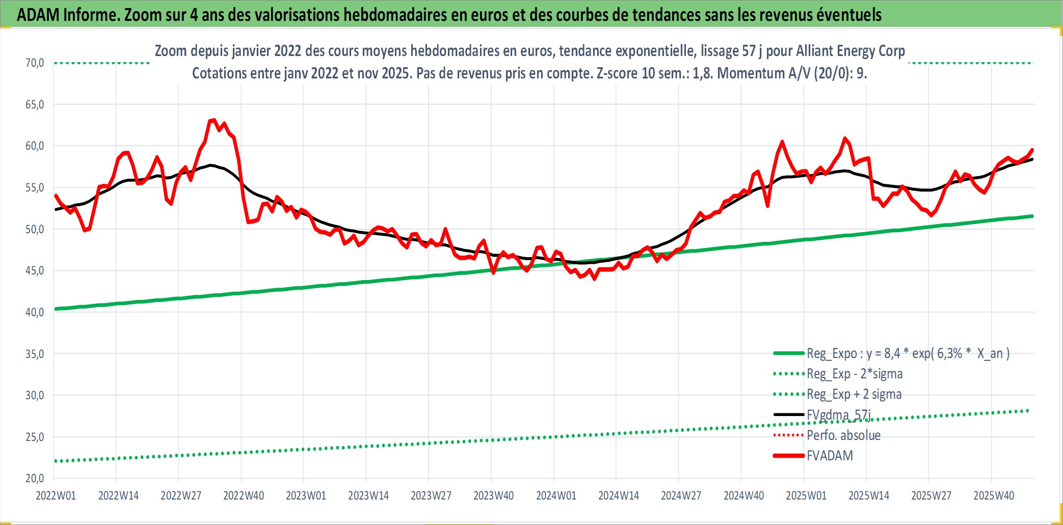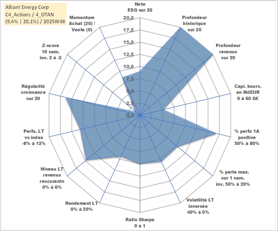 Site dédié aux investisseursPage dédiée sur site financeAnalyse des valorisations hebdomadaires de l'action Alliant Energy Corp. Cet actif est cote en USD. Les valorisations sont en contrevaleur EURO et couvrent les semaines 1997W01 a 2025W48. Les revenus de cet actif financier sont pris en compte depuis la semaine 1997W05. La note globale ESG de cet actif est estimee a 9.0 (apres rebasage entre 0 et 20).