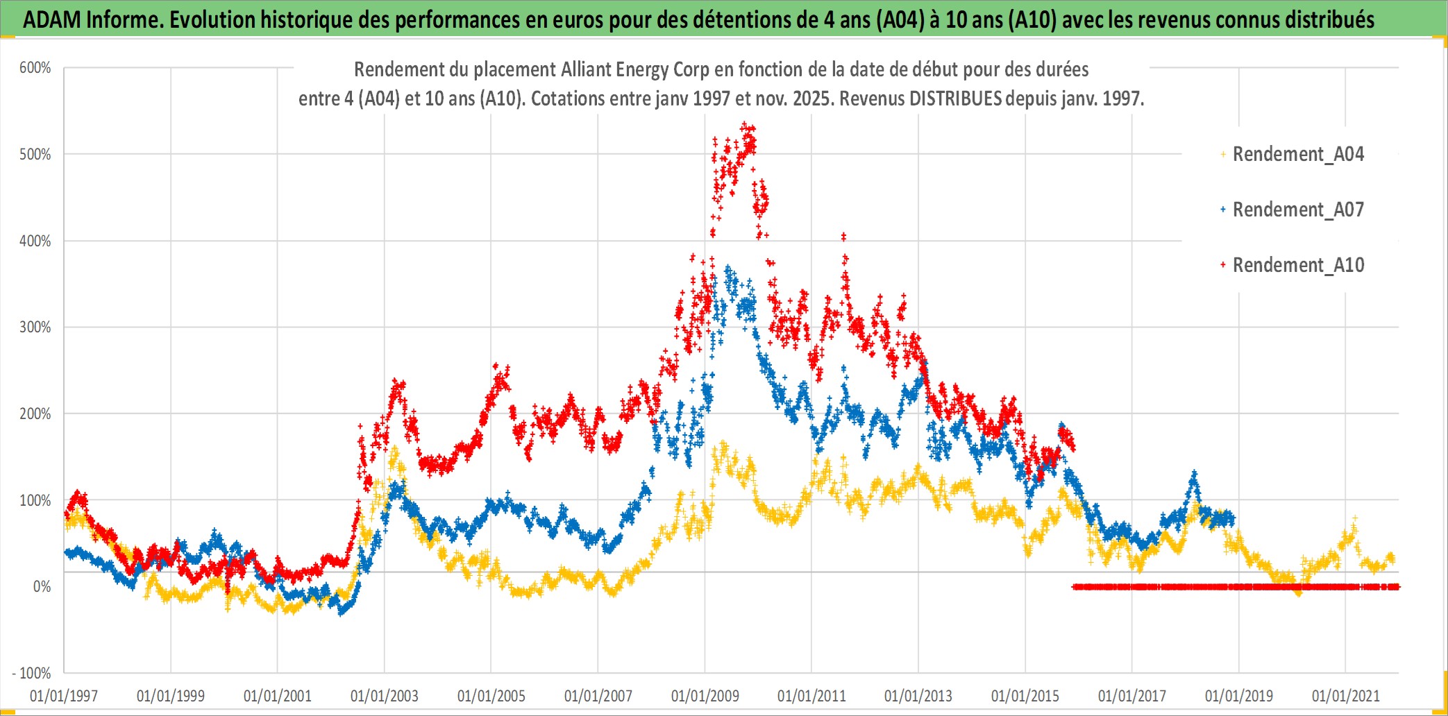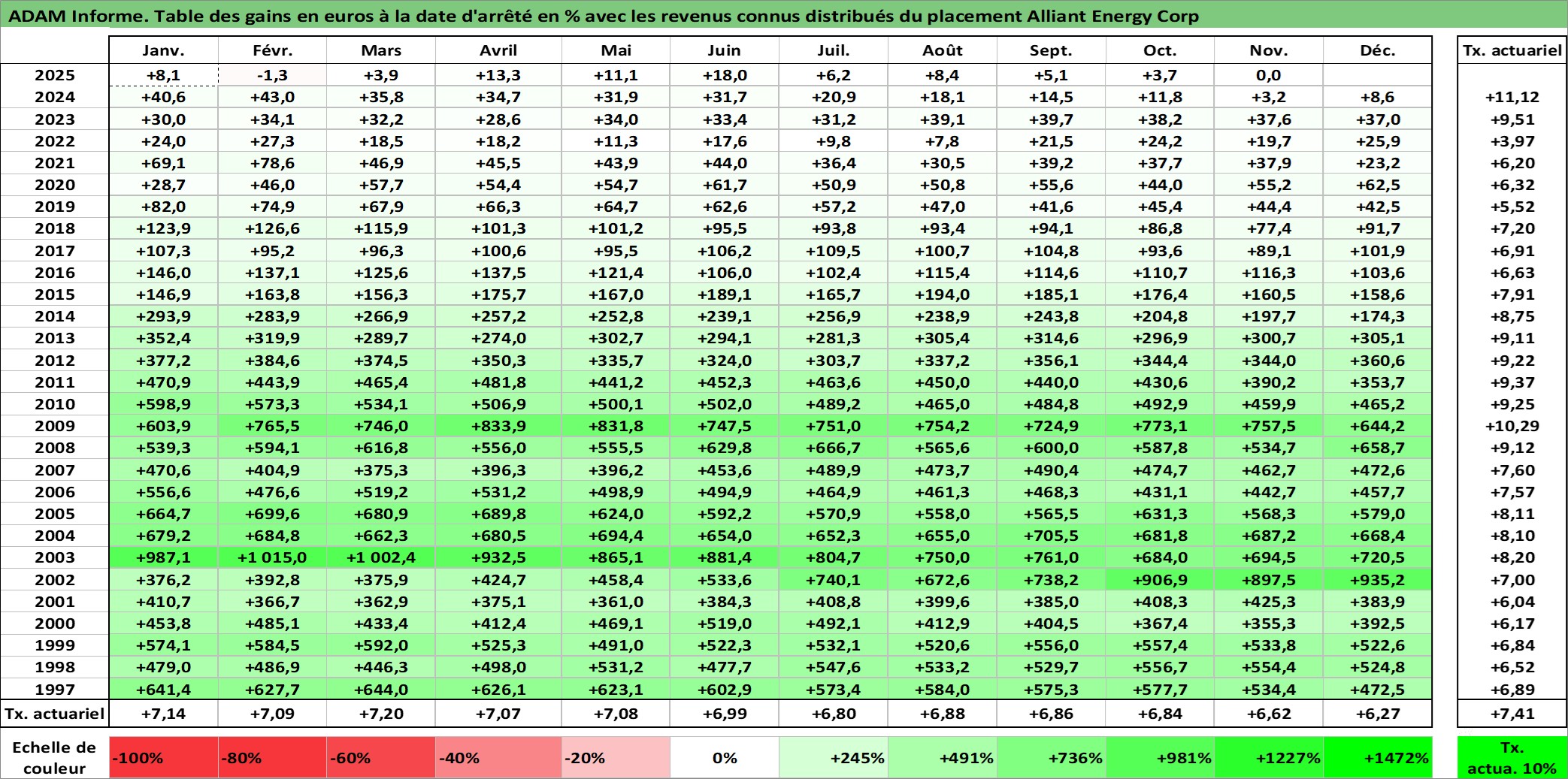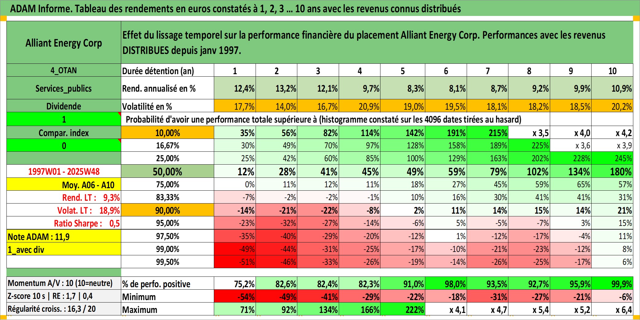 Site dédié aux investisseursPage dédiée sur site financeAnalyse des valorisations hebdomadaires de l'action Alliant Energy Corp. Cet actif est cote en USD. Les valorisations sont en contrevaleur EURO et couvrent les semaines 1997W01 a 2025W48. Les revenus de cet actif financier sont pris en compte depuis la semaine 1997W05. La note globale ESG de cet actif est estimee a 9.0 (apres rebasage entre 0 et 20).