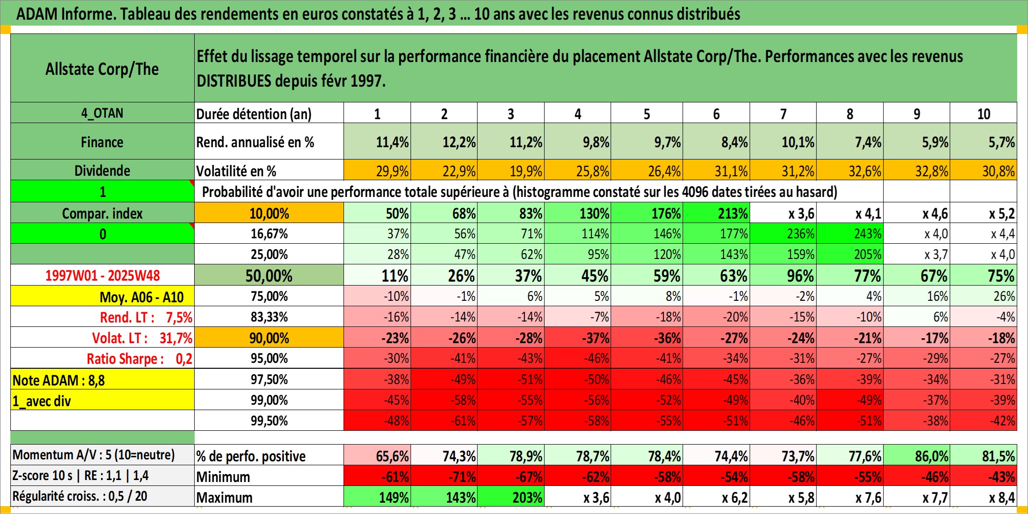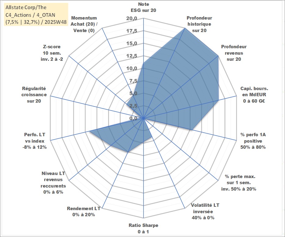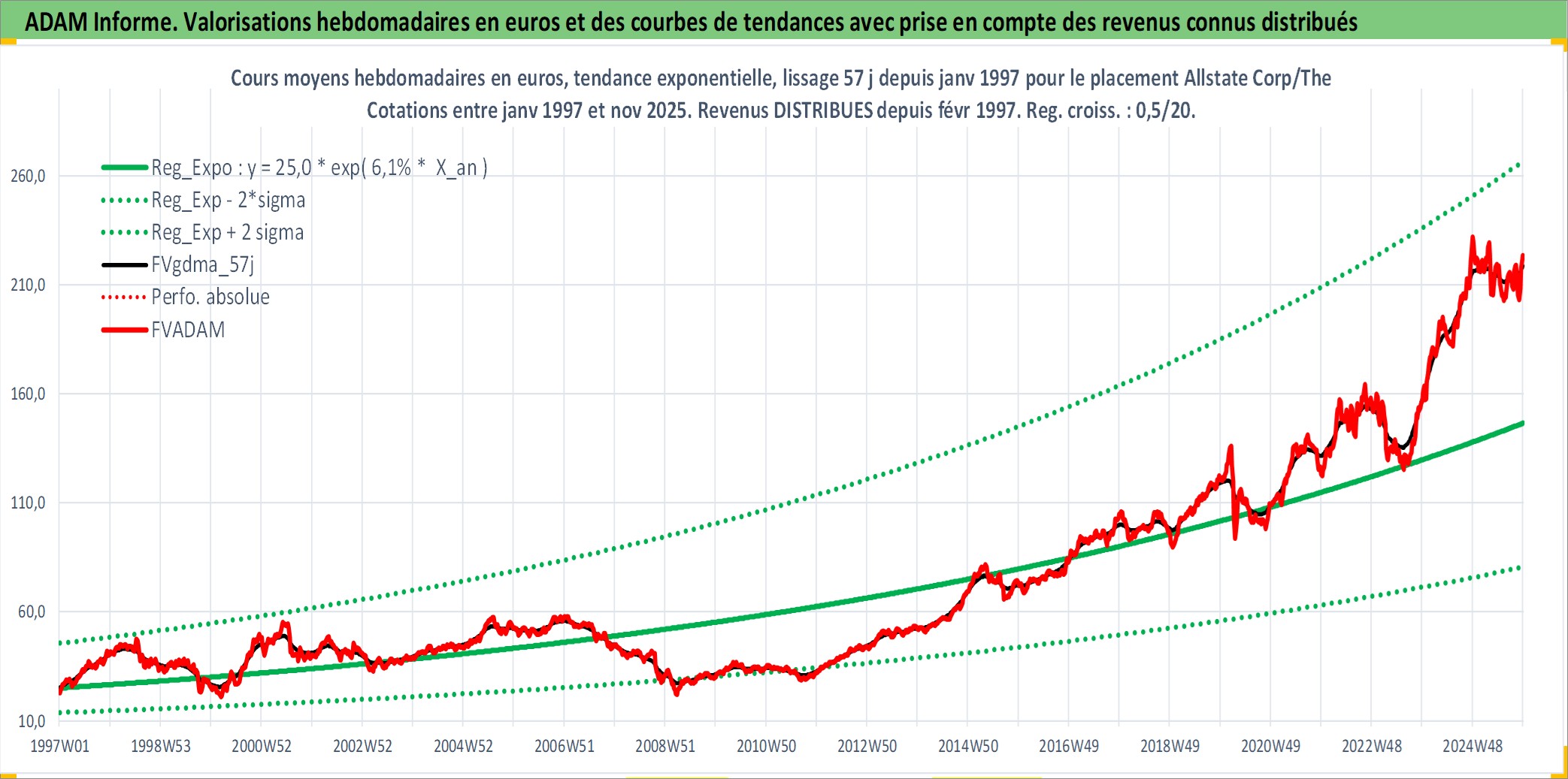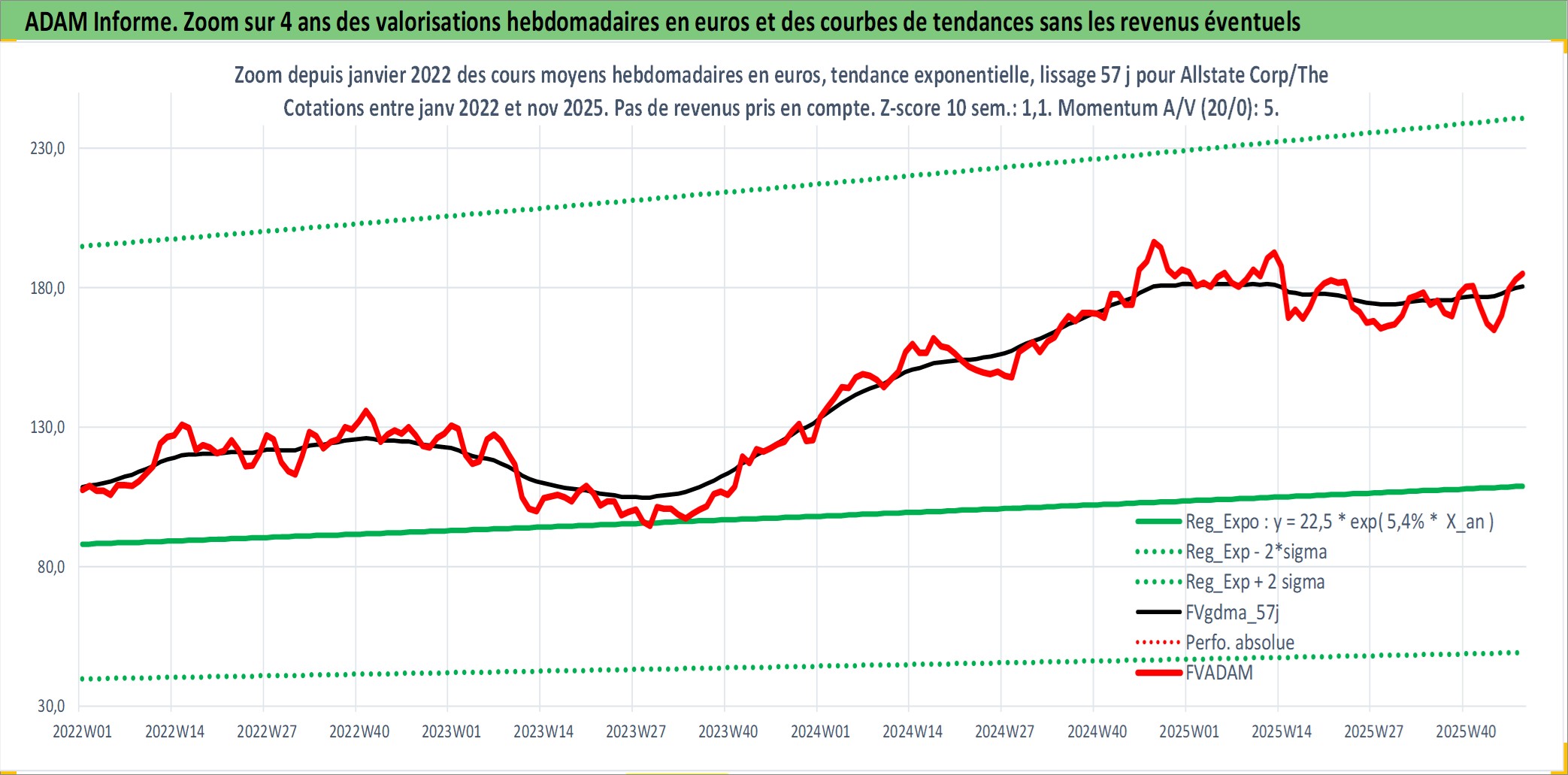 Site dédié aux investisseursPage dédiée sur site financeAnalyse des valorisations hebdomadaires de l'action Allstate Corp/The. Cet actif est cote en USD. Les valorisations sont en contrevaleur EURO et couvrent les semaines 1997W01 a 2025W48. Les revenus de cet actif financier sont pris en compte depuis la semaine 1997W09. La note globale ESG de cet actif est estimee a 11.0 (apres rebasage entre 0 et 20).