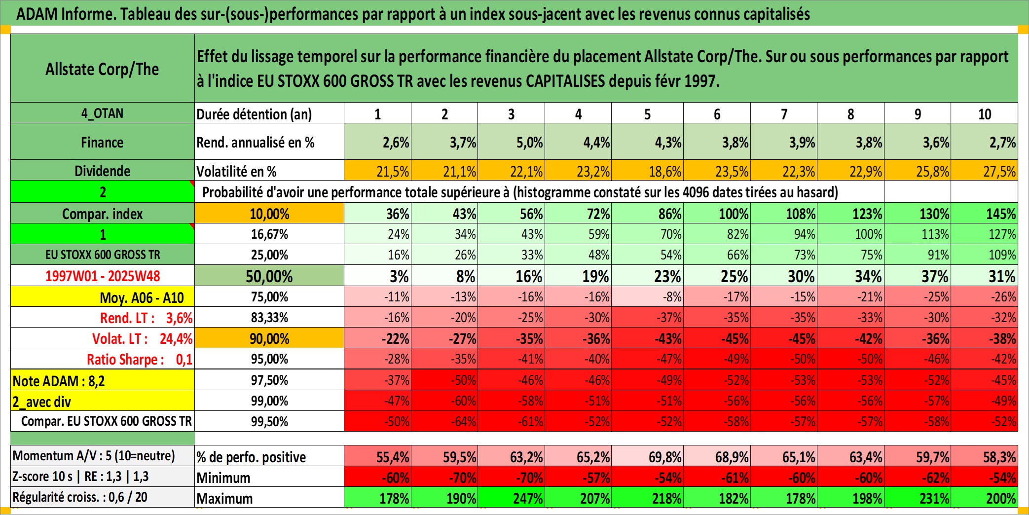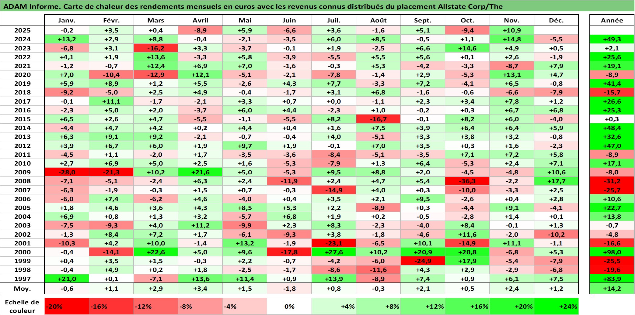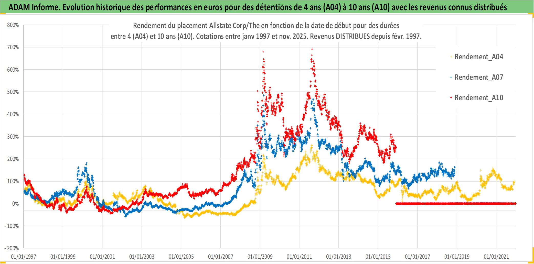 Site dédié aux investisseursPage dédiée sur site financeAnalyse des valorisations hebdomadaires de l'action Allstate Corp/The. Cet actif est cote en USD. Les valorisations sont en contrevaleur EURO et couvrent les semaines 1997W01 a 2025W48. Les revenus de cet actif financier sont pris en compte depuis la semaine 1997W09. La note globale ESG de cet actif est estimee a 11.0 (apres rebasage entre 0 et 20).