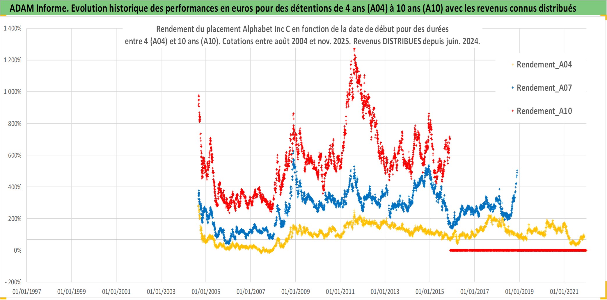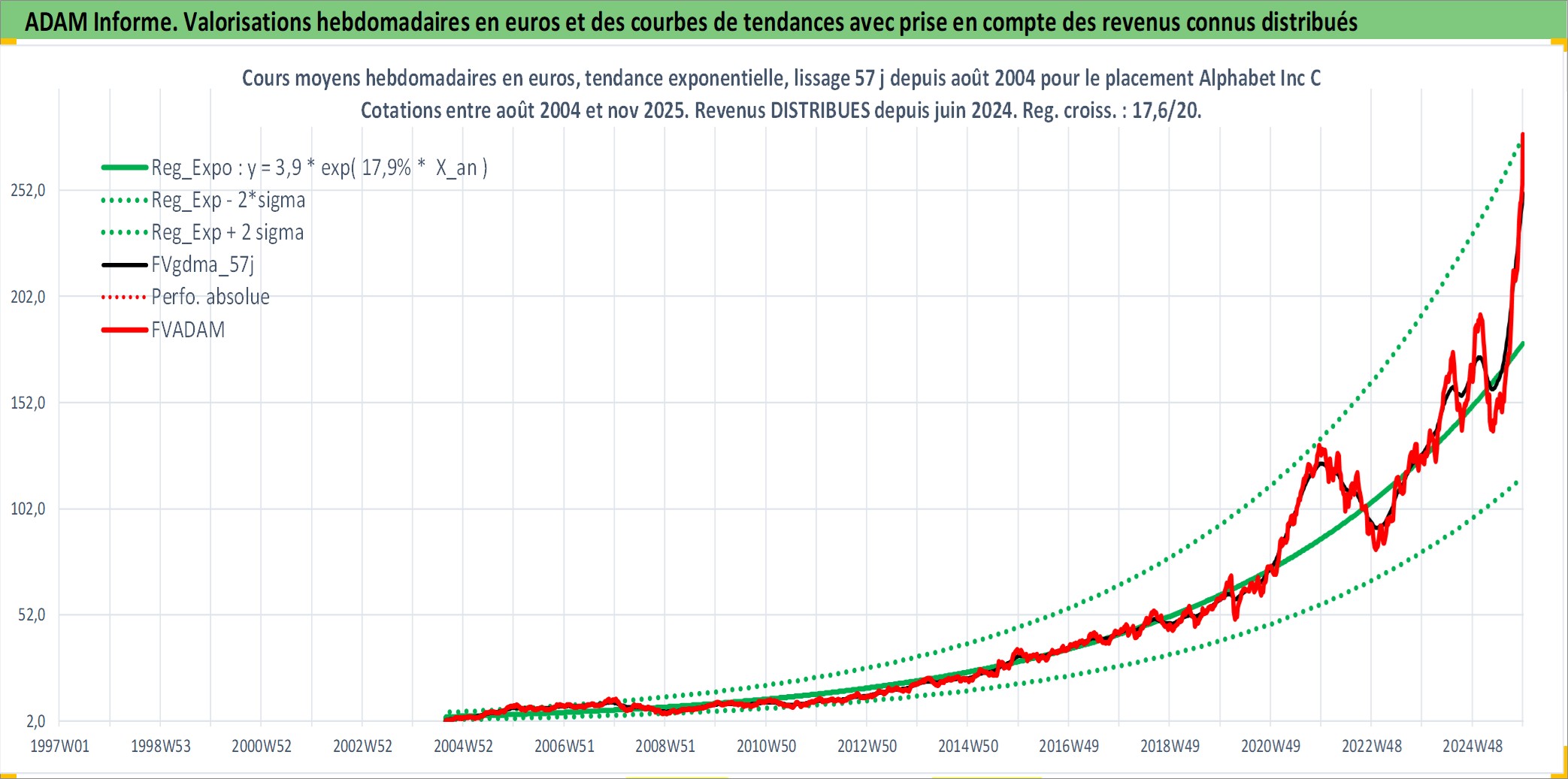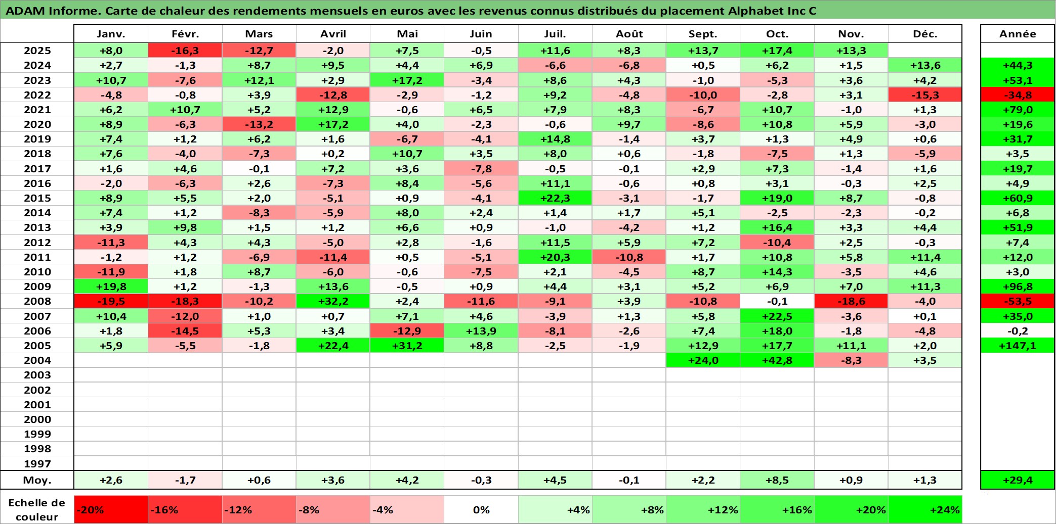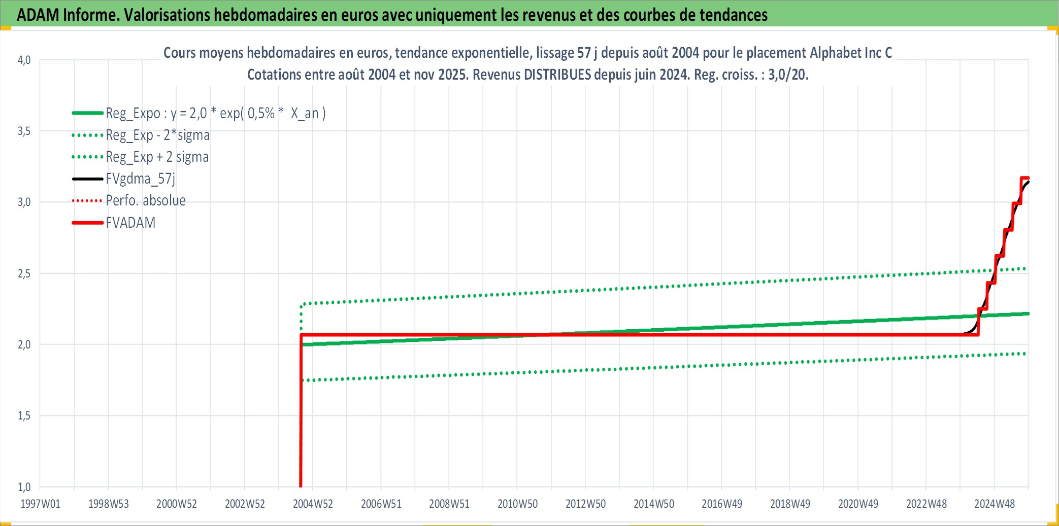 Site dédié aux investisseursPage dédiée sur site financeAnalyse des valorisations hebdomadaires de l'action Alphabet Inc C. Cet actif est cote en USD. Les valorisations sont en contrevaleur EURO et couvrent les semaines 2004W34 a 2025W48. Les revenus de cet actif financier sont pris en compte depuis la semaine 2024W24. La note ESG de cet actif n'est pas connue.